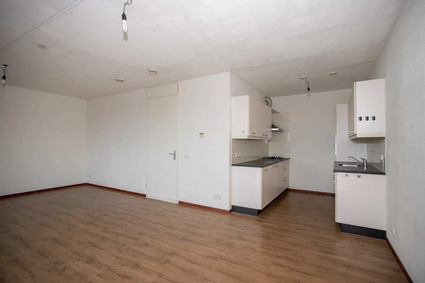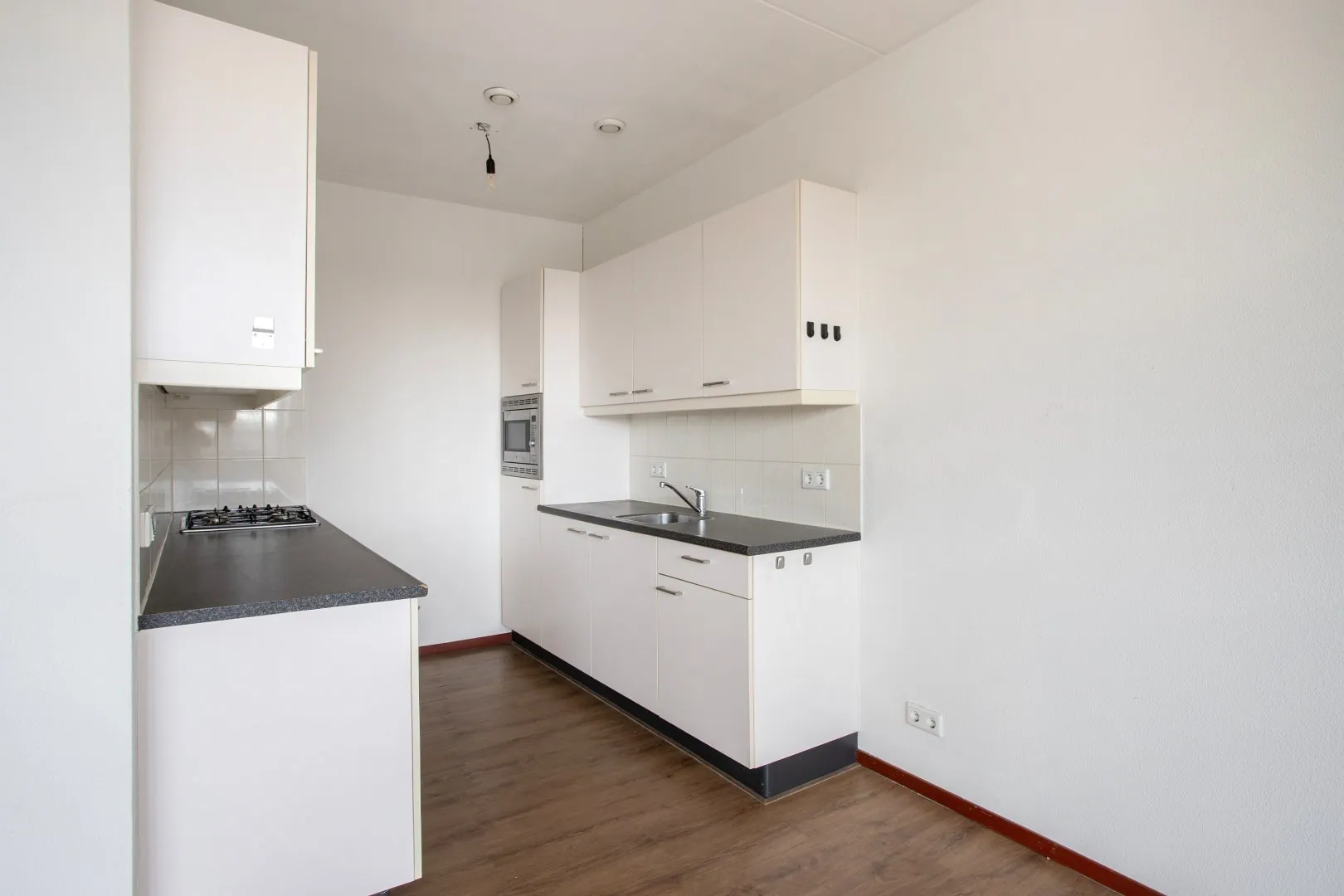 Woonkamer: ruime woonkamer met veel natuurlijke lichtinval, open keuken met dubbele wandopstelling met gaskookplaat, afzuigkap, koelkast, combi magnetron en diverse onder- en bovenkasten.
