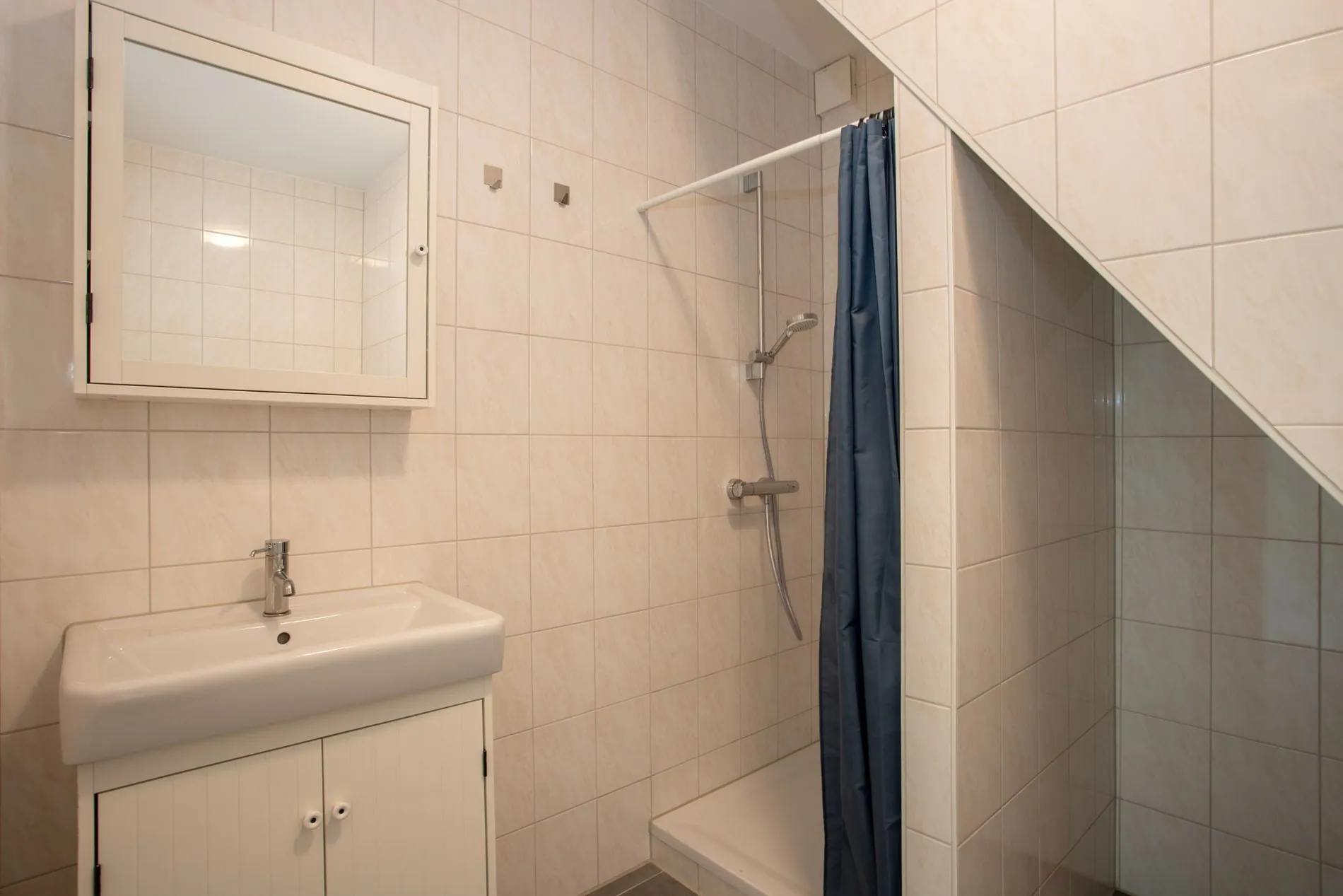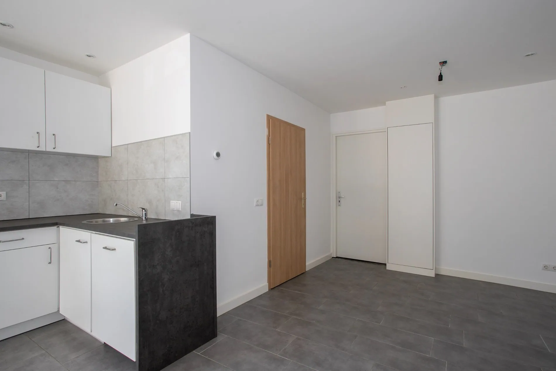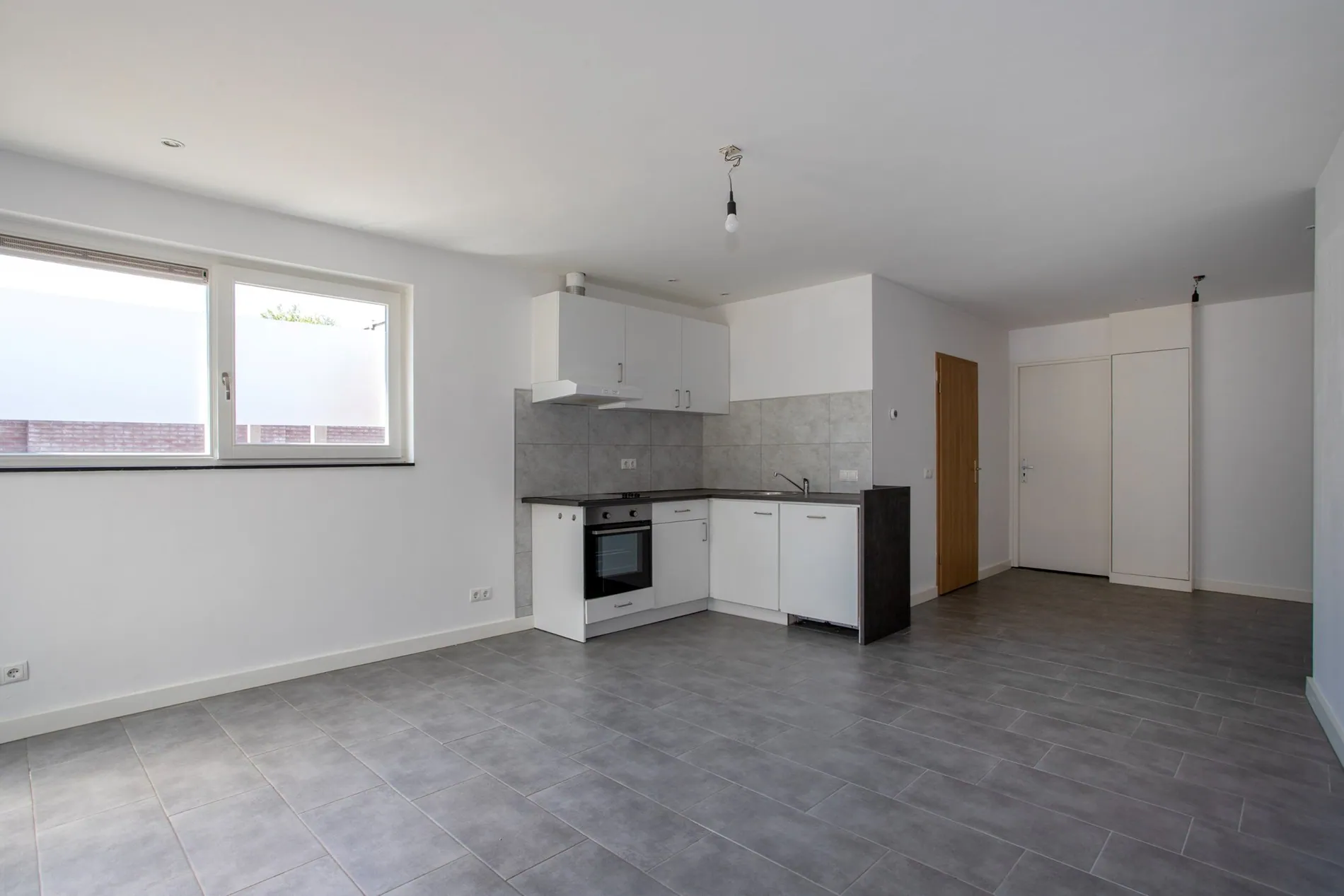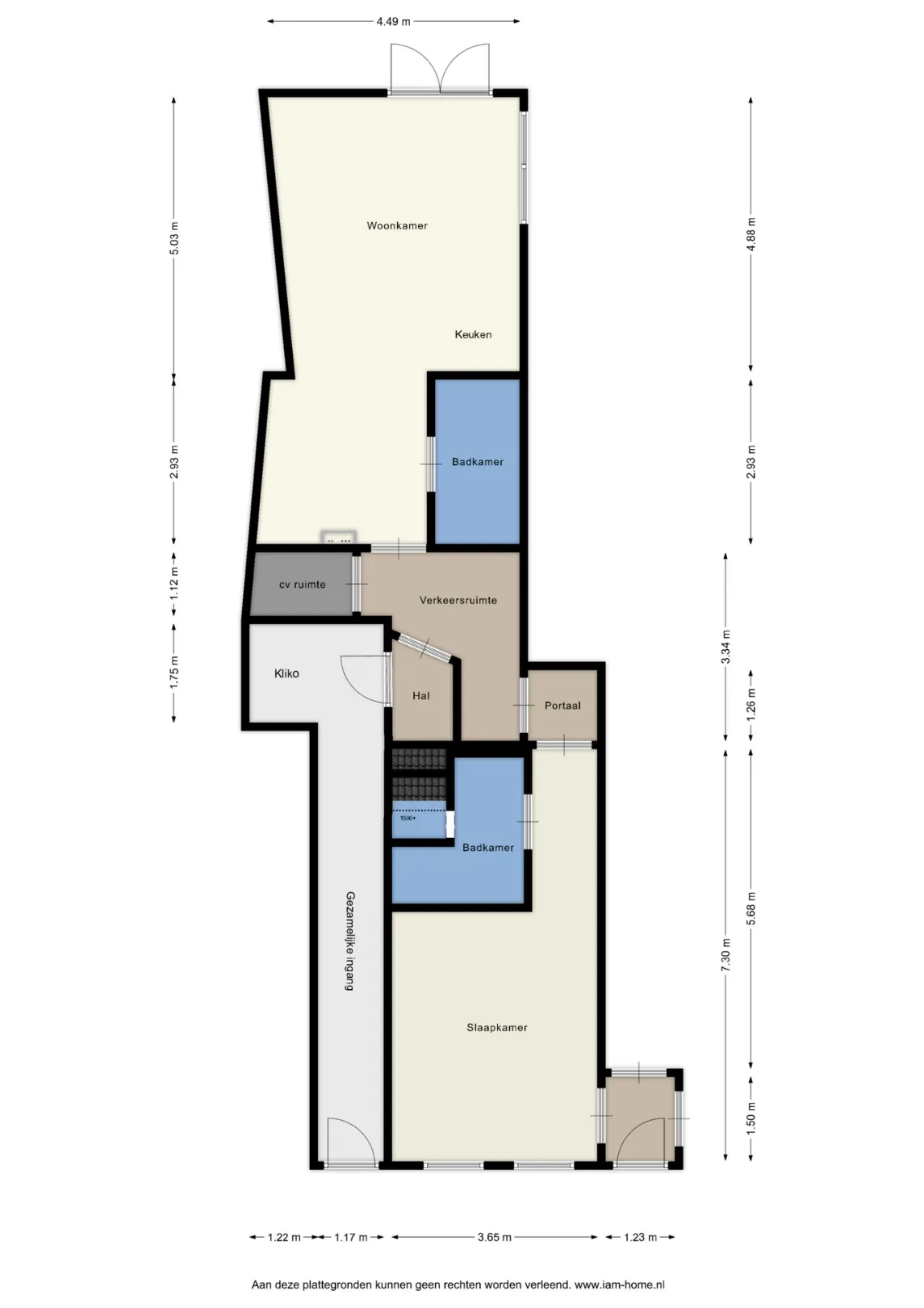 Dit appartement heeft 3 ingangen (2 aan de voorzijde en 1 aan de achterzijde) Via de gezamenlijke centrale zij-ingang aan de linkerzijde is het appartement bereikbaar. Via de hal komt u in de woonkamer/keuken met hierin een badkamer met toilet, vaste wastafel en inloopdouche. In deze badkamer bevinden zich de aansluitingen wasmachine en droger. Tevens bevindt zich in deze ruimte (woonkamer/keuken) de meterkast (7 groepen met aardlekschakelaar).