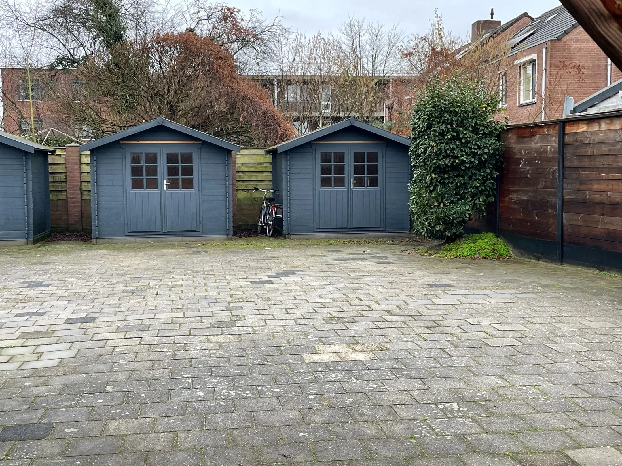 De achtertuin is zoals eerder aangeven gezamenlijk eigendom met voor elke appartement op de begane grond een eigen overdekt terras, een eigen berging en een eigen parkeerplaats. Tevens is er een eigen berging en eigen parkeerplaats voor het appartement op de 1e verdieping (nummer 49). De parkeerplaats, de berging en het overdekt terras liggen op een volledig omheind achterterrein met maximale veiligheid en aan de openbare weg afgesloten met een 3 meter hoge sectionaaldeur met loopdeur. De tuin is verder verhard met tegels.