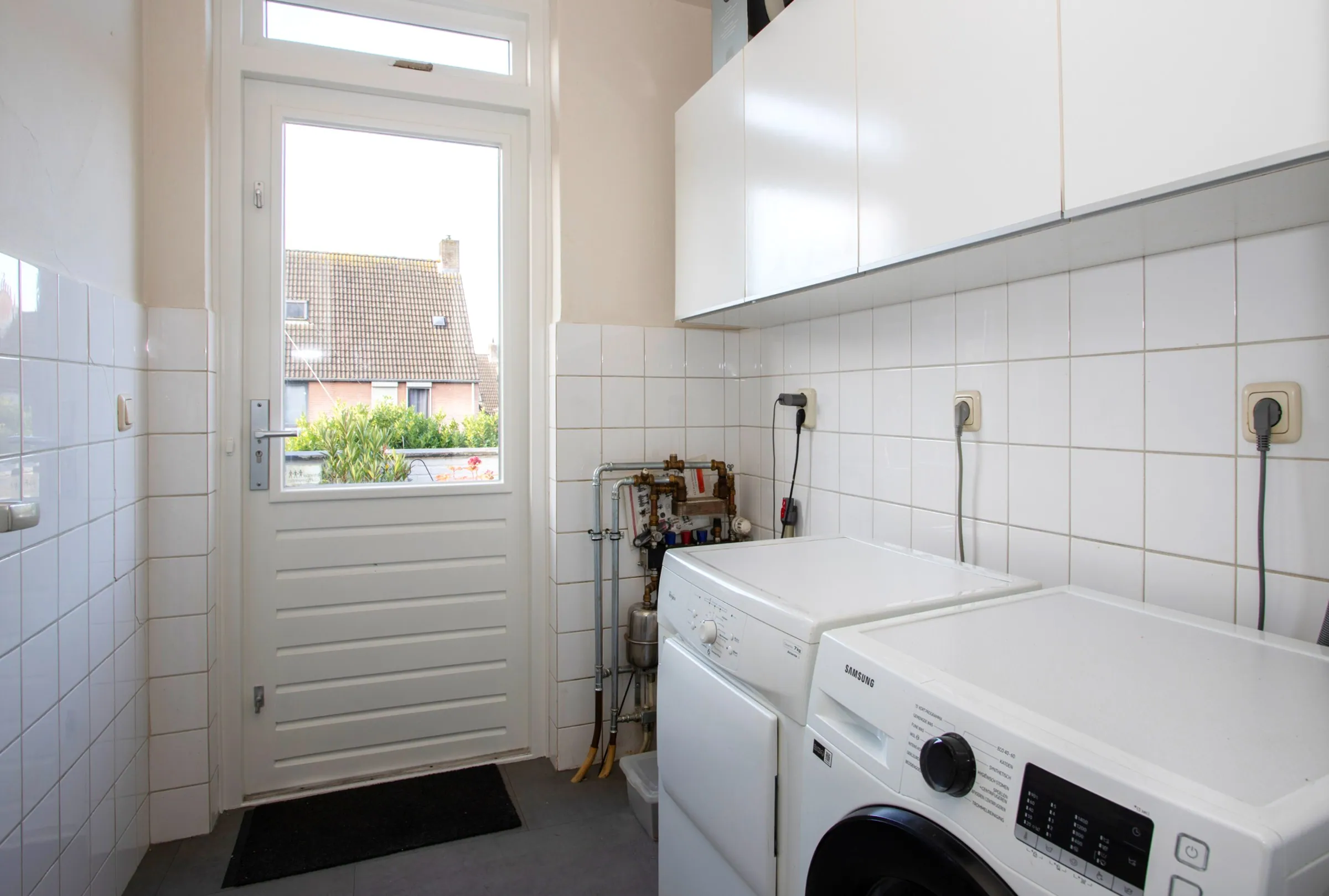De bijkeuken biedt ruimte voor wasmachine- en drogeraansluitingen en directe toegang tot het fraaie dakterras van 22 m², gelegen op het zuidwesten – ideaal om in alle rust te genieten van de middag- en avondzon.