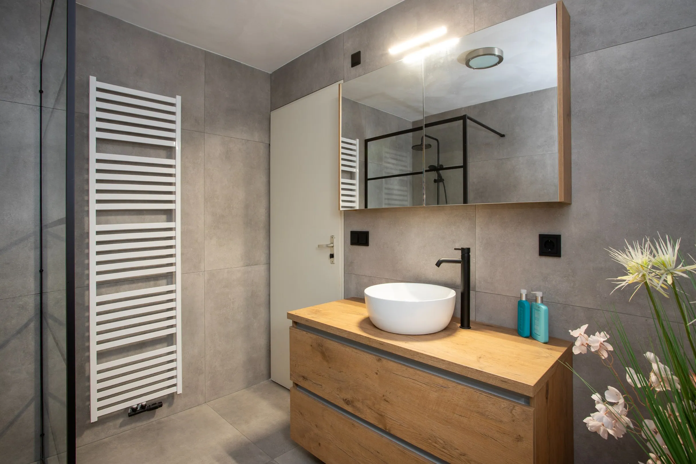 De moderne badkamer (2021) is volledig betegeld en uitgerust met een ruime inloopdouche, riant wastafelmeubel, hangend toilet en natuurlijke ventilatie.