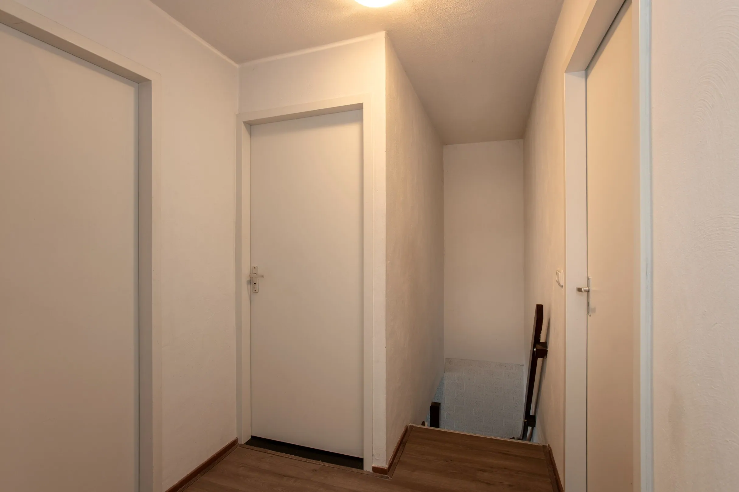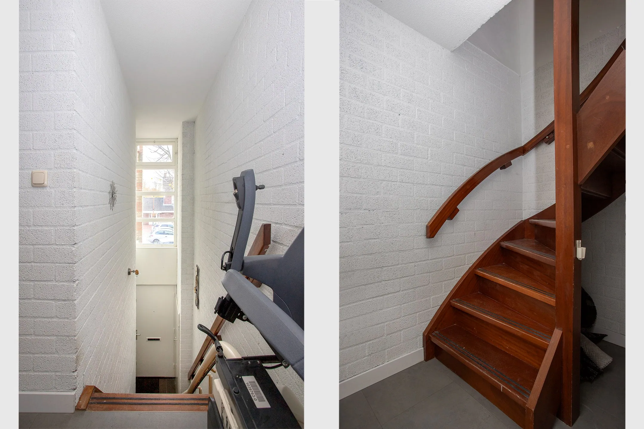 Entree met portaal en meterkast (8 groepen, 2 aardlekschakelaars). Trapopgang met traplift (kan indien gewenst verwijderd worden door de huidige eigenaar).
