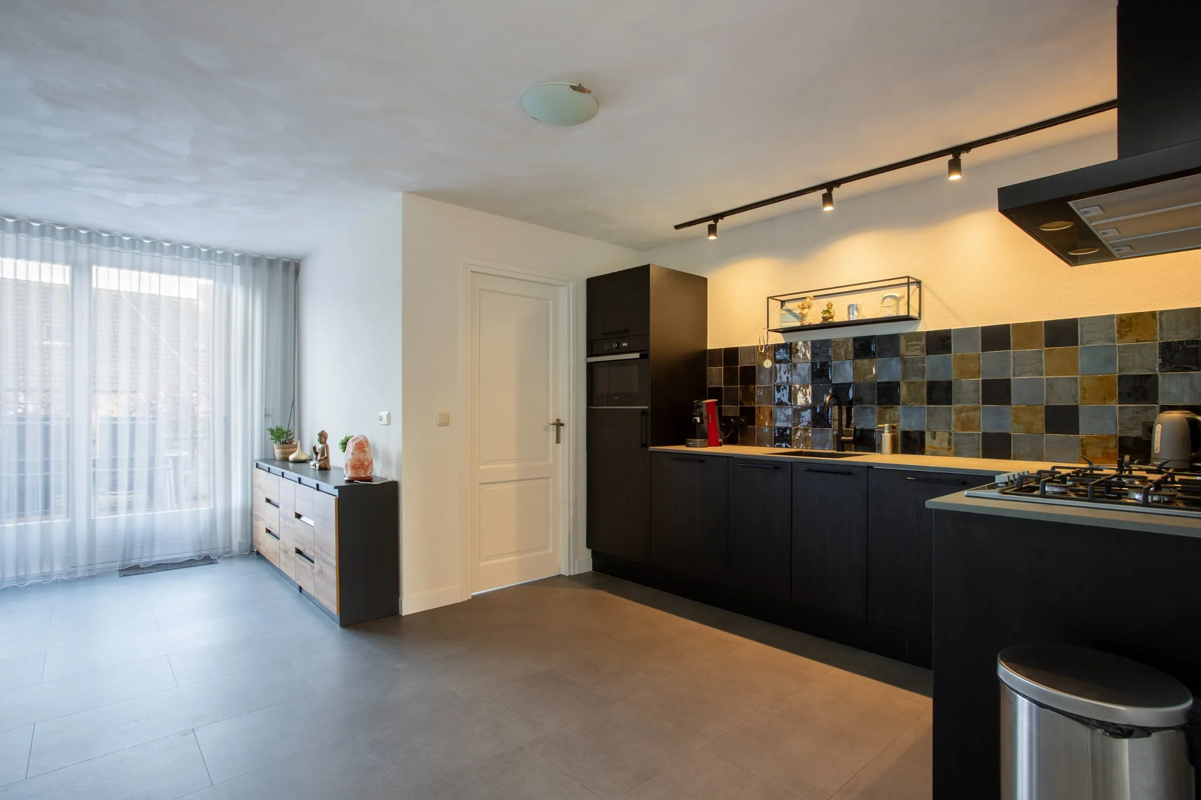 De lichte woonkamer heeft grote raampartijen en biedt een mooi uitzicht over de Markt. De open keuken (2021) is modern uitgevoerd en voorzien van een 5-pits gaskookplaat, afzuigkap, combi-oven, rvs-spoelbak en koelkast.
