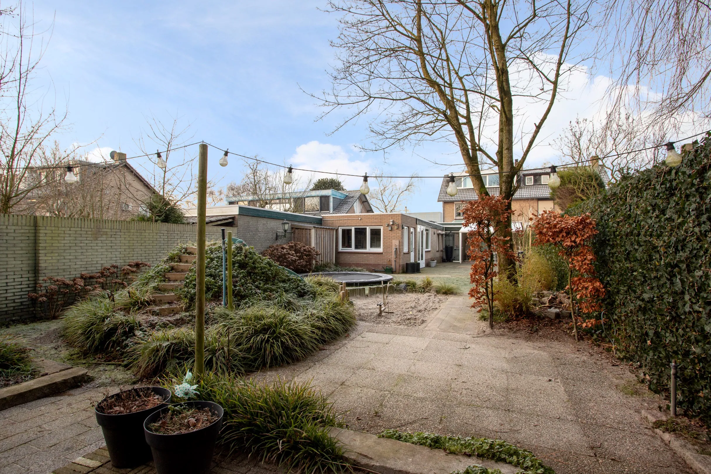 De achtertuin is volledig omheind en heeft een overkapping. In de achtertuin bevindt zich de hobbyruimte/mantelzorgwoning/salon/kantoor en bestaat uit 2 delen. In het eerste deel treft u een slaapruimte aan het een separaat toilet en een separate badkamer met inloopdouche en vaste wastafel. Het tweede gedeelte welke op dit moment van buitenaf bereikbaar is, betreft de keuken/(woon)kamer met boiler en beperkte keukeninrichting. Eventueel kunnen deze van binnenuit met elkaar worden verbonden. Indien het bijgebouw als hobbyruimtes/salon/kantoor worden ingericht beschikt u over twee separate ruimtes. Achter deze twee separate ruimtes treft u verder nog een buitenberging aan met hierin de grondwaterput met pomp. De achtertuin is voorzien van sierbestrating, vaste planten, (laurier)bomen, borders met vaste planten, gazon en een trampoline. De voortuin heeft naast een oprit voor een 3-tal personenauto’s, sierbestrating en vaste planten.
