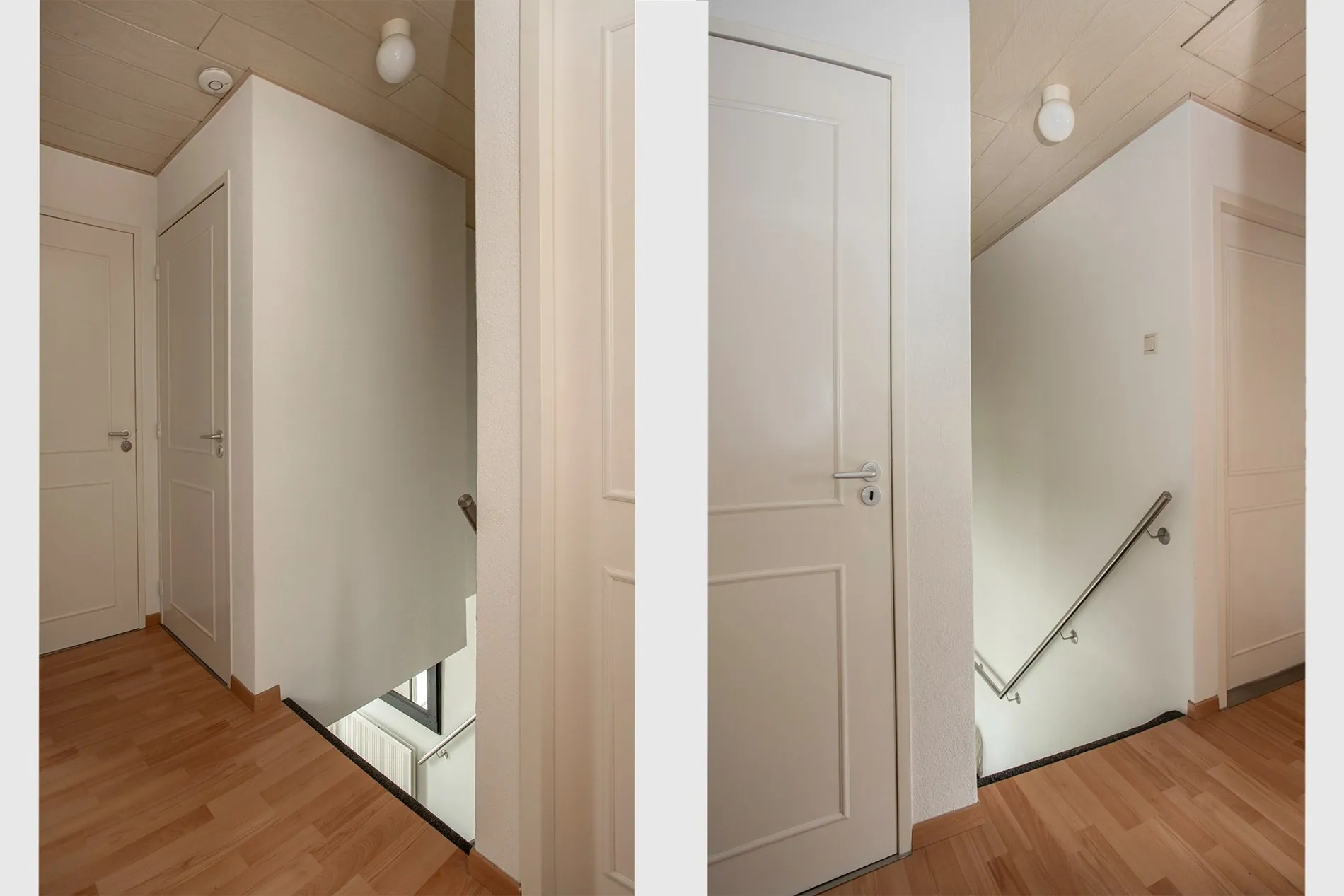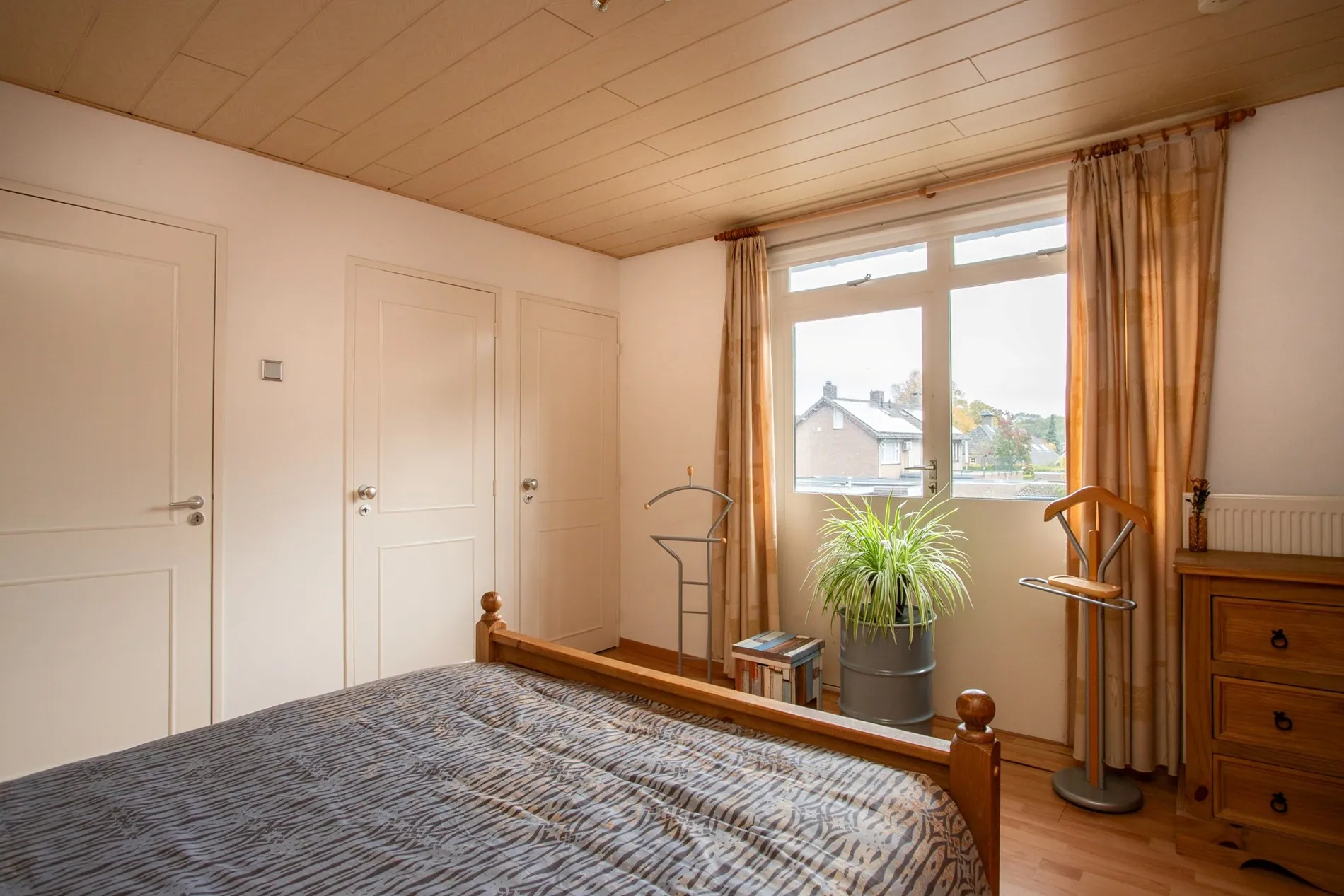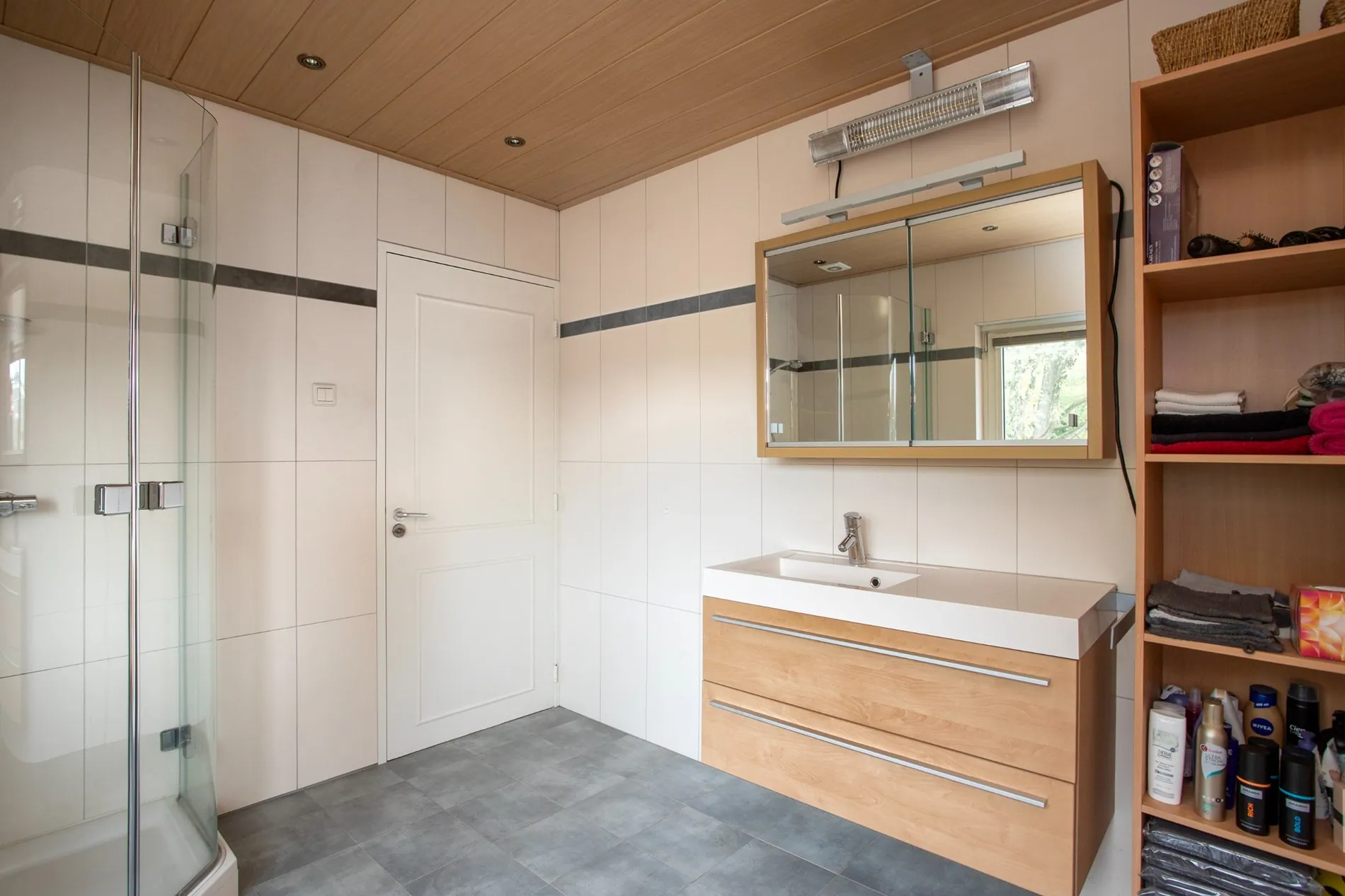 Via de vaste trap in de hal bereikt u de overloop op de eerste verdieping. Hier bevinden zich twee slaapkamers. Een ruime slaapkamer met twee inbouwkasten en toegang tot een balkon en een kleine slaapkamer met afsluitbare doorgang naar de multifunctionele of extra (woon)ruimte boven de garage. Daarnaast is er een betegelde bergruimte met kastenwand en vaste wastafel, een separaat toilet met fonteintje en een ruime badkamer voorzien van een ligbad, douchecabine, badkamermeubel met wastafel, designradiator, mechanische ventilatie en elektrische vloerverwarming.