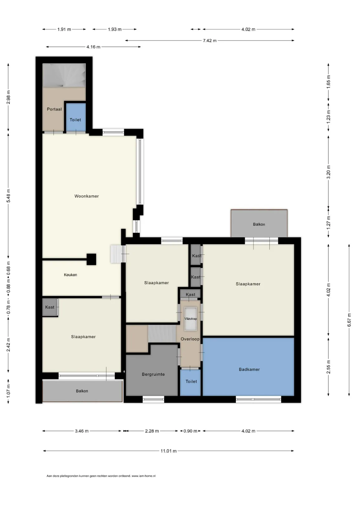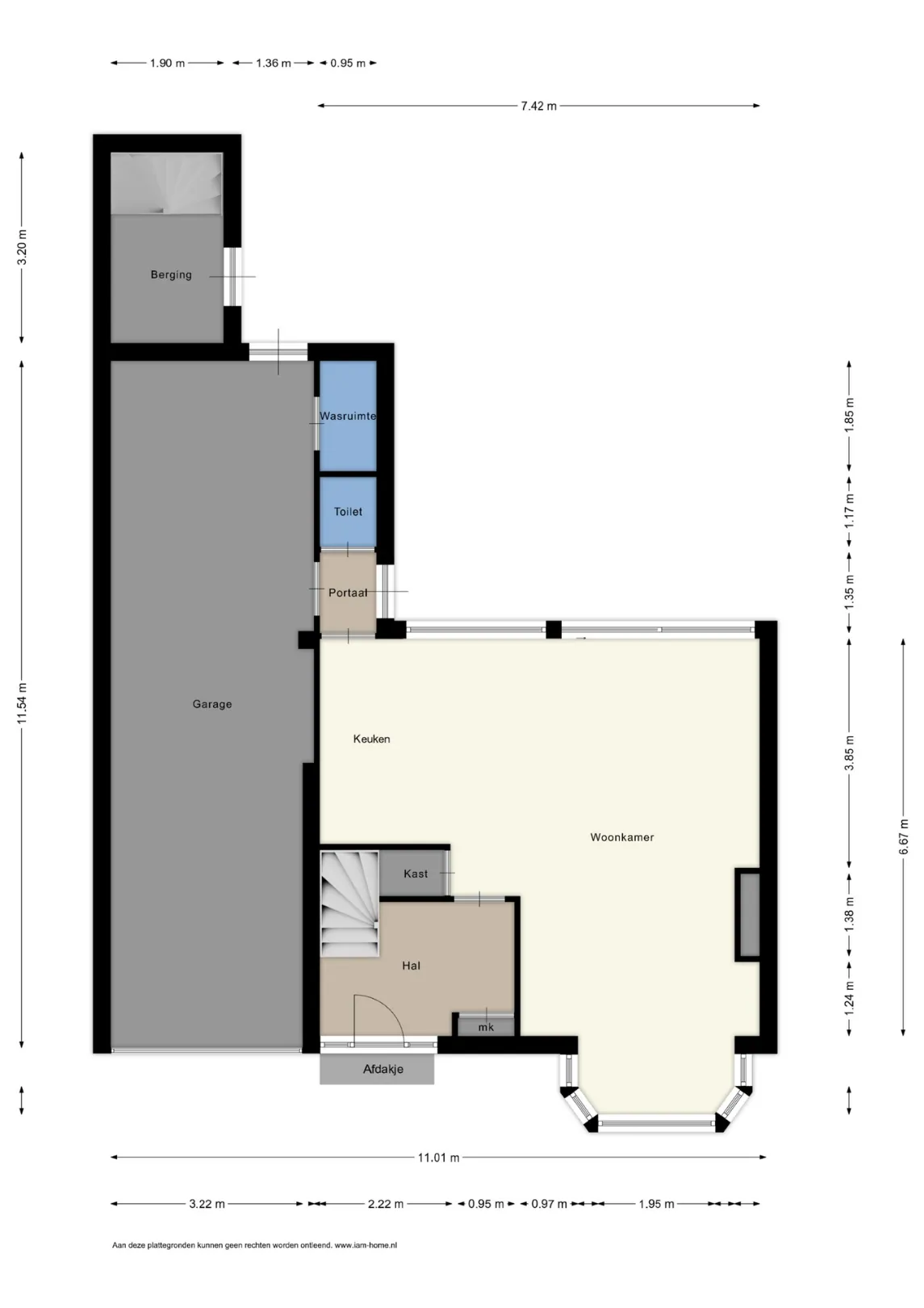 Aangrenzend aan de keuken bevindt zich een portaal met toegang tot het toilet (met fonteintje), de buitendeur naar de achtertuin en de inpandige garage. De garage is voorzien van een sectionaaldeur en heeft een afgesloten ruimte met aansluitingen voor wasmachine en droger en biedt extra opbergruimte in een praktische stellingkast..
