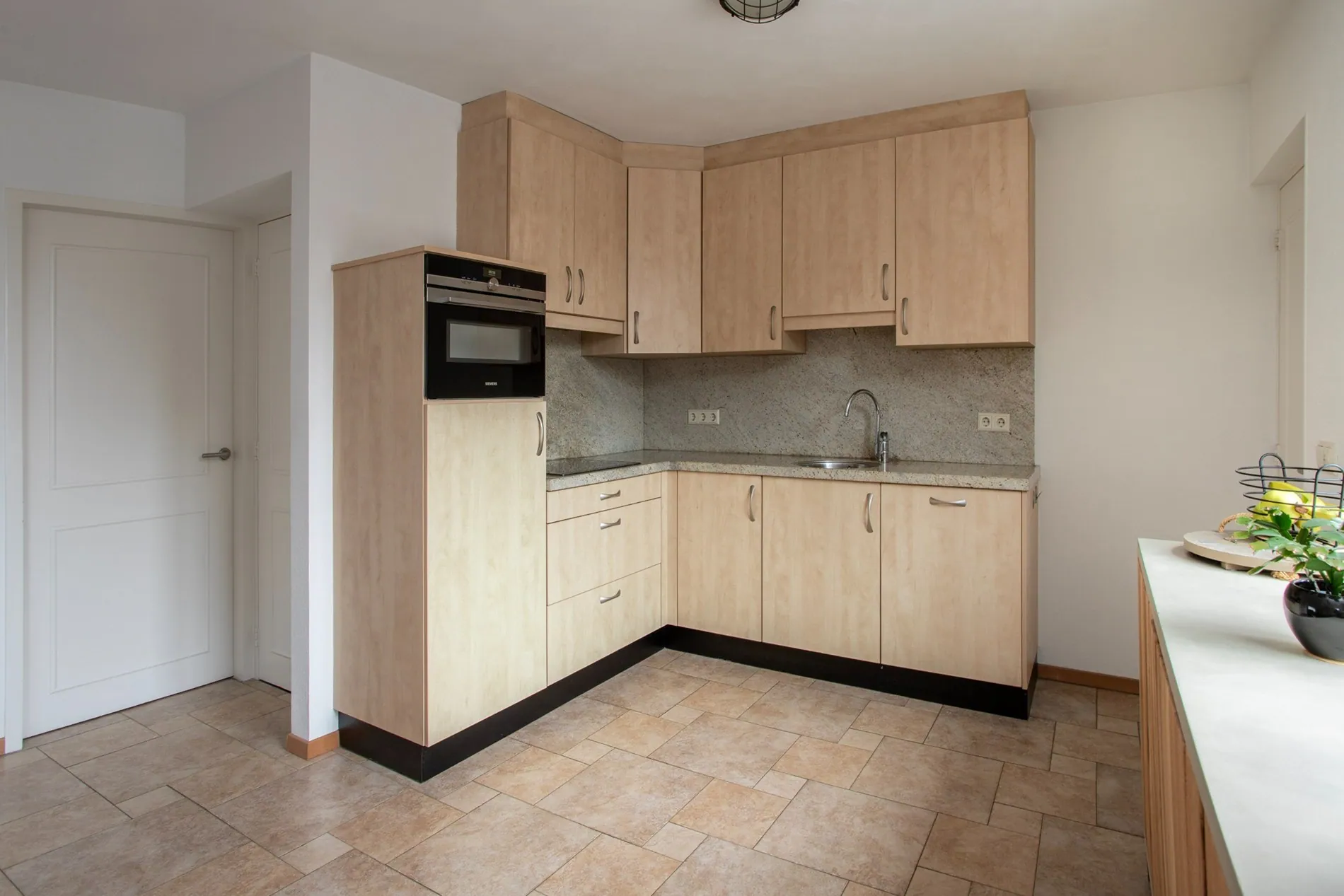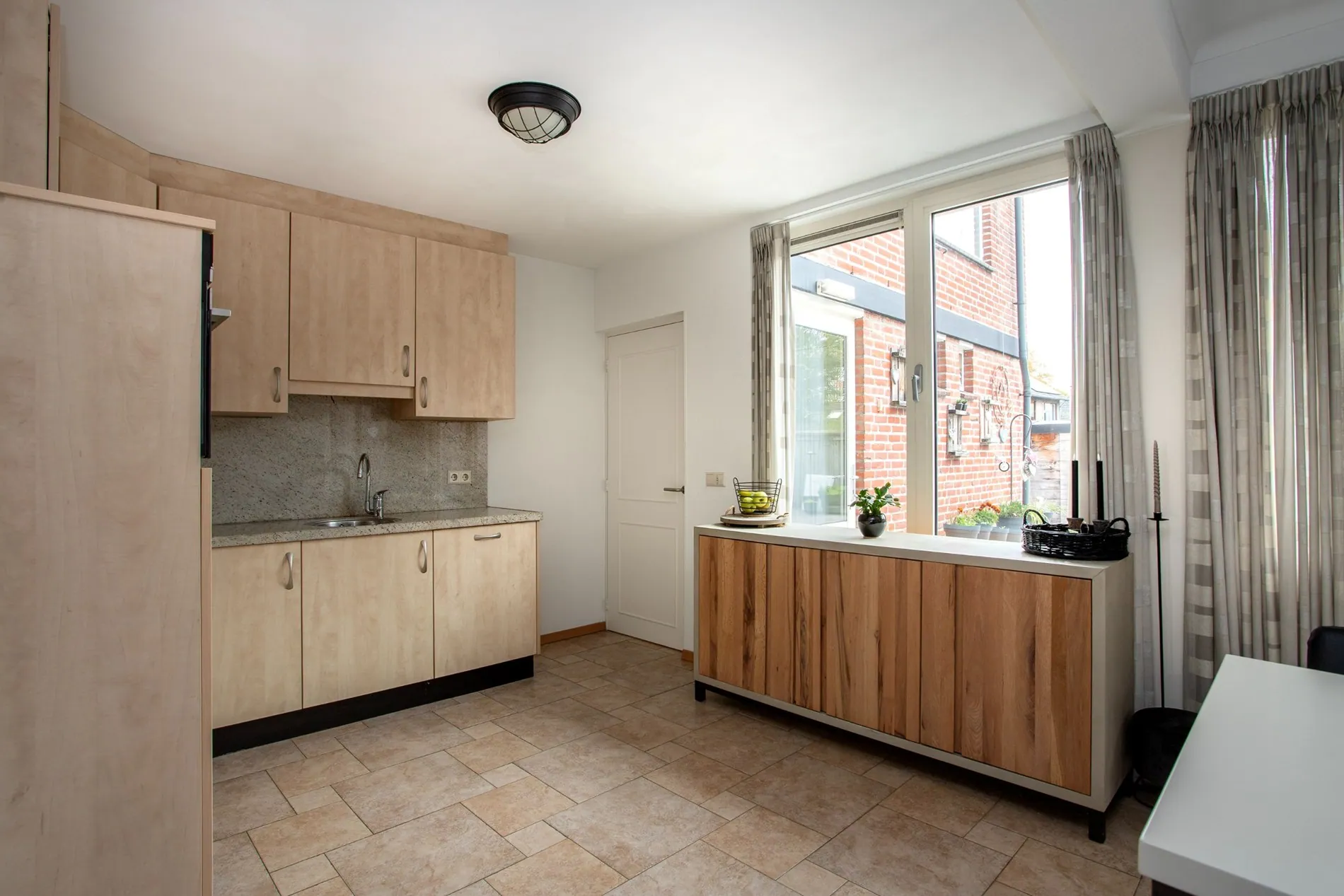 De open keuken sluit naadloos aan op de woonkamer en is compleet uitgerust met een granieten werkblad en bijpassend spatscherm, een inductiekookplaat, afzuigkap, RVS-spoelbak, close-in boiler, vaatwasser en voldoende kastruimte en uiteraard een afzuigkap, combimagnetron en koelkast welke recent vernieuwd zijn. Vanuit de keuken bereikt u eveneens de manshoge kelder: ideaal voor extra opslagruimte.