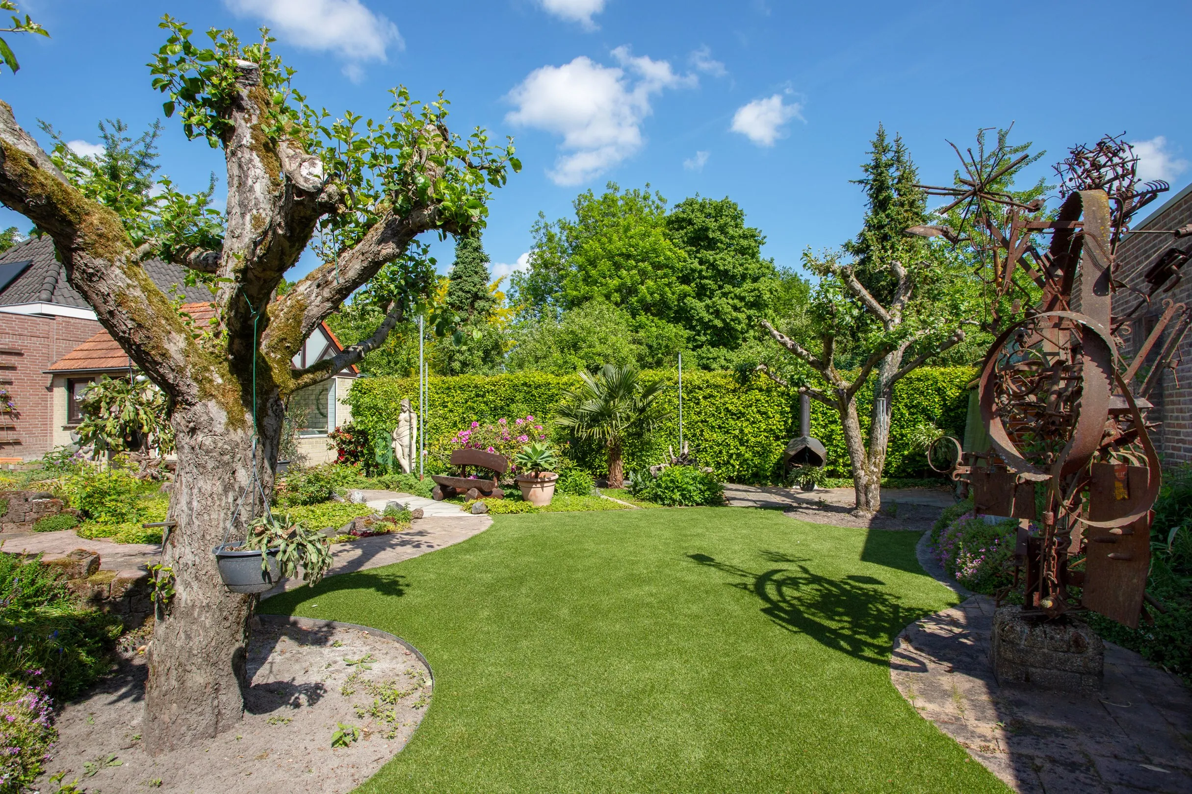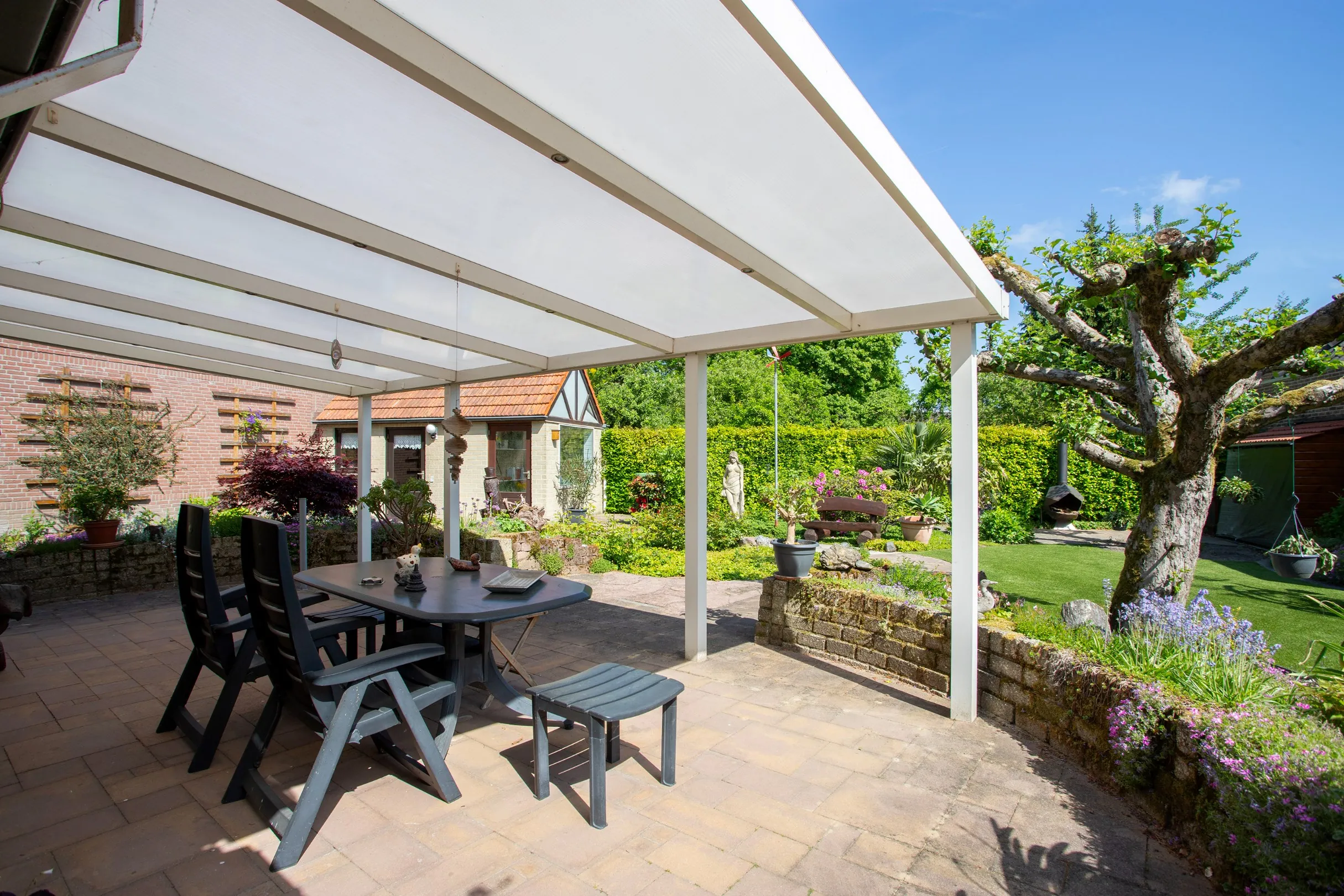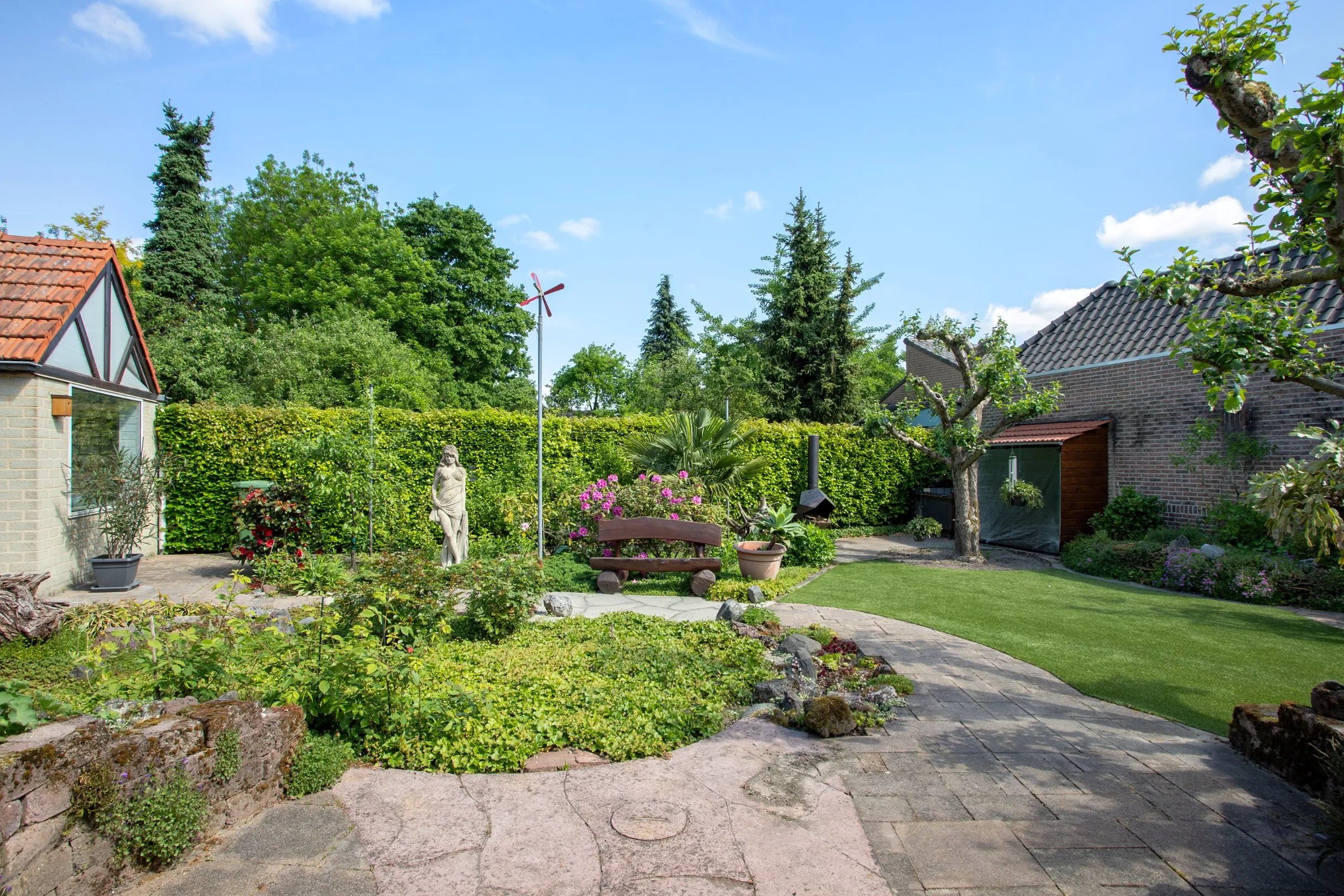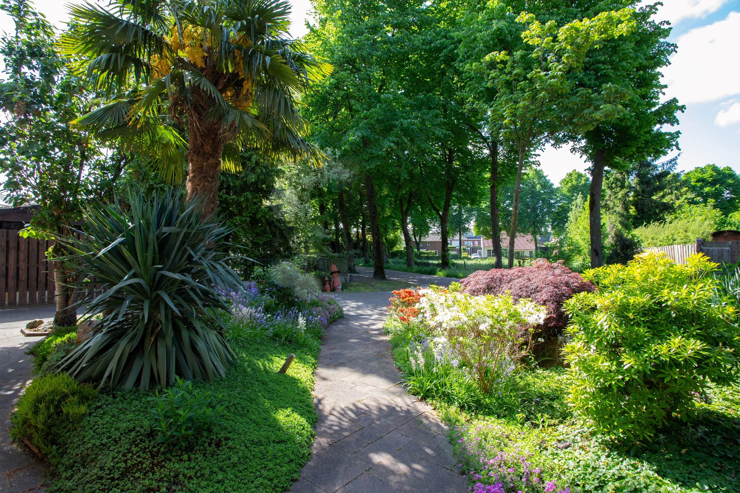 De buitenruimte ademt de sfeer van een park: rijk begroeid, kleurrijk en zorgvuldig aangelegd met vaste lage en hoge beplanting. Elke seizoen laat de tuin zich van een andere, levendige kant zien. De achtertuin biedt zowel zon- als schaduwplekken en is voorzien van een royale aluminium overkapping – perfect voor lange avonden buiten. Achter in de tuin staat een degelijke berging, opgetrokken in spouw en verdeeld in twee praktische ruimten.