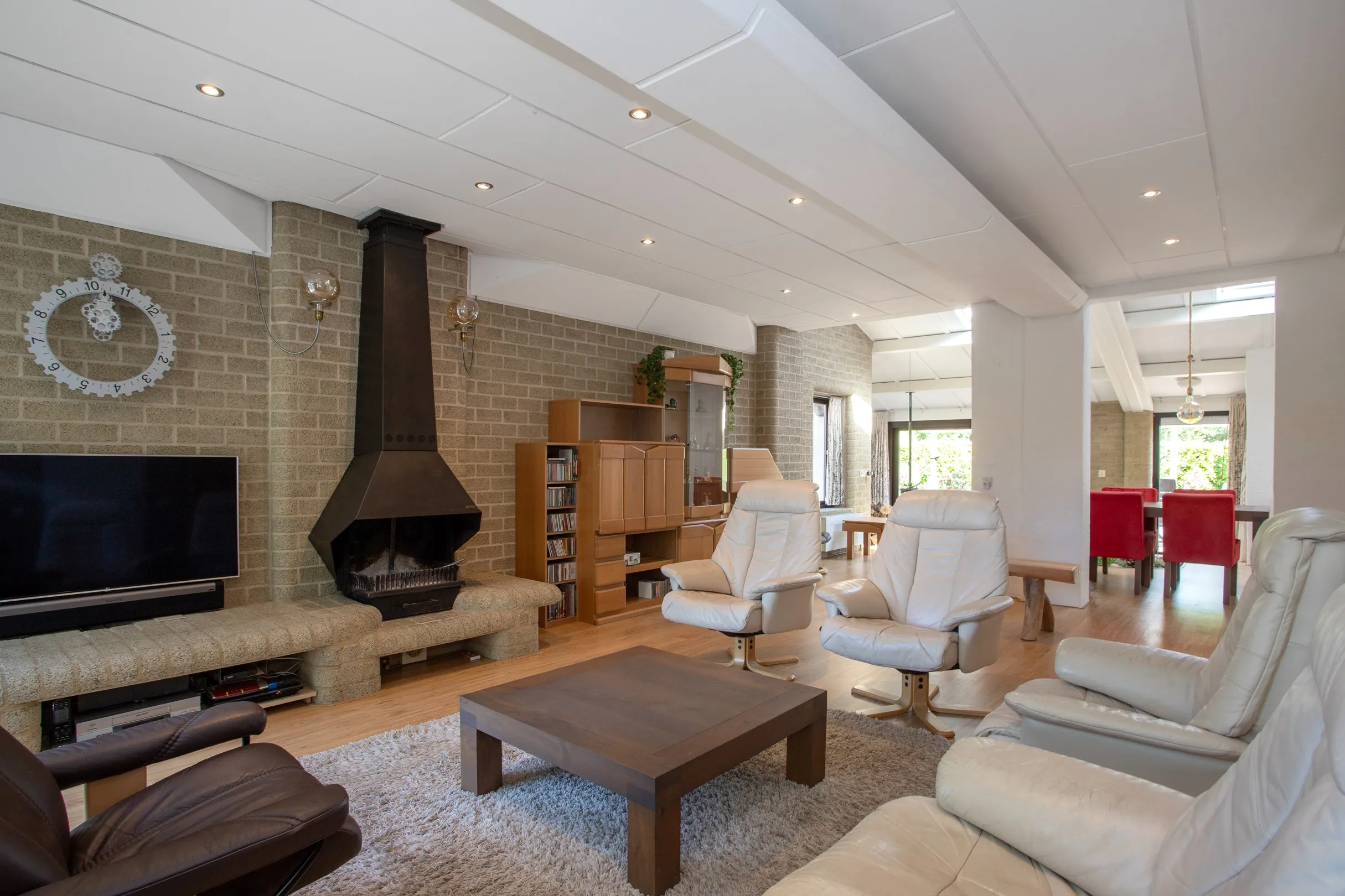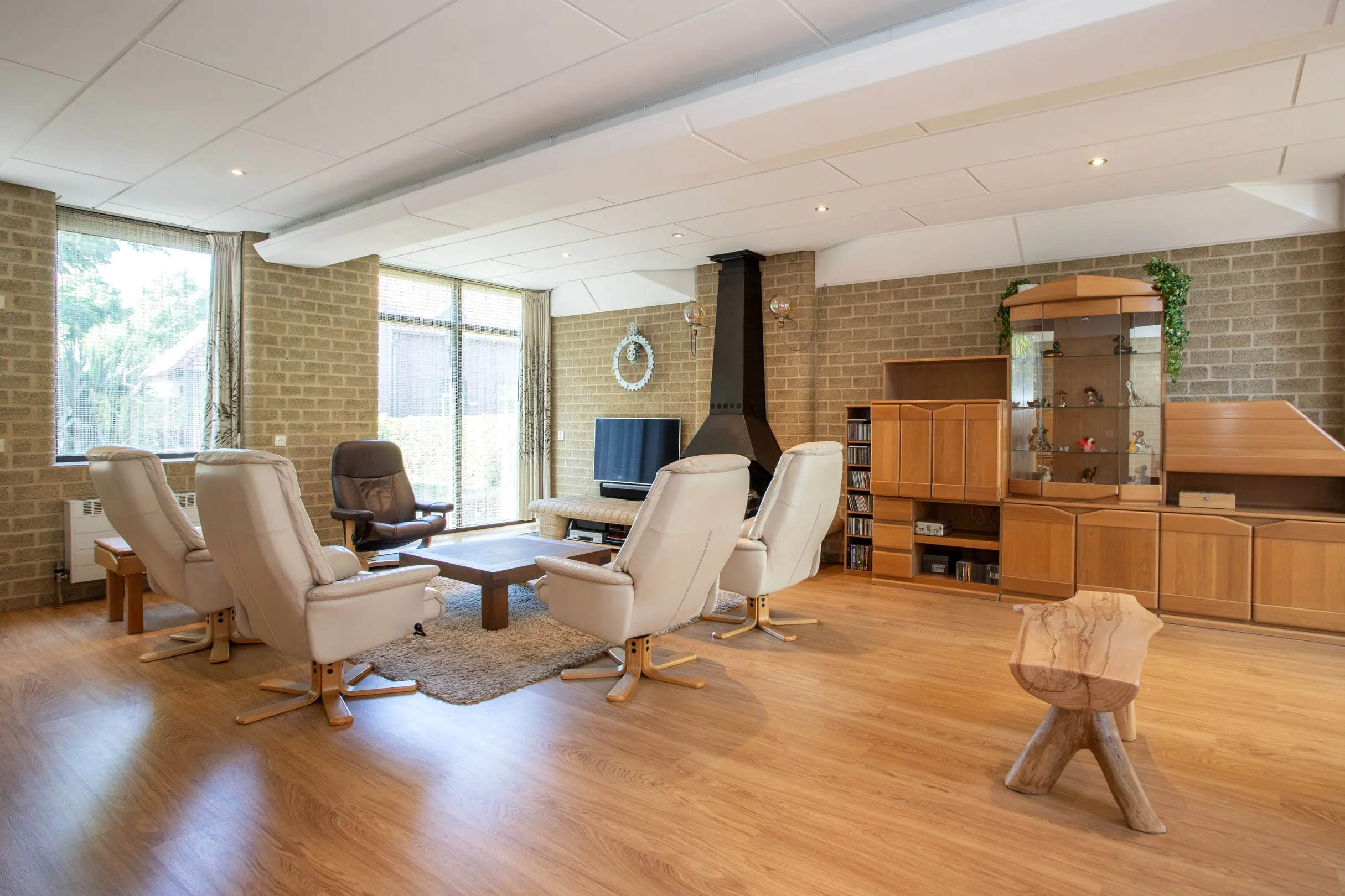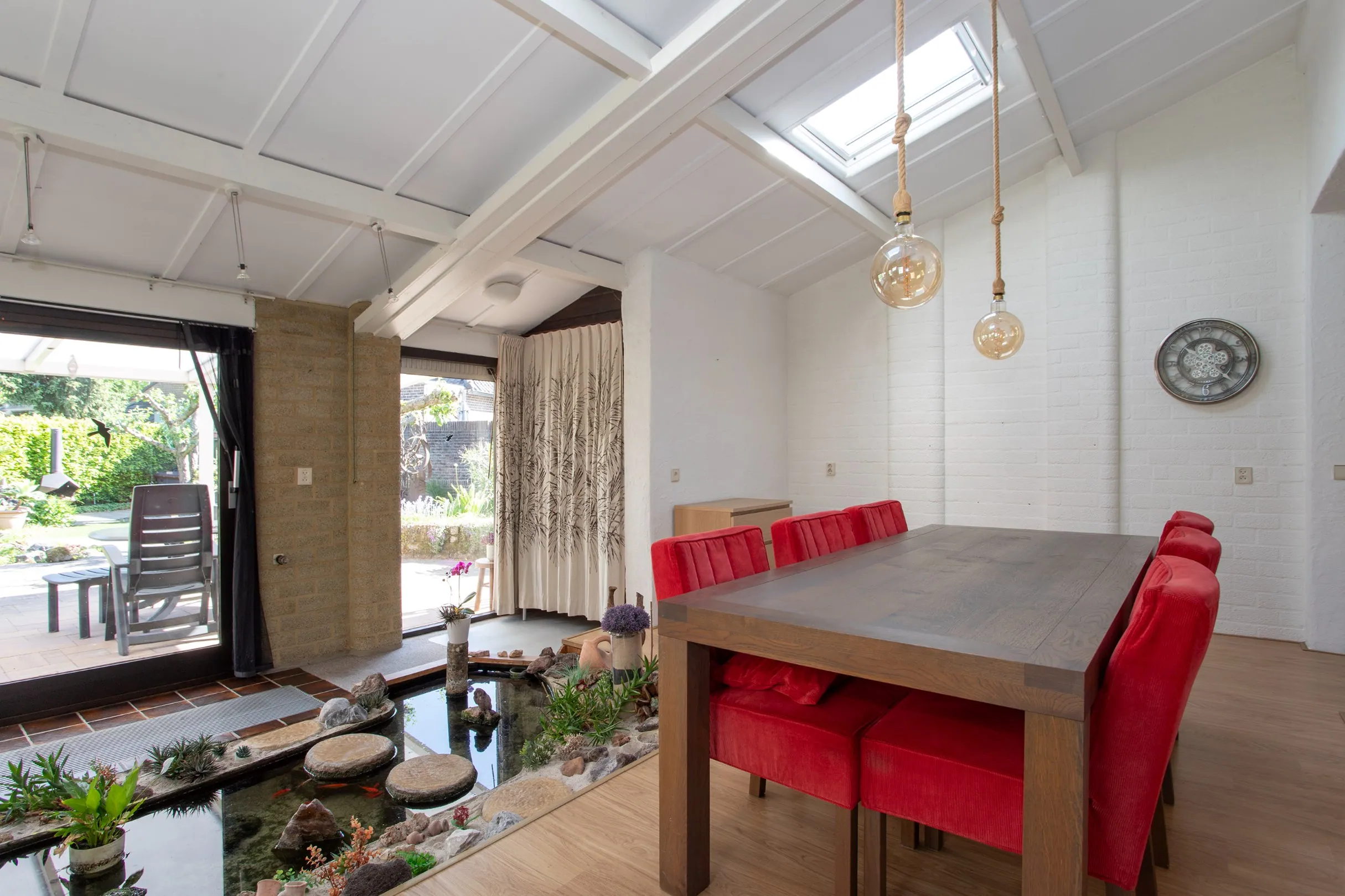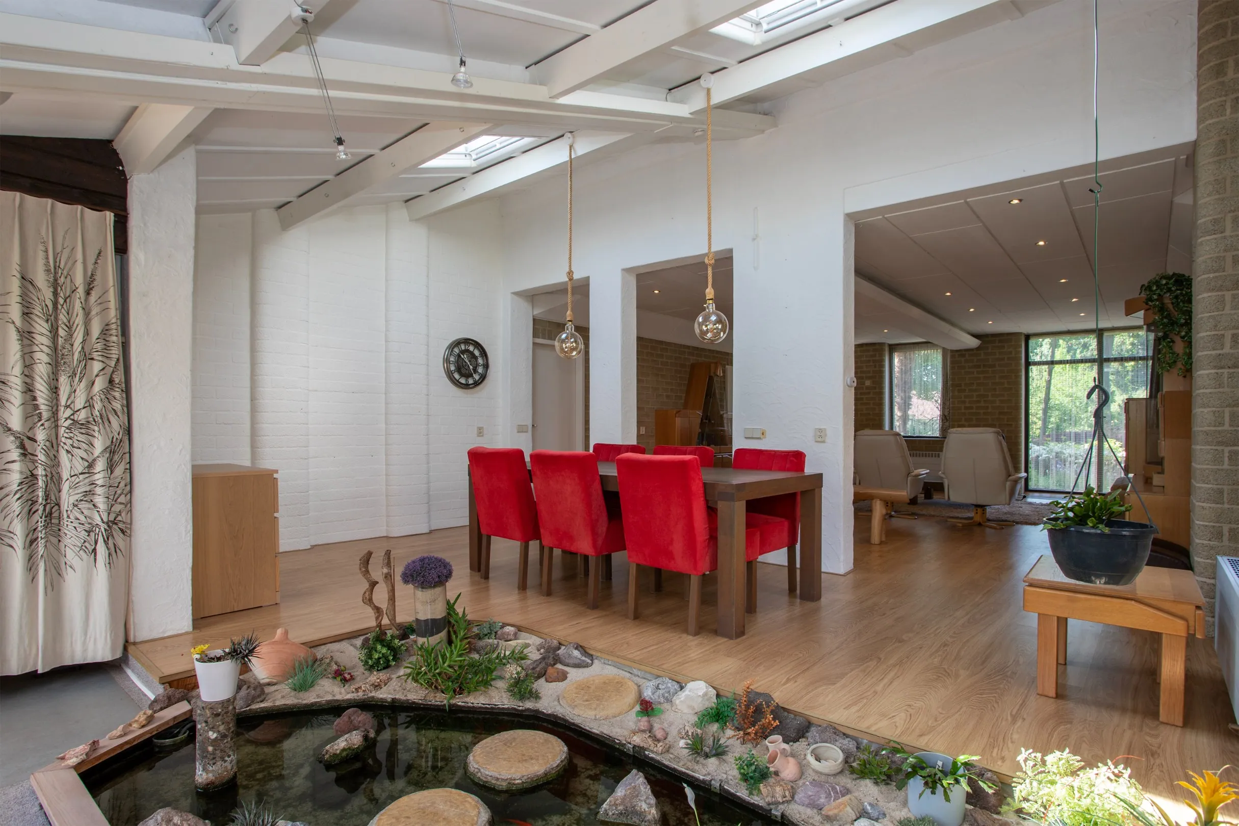De woonkamer is royaal bemeten en biedt dankzij de speelse indeling, diverse raampartijen en dakramen een uitzonderlijk lichte en sfeervolle leefruimte. Vanuit iedere hoek geniet u van het uitzicht op het omringende groen. De ruimte is voorzien van inbouwspots, een sfeervolle houthaard en zelfs een bijzondere binnenvijver – elementen die bijdragen aan een unieke woonsfeer.