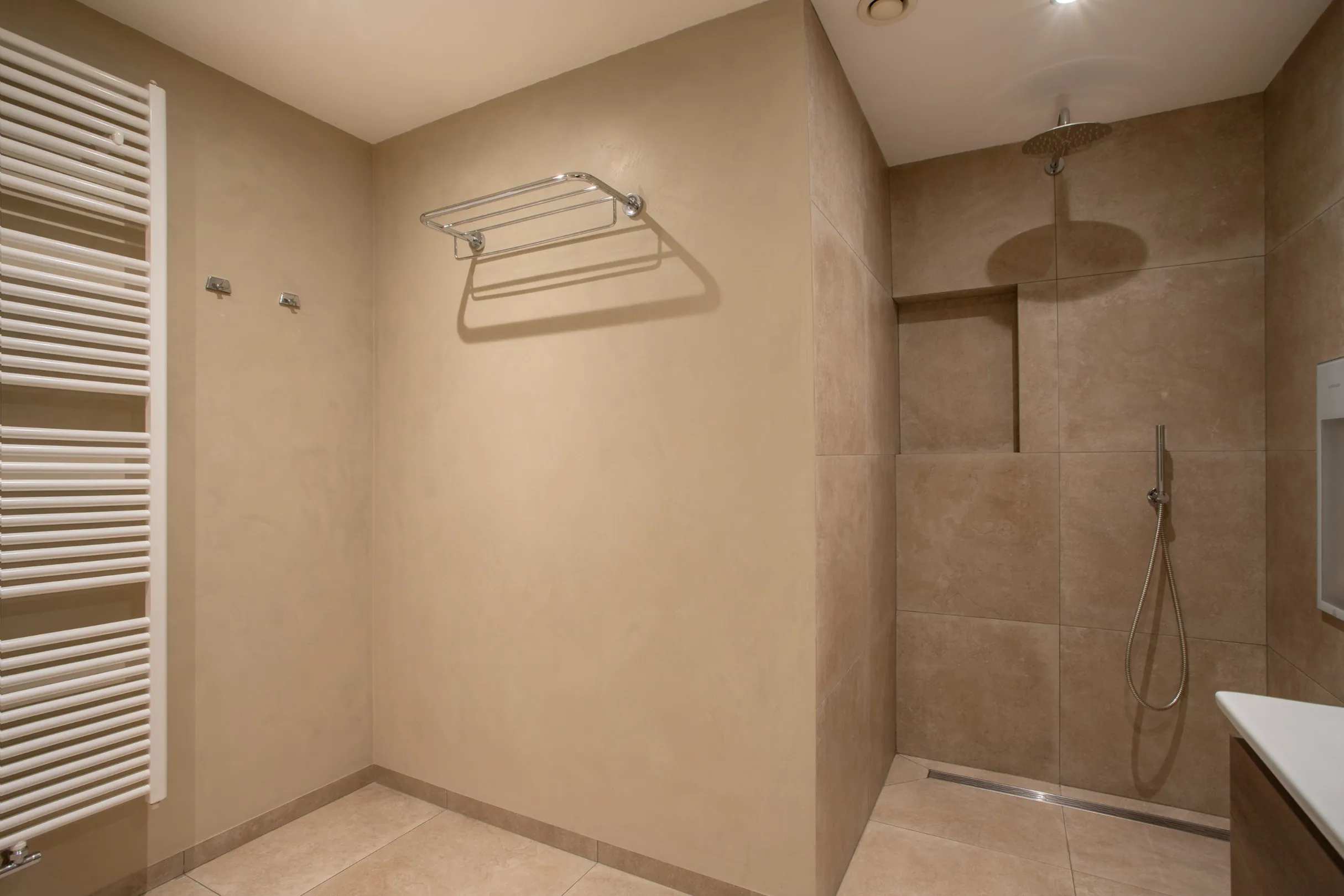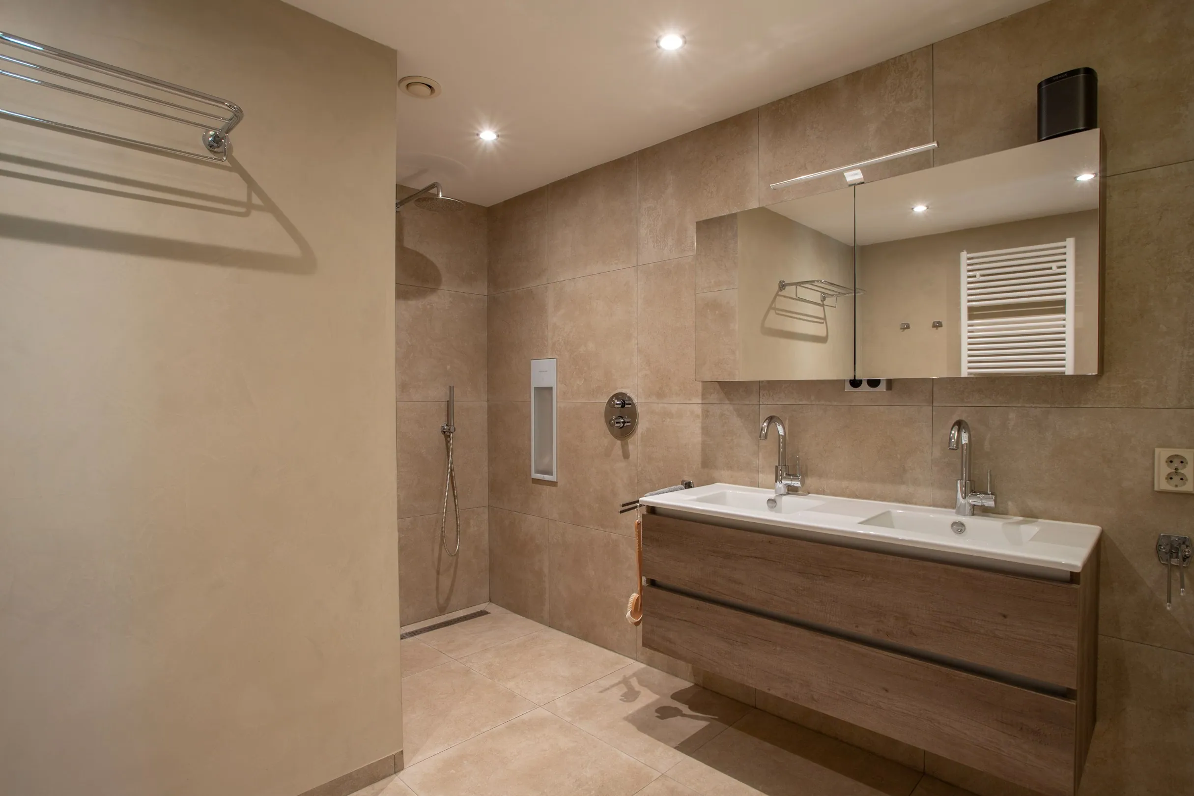 Allereerst valt de luxe en eigentijdse badkamer op, uitgevoerd in een combinatie van strak stucwerk en fraai tegelwerk in verstek gezaagd. De hoogwaardige afwerking komt tot uiting in een ruime inloopdouche met sunshower en ingebouwde thermostaatkraan, een dubbele wastafel en een designradiator. Het separate toilet met fonteintje is eveneens via de hal bereikbaar.