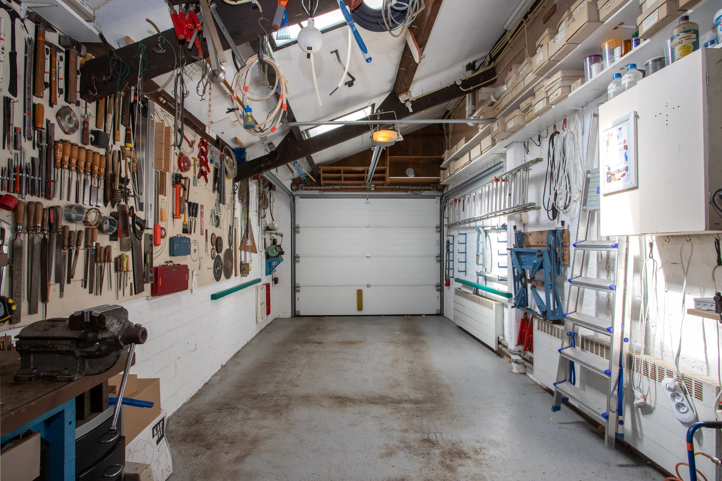 De garage is uitgerust met een elektrische garagedeur, verwarming, water en elektra. Twee dakramen zorgen hier voor natuurlijk licht.