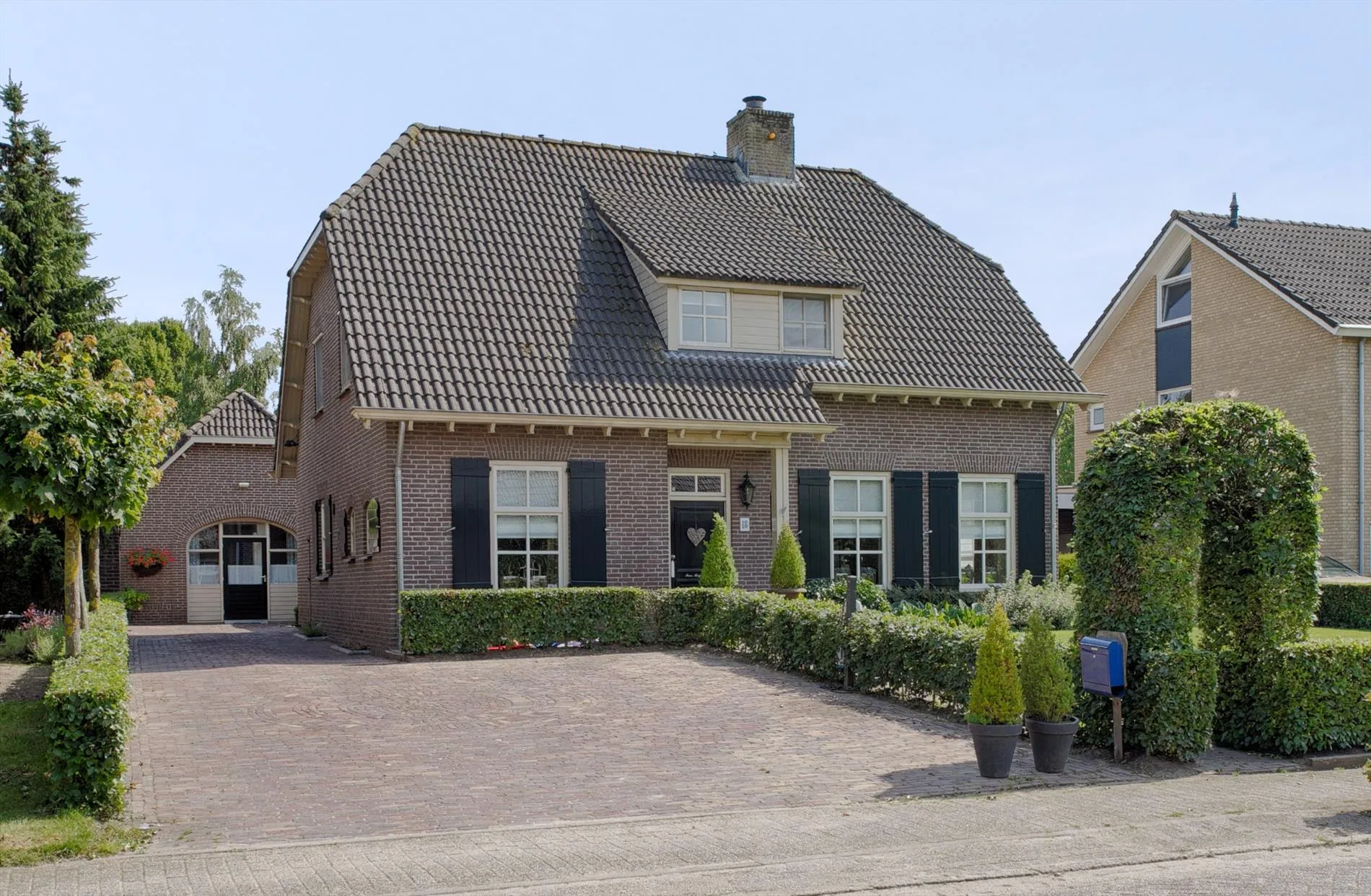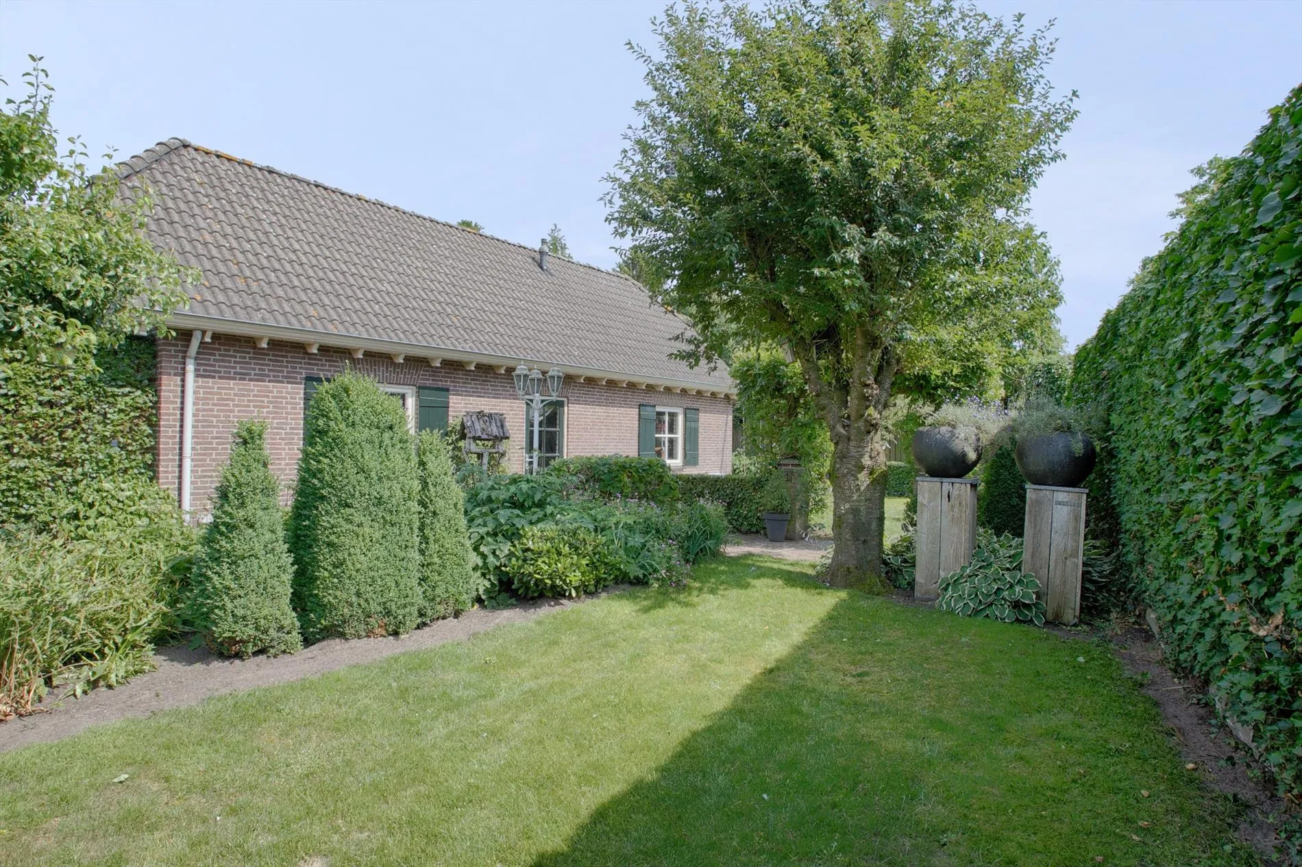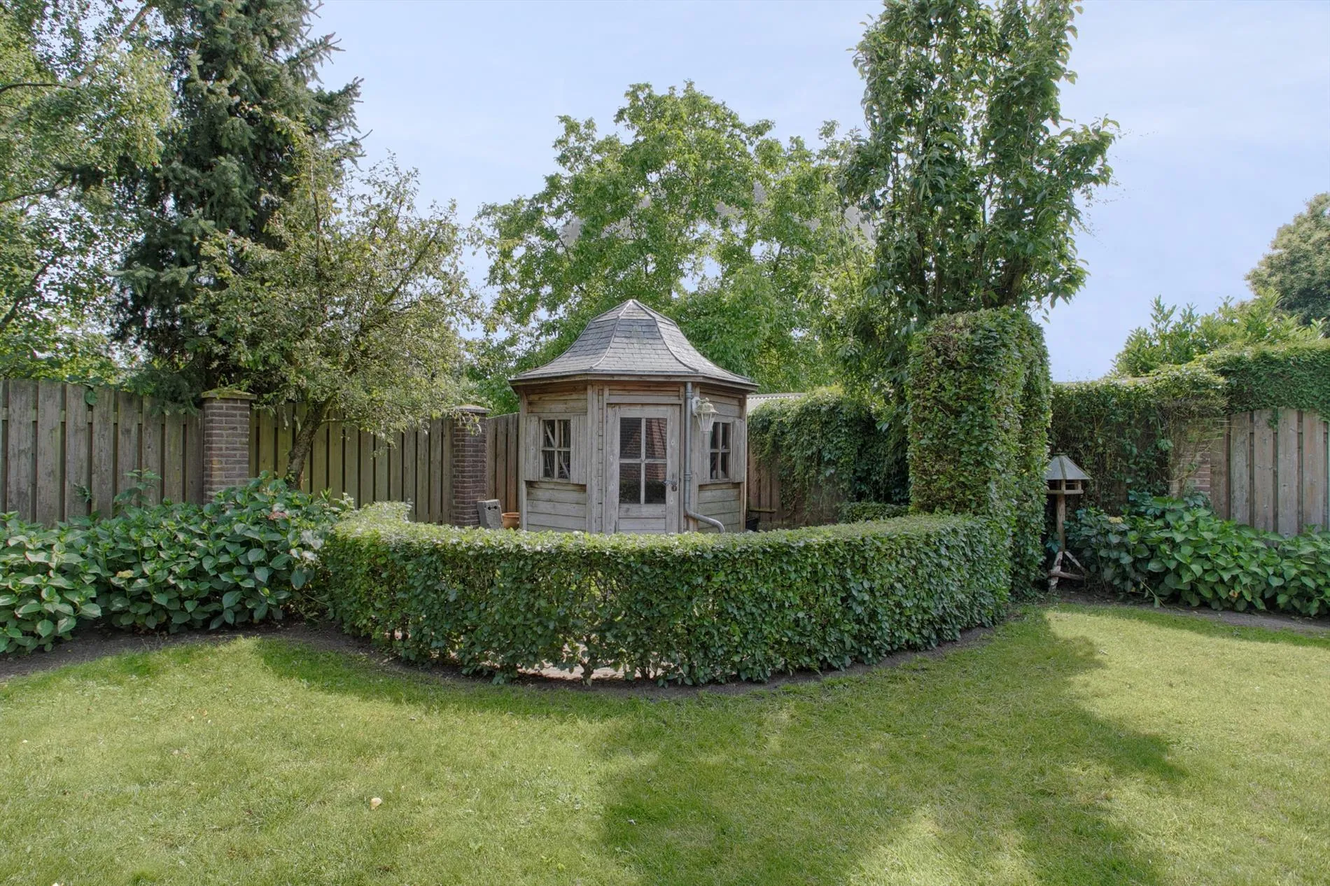 De achtertuin is fraai aangelegd met sierhagen en graspartijen. Er is een dubbele vrije achterom, buitenkraantje, een tuinhuis achterin de tuin en een gezellige zithoek gerealiseerd. Dankzij de gunstige oriëntatie op het zuiden is er altijd wel een plekje zon in deze tuin te vinden. De voortuin is net zoals de achtertuin fraai aangelegd met sierhagen en graspartijen. Tevens is er voldoende parkeergelegenheid voor het parkeren van meerdere wagens.