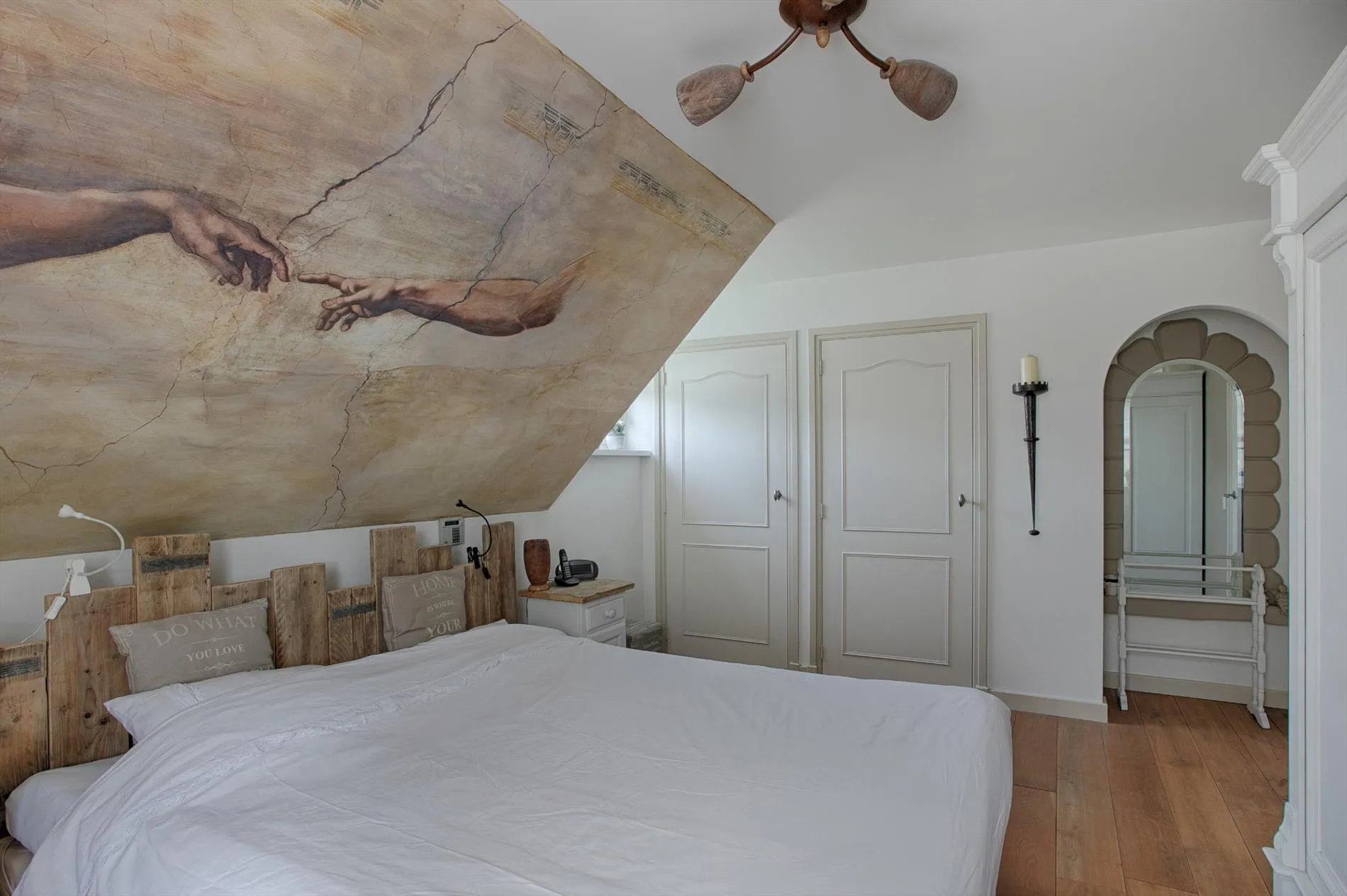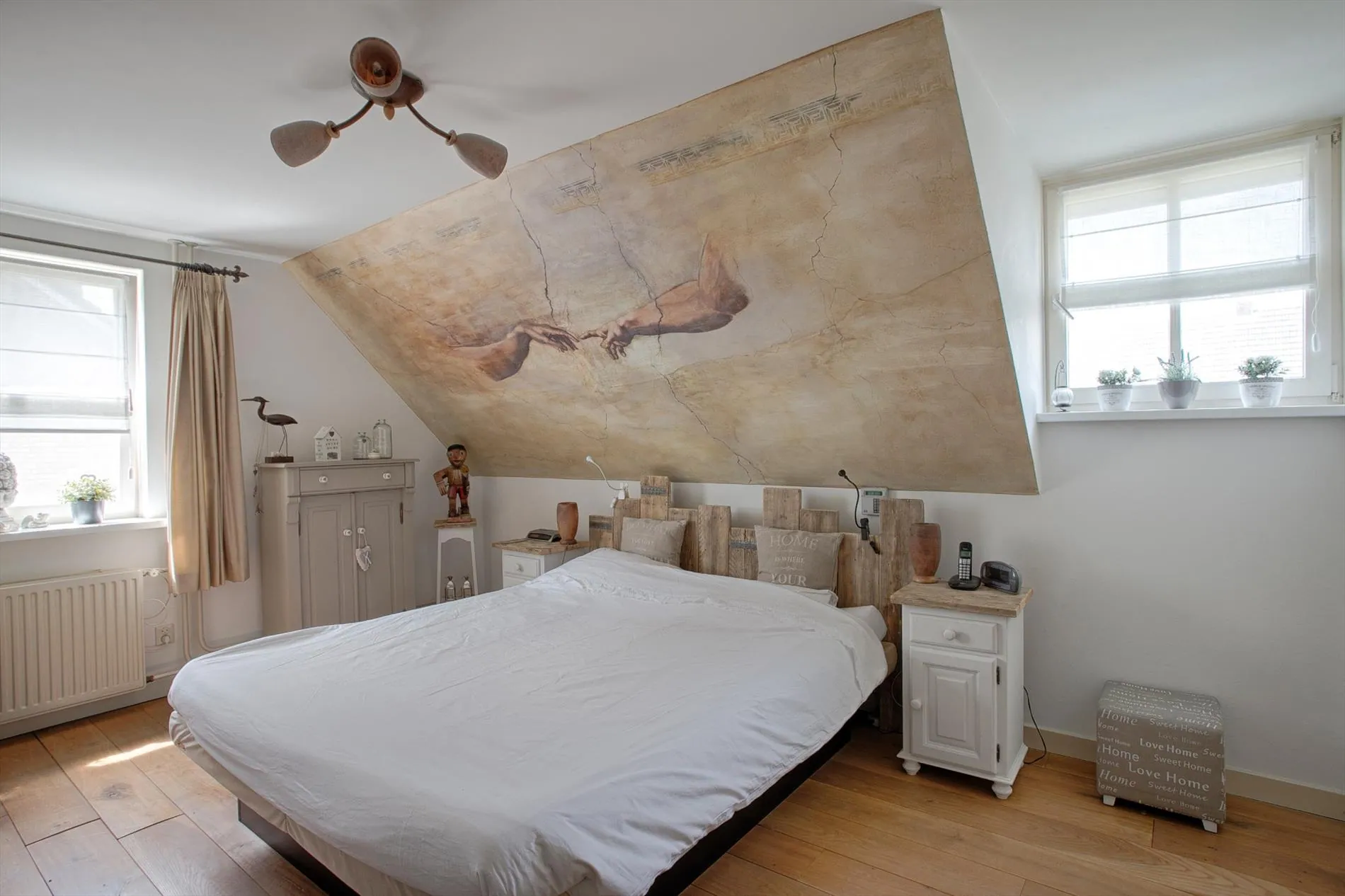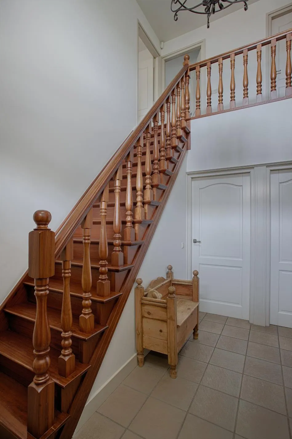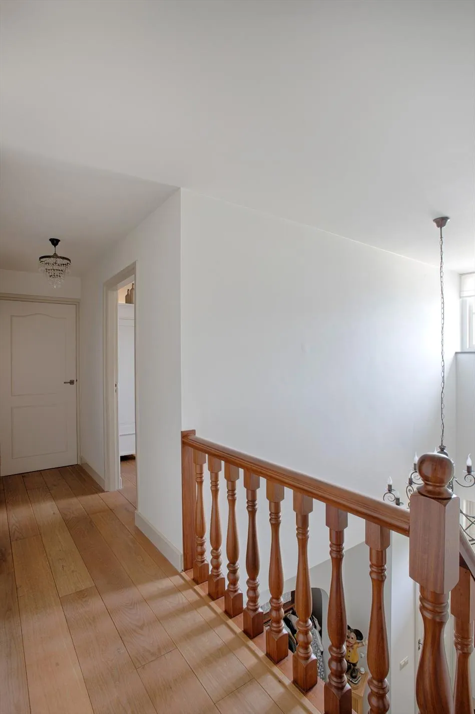 Via de overloop bereikt u 4 slaapkamers, 1 badkamer en de trapopgang naar de 2e verdieping. De 1e verdieping heeft een betonnen verdiepingsvloer, strak gestuukte wanden en houten vloeren.
