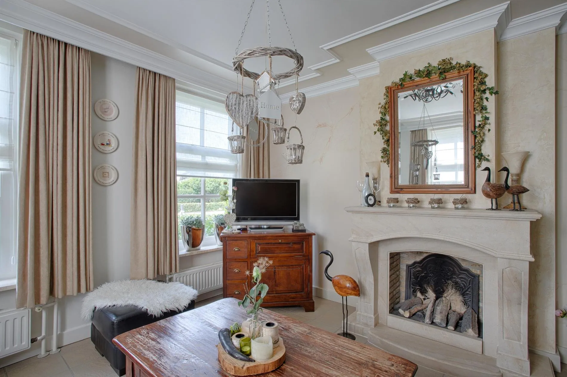 Vanuit de hal komt u in de woonkamer. Deze kamer is afgewerkt met strak gestuukte wanden met sierlijsten, ornamenten en natuurstenen vensterbanken. Er ligt een mooie tegelvloer welke overigens over de gehele begane grond doorloopt. De woonkamer beschikt over een zithoek, een eethoek, gezellige gashaard en openslaande tuindeuren. Vanuit de woonkamer komt u in de woonkeuken. De keuken in hoekopstelling beschikt over een inductiekookplaat, oven, combimagnetron, afzuigkap, vaatwasser (Miele), dubbele RVS spoelbak en voldoende bergruimte. Op de vaatwasser na is alle apparatuur van het merk Bauknecht. Daarnaast is er een bergkast onder de schuinte van de trap, en bevind zich achter de keuken nog een bijkeuken. In de bijkeuken zitten de aansluitingen voor de wasmachine en droger, er bevindt zich een wastafel en er is bergruimte. Tevens kunt u vanuit de bijkeuken de achtertuin bereiken.