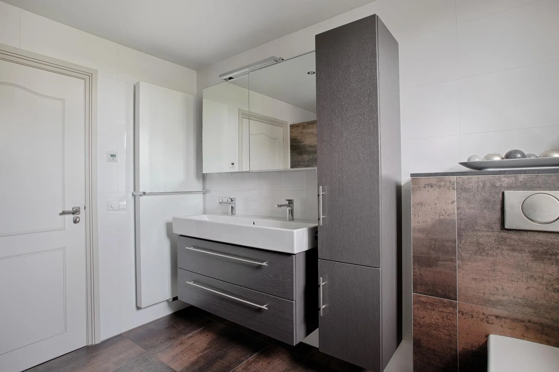 Alle slaapkamers zijn voldoende ruim en qua afwerkingsniveau hetzelfde. Enkele slaapkamers zijn voorzien van inbouwkast of dubbele inbouwkasten en televisieaansluitingen. De badkamer is volledig betegeld en voorzien van een dubbele wastafel, zwevend toilet, urinoir, inloopdouche, mechanische en natuurlijke ventilatie, inbouwspots en vloerverwarming.