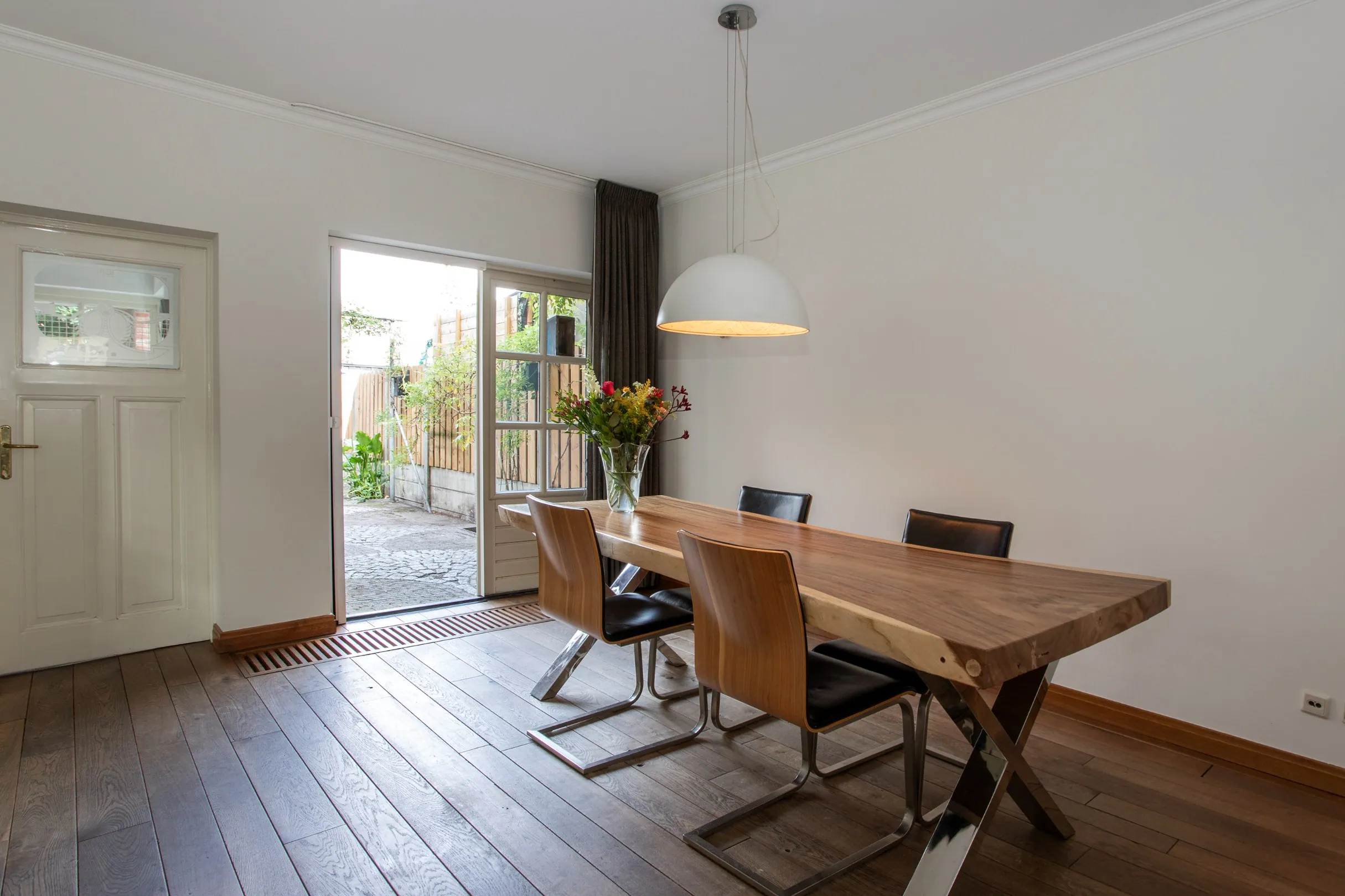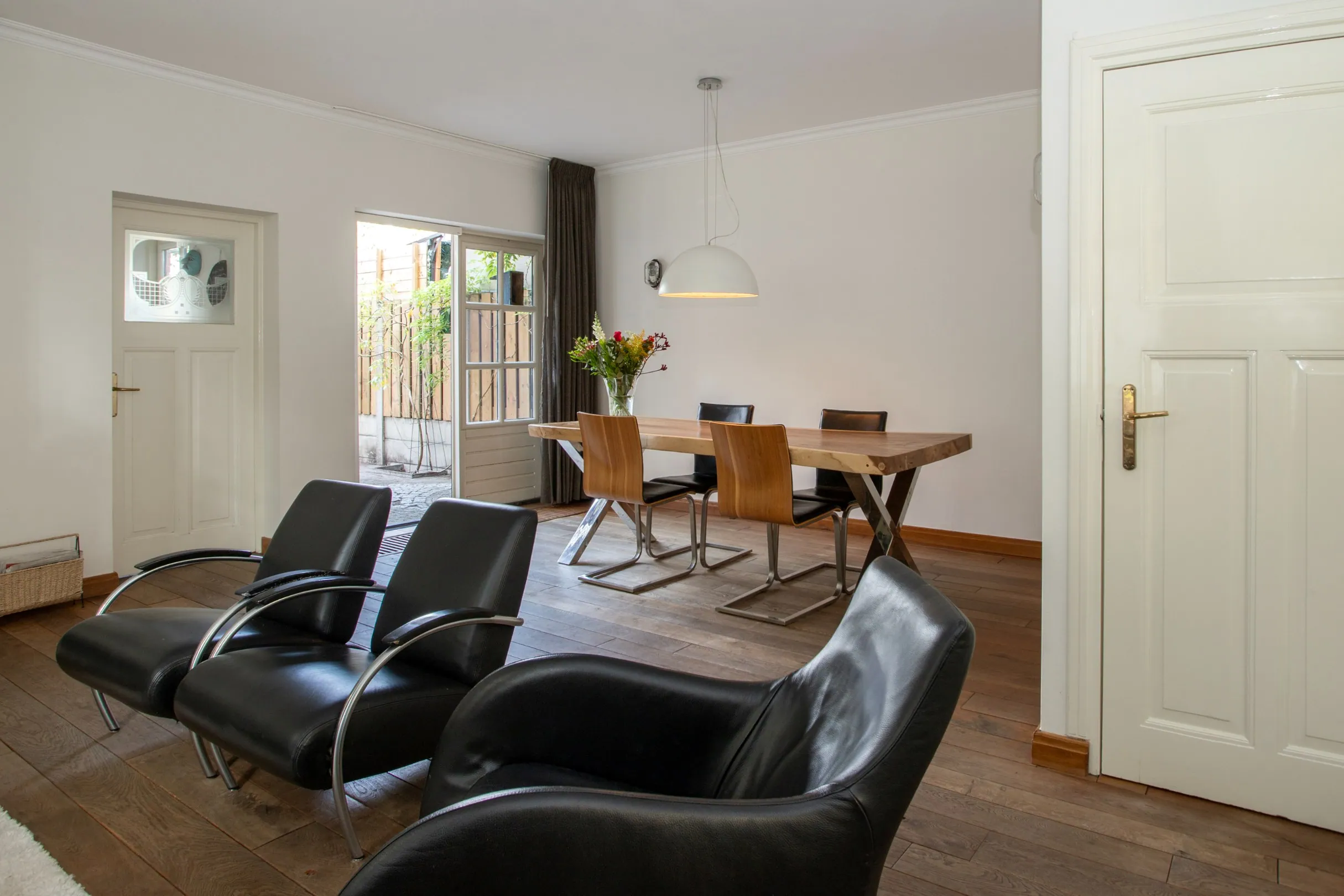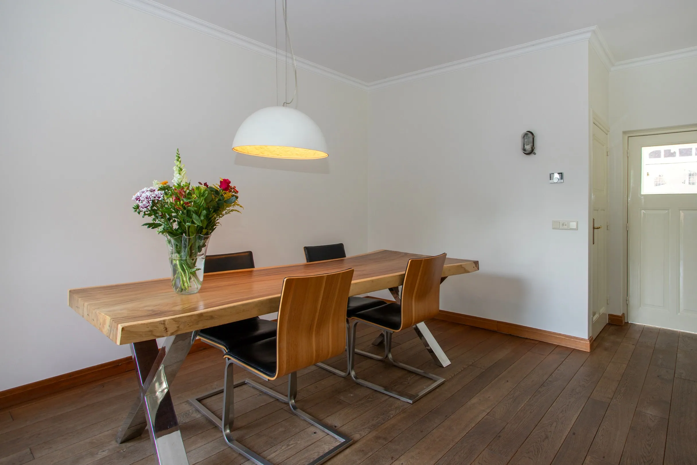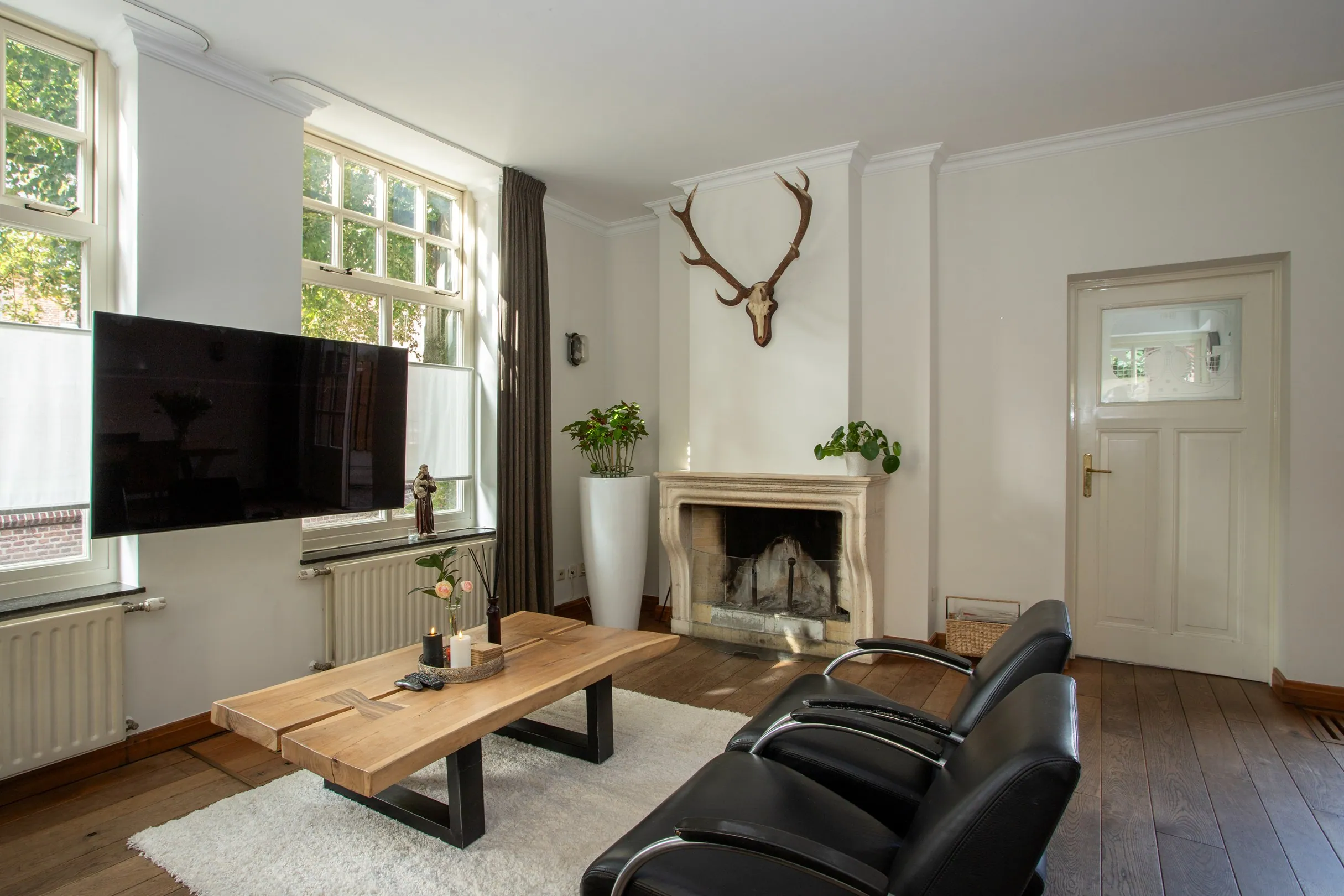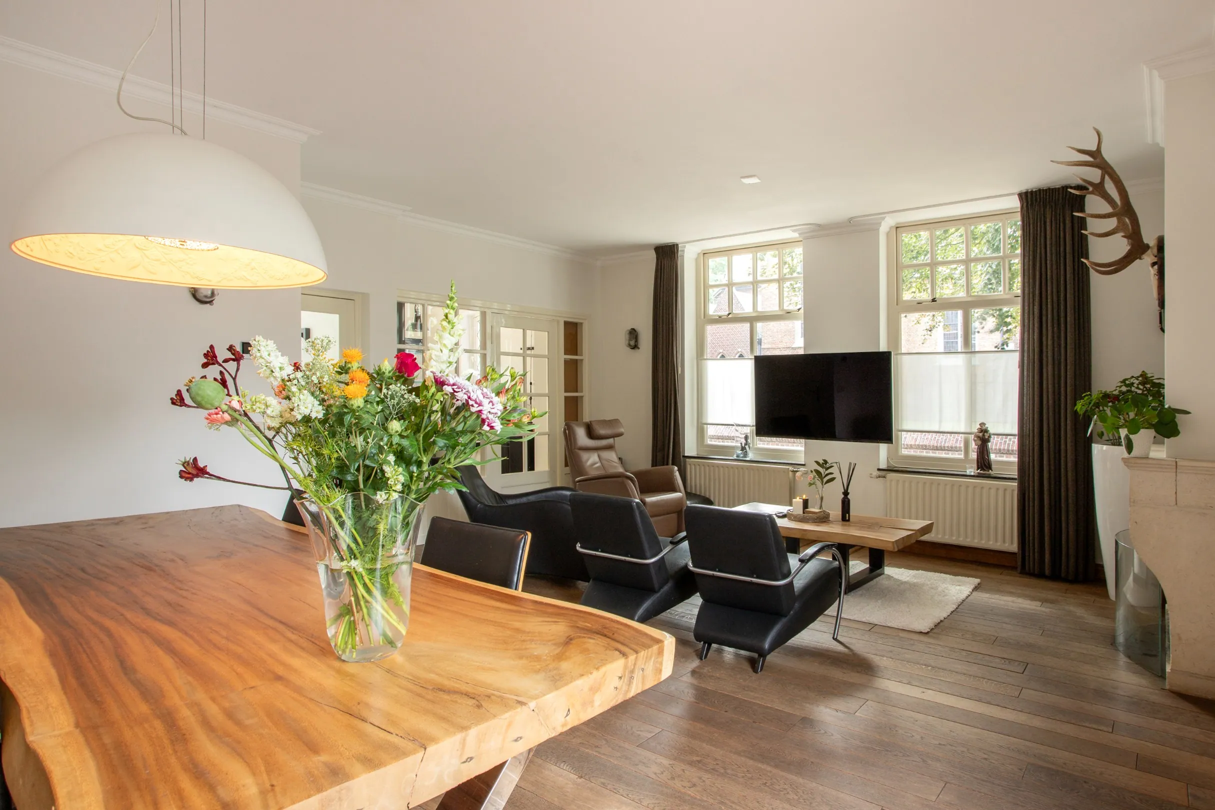 De woonkamer is royaal opgezet en biedt volop ruimte voor een comfortabele zit- en eethoek. Blikvanger is de fraaie zandstenen schouw, geschikt voor houtstook. Grote raampartijen zorgen voor veel lichtinval én een schitterend uitzicht op de kerk van Diessen. De kamer is afgewerkt met een massief houten vloer, gestucte wanden, hoge plafonds en beschikt over een praktische trapkast. Via openslaande tuindeuren stapt u zo de achtertuin in.