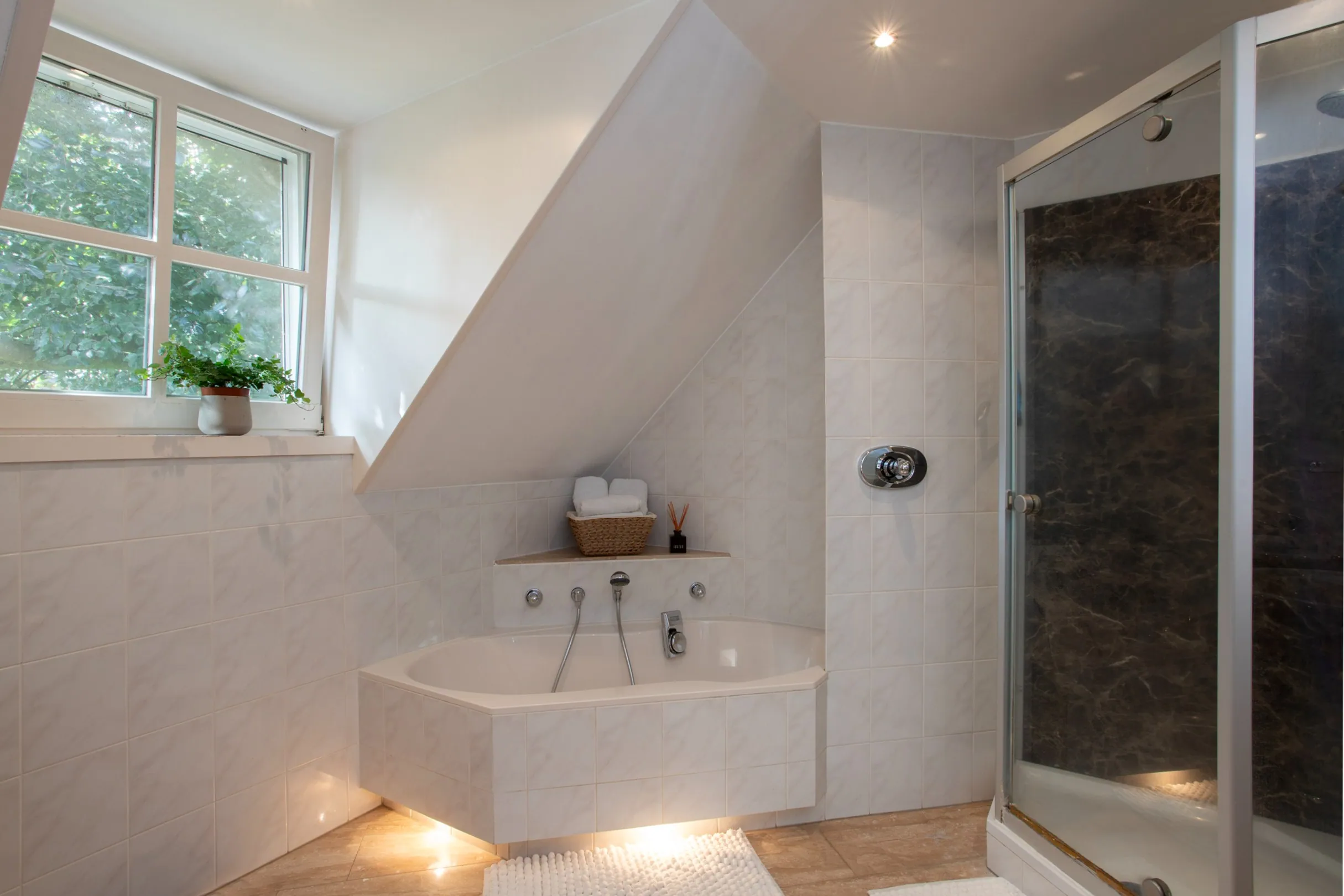 Alle slaapkamers zijn netjes afgewerkt met een massieve houten vloer, gestucte wanden en beschikken over karakteristieke raampartijen met houten binnenluiken. De kamers zijn van goed formaat, waarbij de ouderslaapkamer extra ruim is. De badkamer is opvallend ruim en uitgerust met twee wastafels, een douchecabine, ligbad en een dakkapel. De ruimte is volledig betegeld met travertintegels op de vloer en voorzien van vloerverwarming.