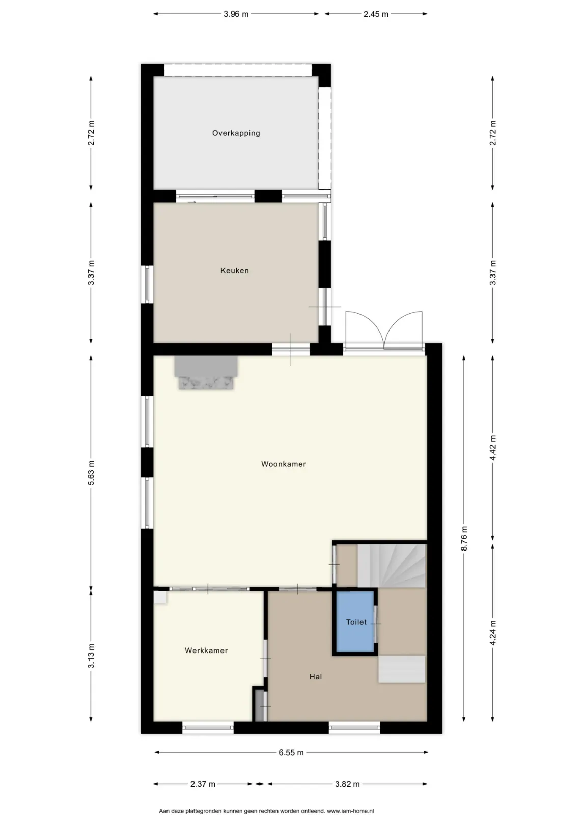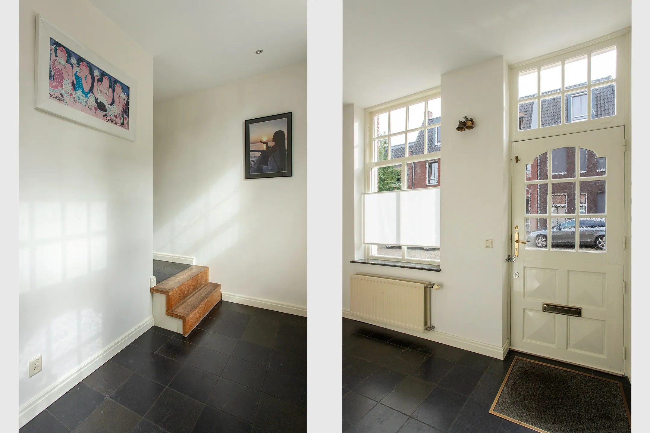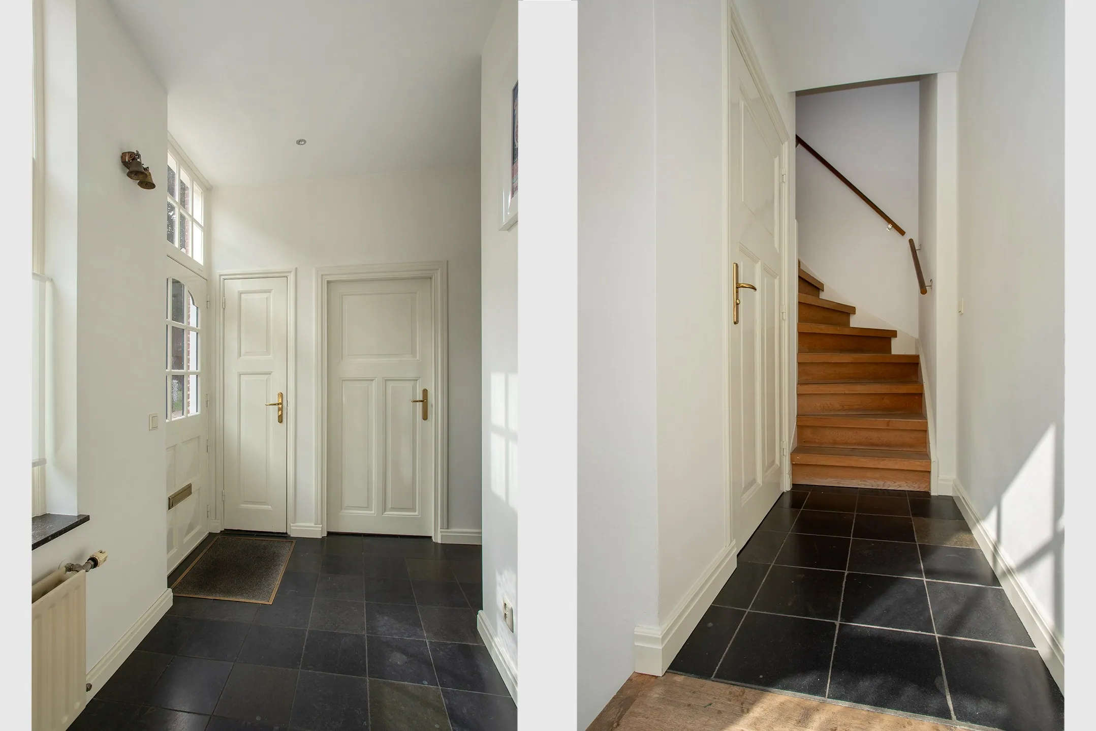 U komt binnen via een ruime en lichte hal met tegelvloer. Hier bevinden zich de trap naar de eerste verdieping, de meterkast (voorzien van 9 groepen), een separate toiletruimte en een handige garderobenis. Vanuit de hal heeft u toegang tot zowel de voorkamer als de woonkamer.