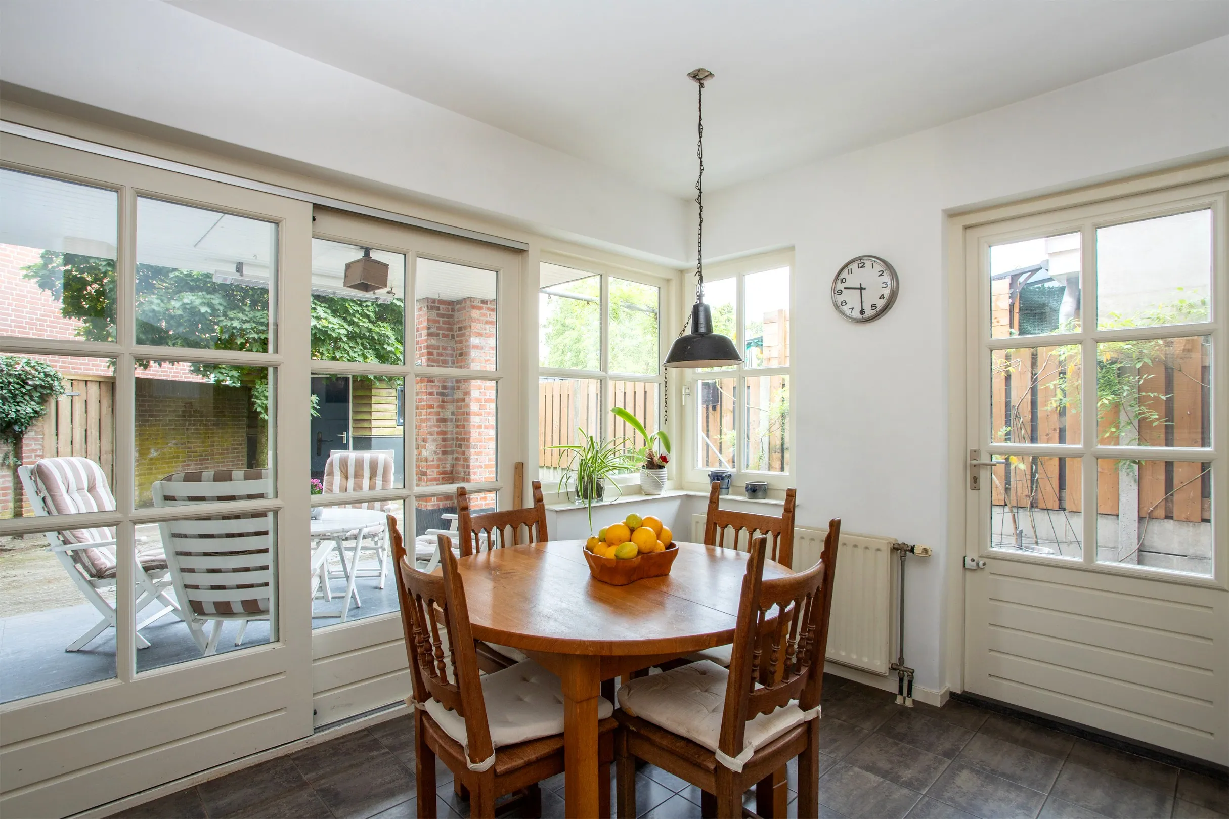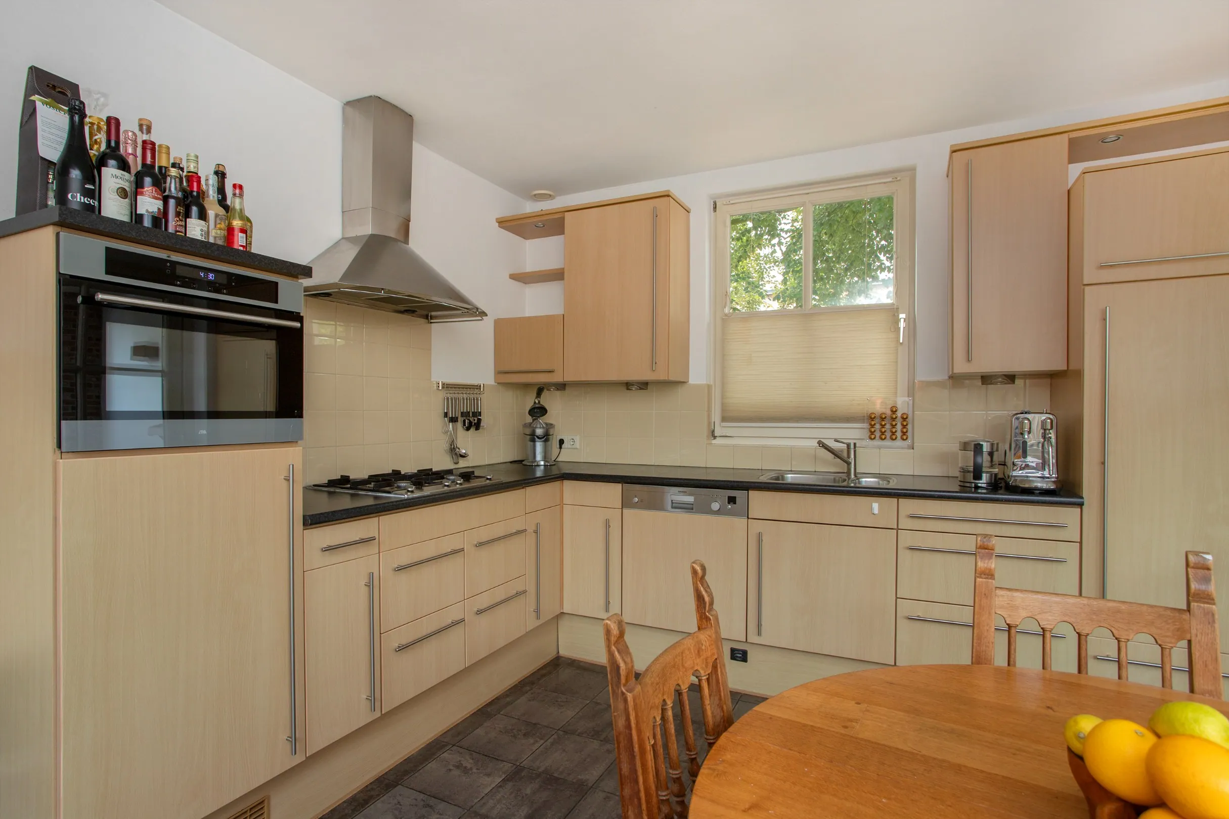 De (woon)keuken ligt aansluitend aan de woonkamer en is een prettige, lichte ruimte dankzij meerdere raampartijen met uitzicht op de tuin. De keuken is opgesteld in een hoek en voorzien van diverse inbouwapparatuur: een 4-pits gasfornuis met afzuigkap, vaatwasser, koelkast, vriezer en combioven.