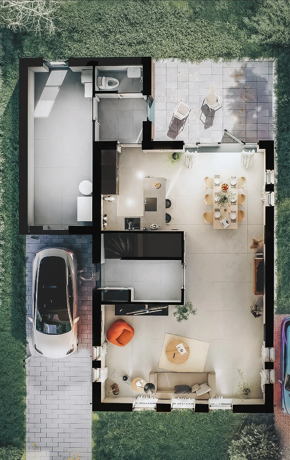 - U-vormige leefruimte met nog te realiseren keuken aan de achterzijde en tuindeuren naar de achtertuin.