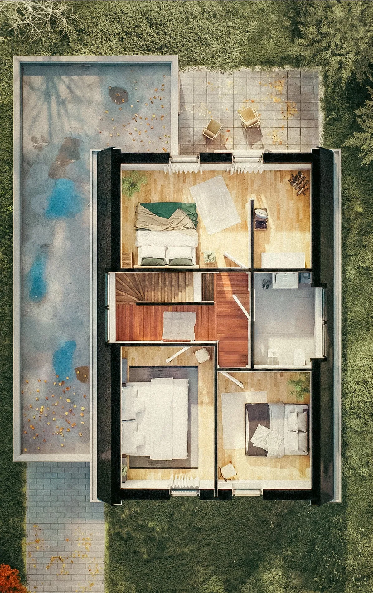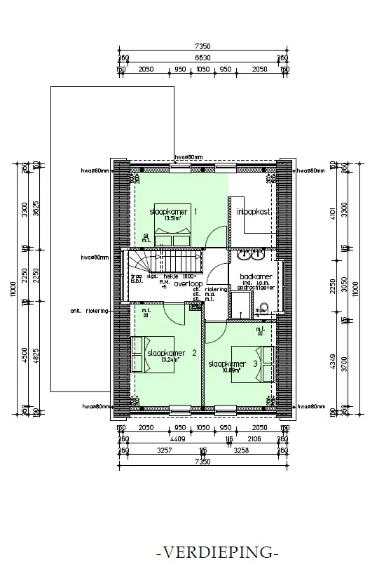 - Overloop met toegang tot 3 slaapkamers, de badkamer en de vaste trap naar de zolder