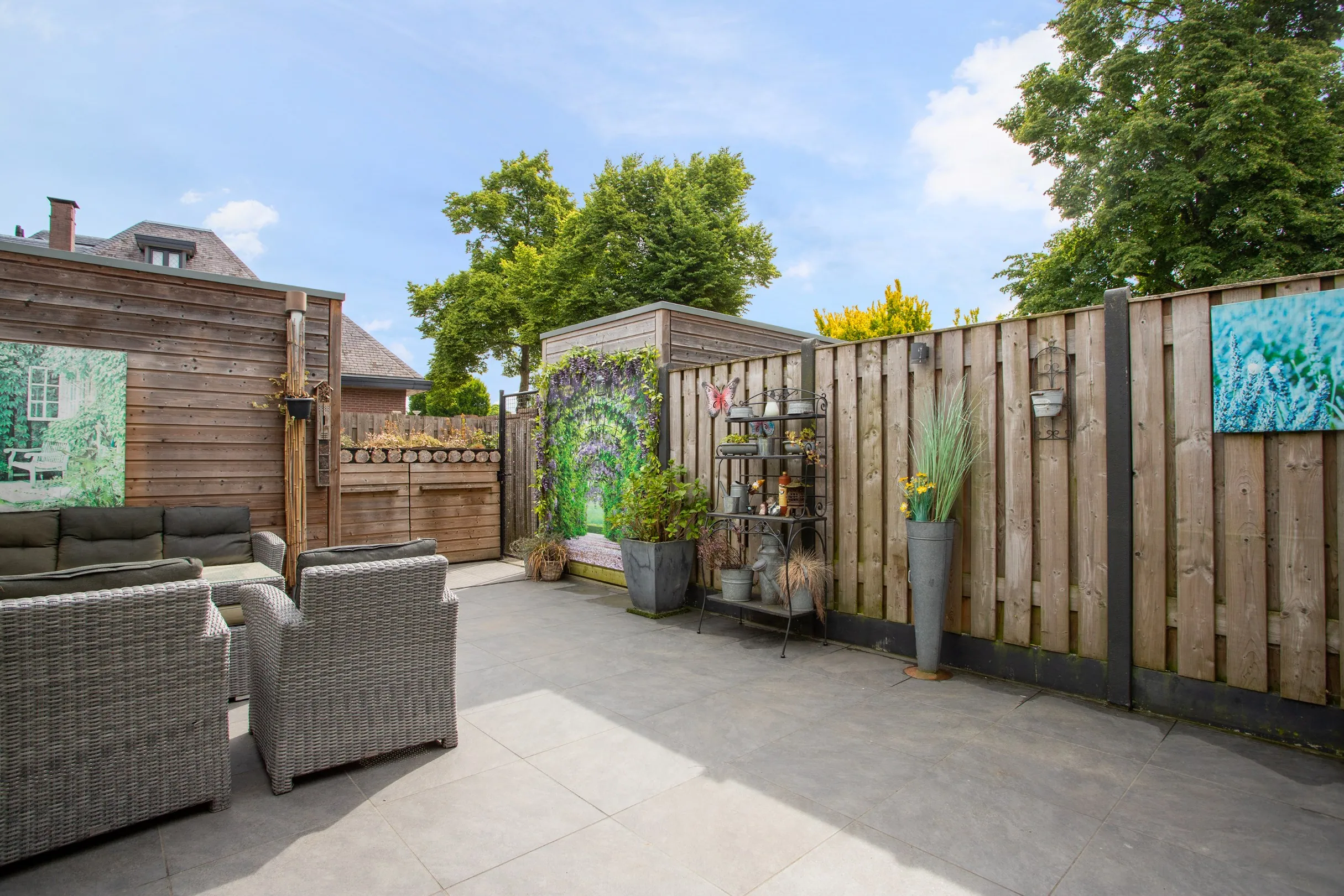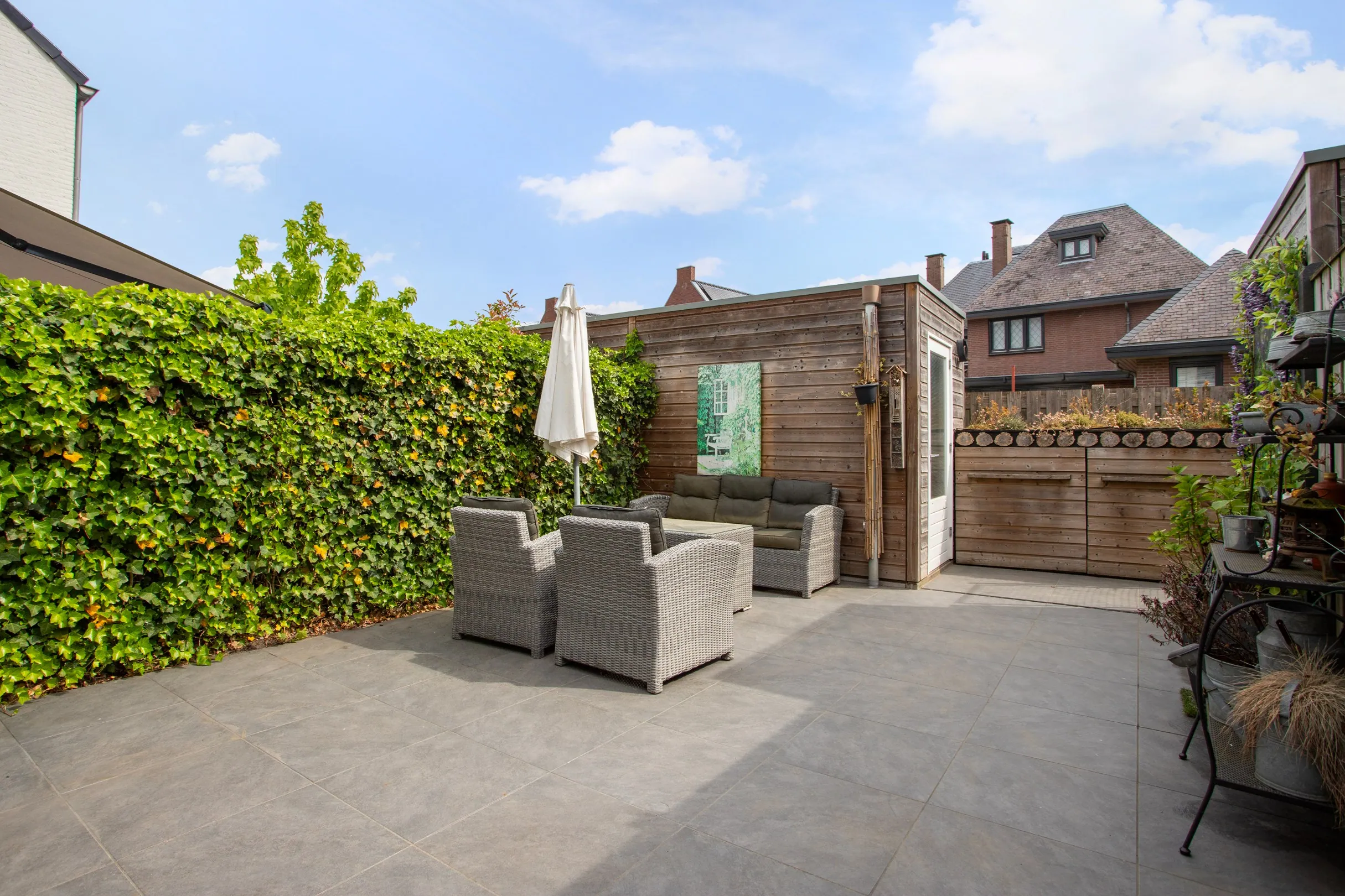 De achtertuin is volledig verhard met grote tegels en uitgerust met een draineergoot in verband met de afwatering. In de achtertuin bevindt zich verder een containeropslagkast. De voortuin bestaat uit sierbestrating en kiezels.