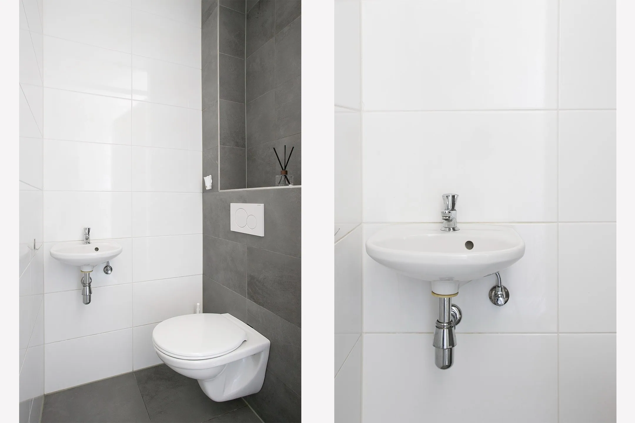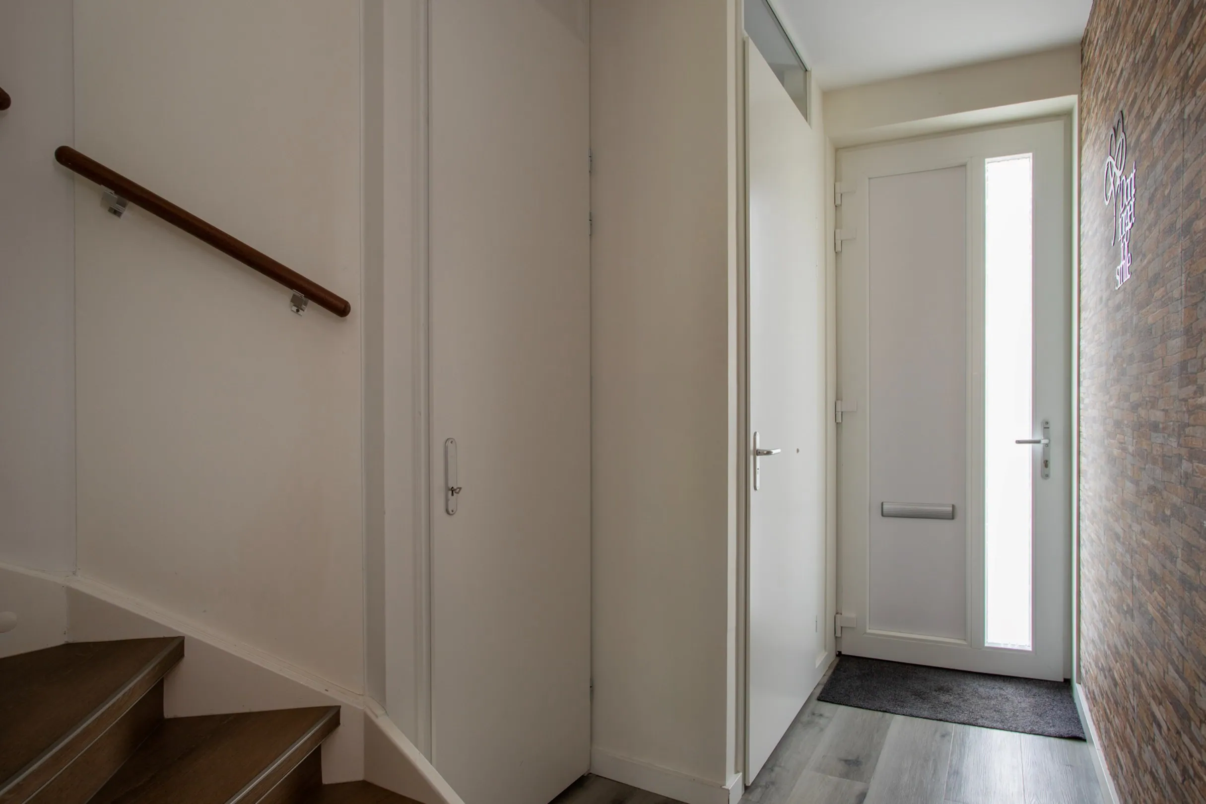 Hal/entree met trapopgang naar de 1e verdieping, meterkast (10 groepen en 2 aardlekschakelaars), toilet met fonteintje en toegang tot de woonkamer/keuken.