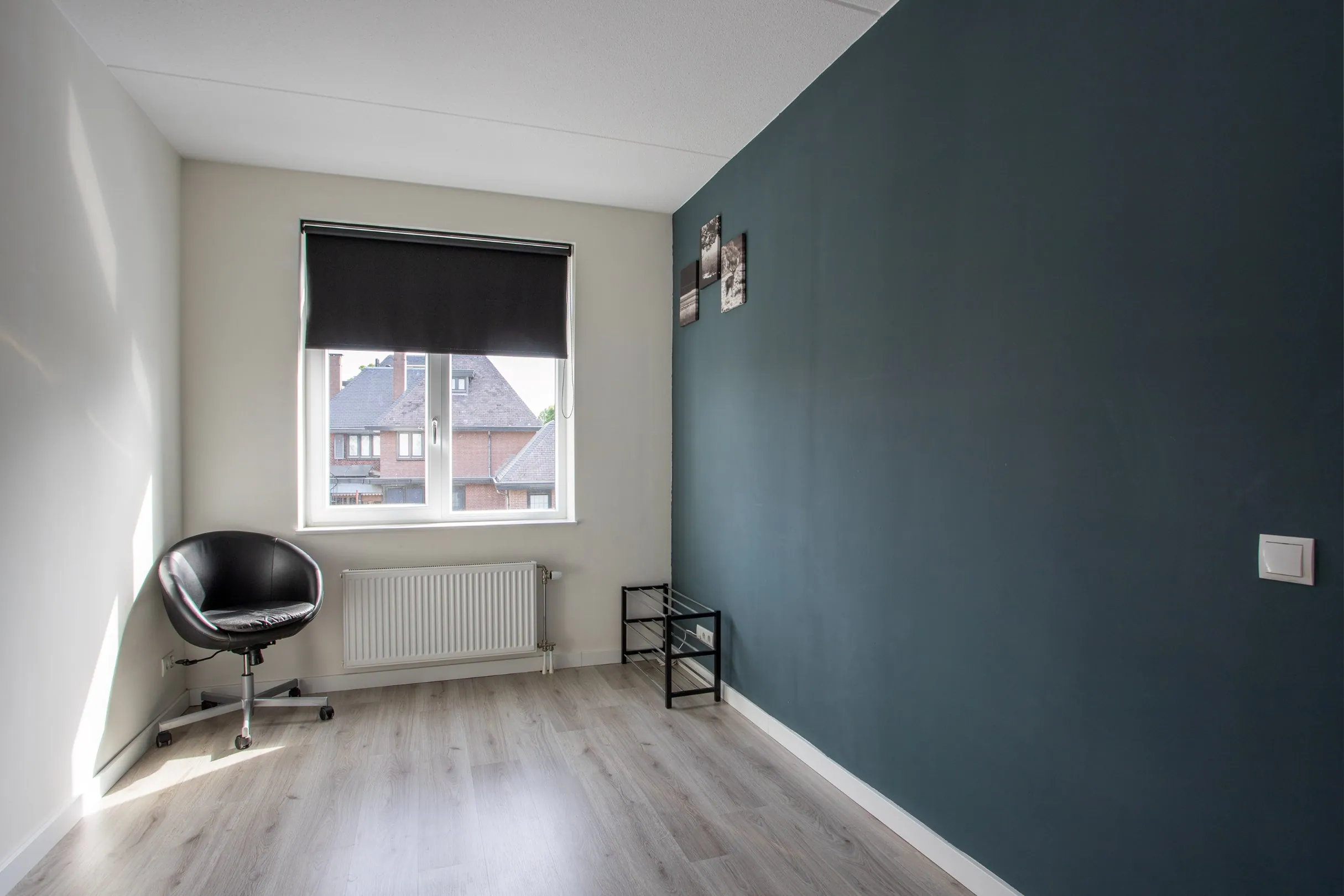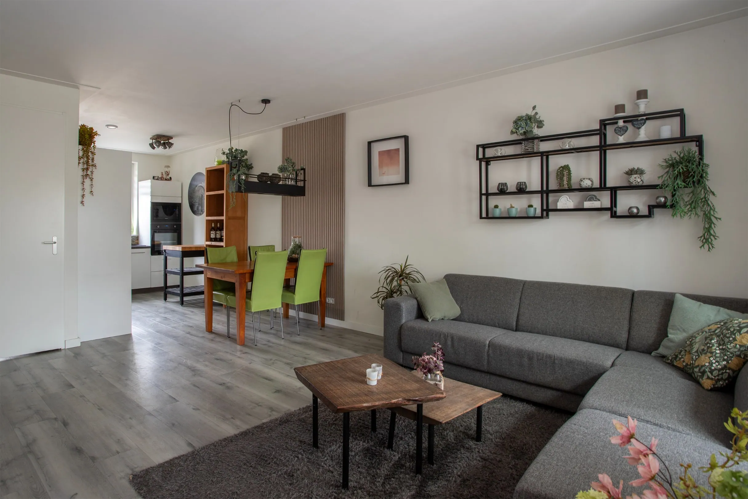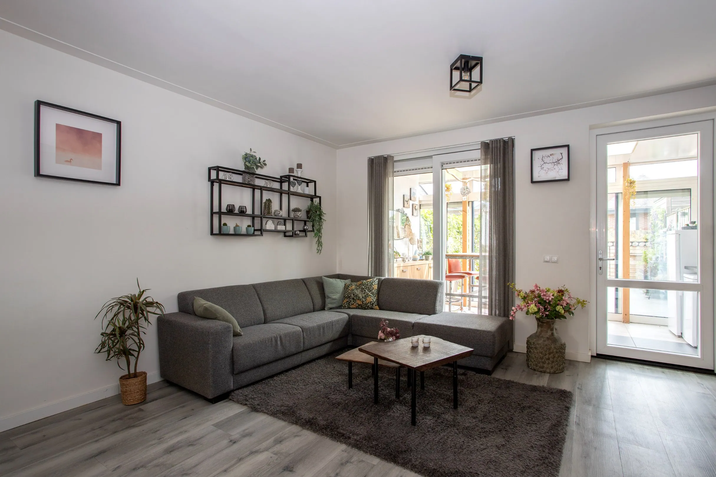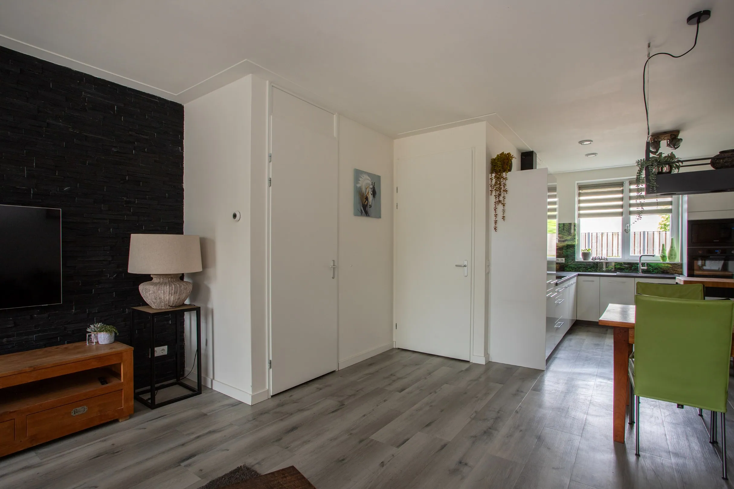 De woonkamer is uitgevoerd met een schuifpui en heeft voldoende natuurlijk lichtinval. Naast de schuifpui heeft de woonkamer een deur naar de achtertuin. In de woonkamer bevindt zich een trapkast/provisiekast met hierin de vloerverwarmingsunit.