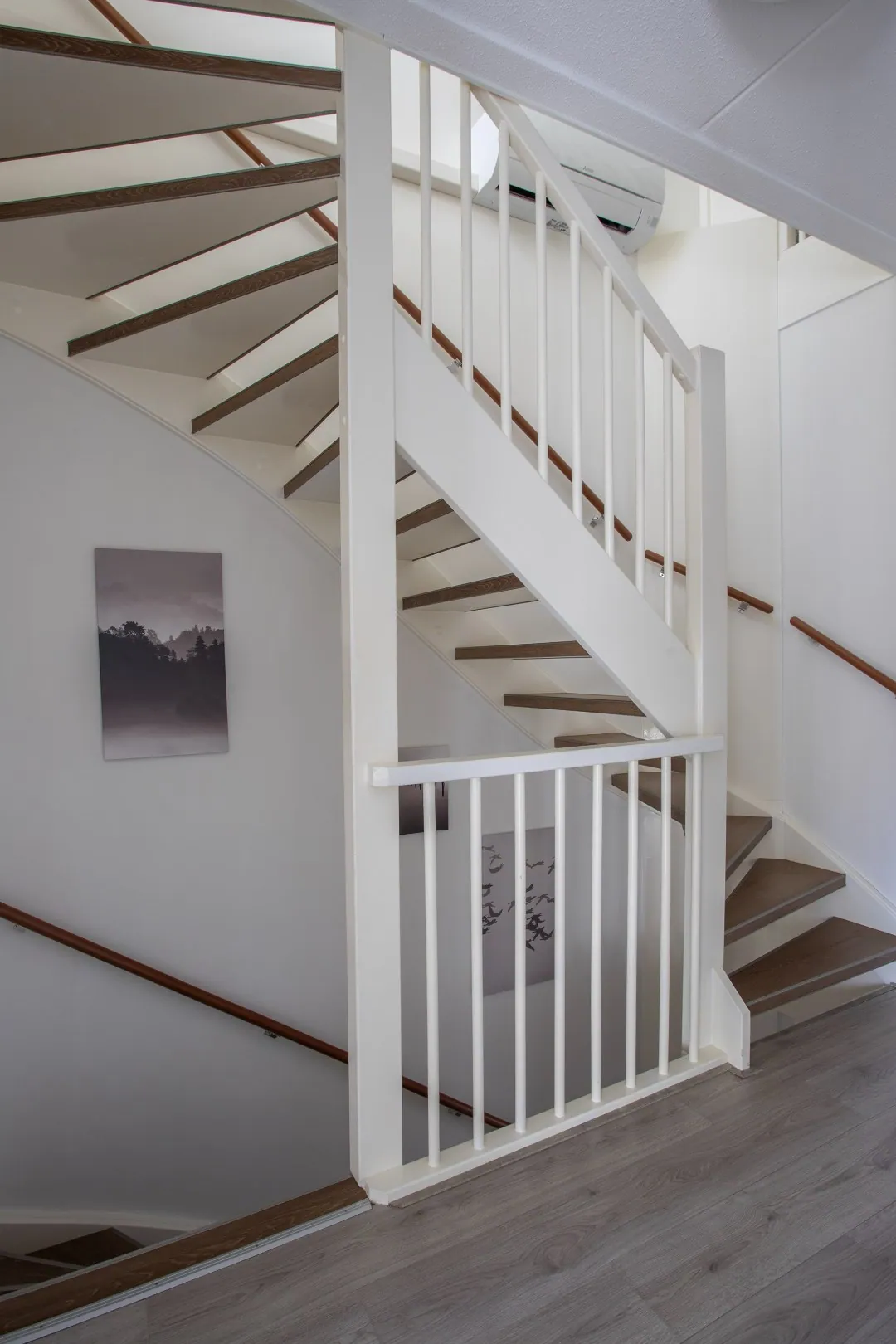 Airco-unit op de overloop/trappengat naar de 2e verdieping, gesitueerd voor zowel de koeling als verwarming van de 1e verdieping en de zolderruimte.