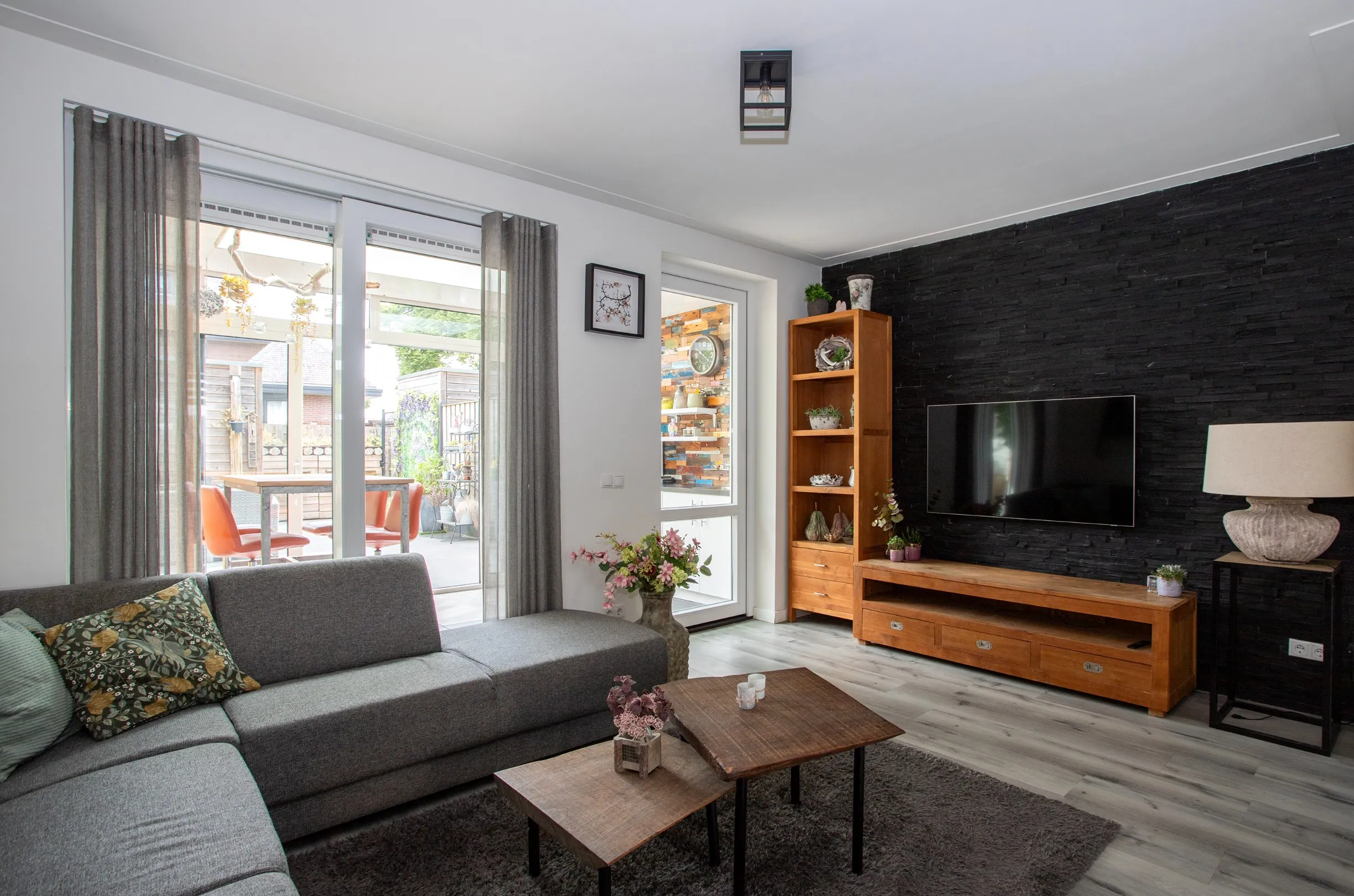 Achter de woning is een aluminium overkapping geplaatst over de gehele breedte van de woning, met een schuifpui naar de achtertuin en een lichtstraat.