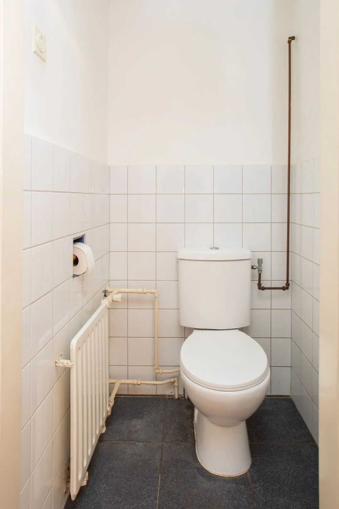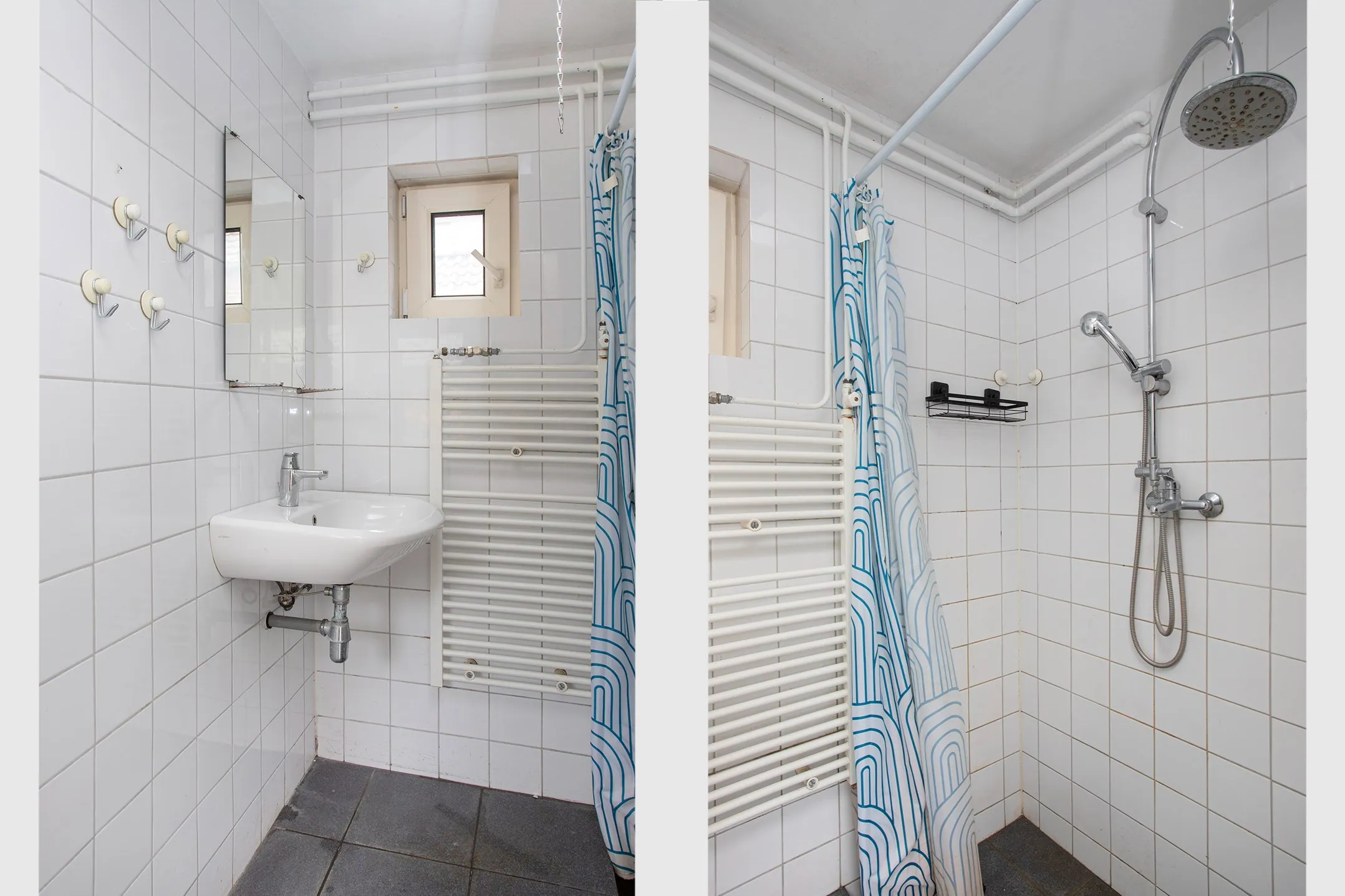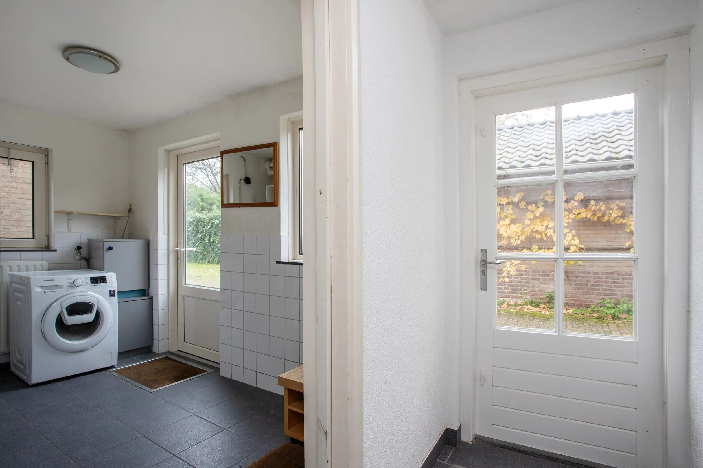 Achter de keuken ligt een portaal met een vaste opbergkast, dat leidt naar de halfhoog betegelde bijkeuken. Hier bevinden zich de aansluitingen voor de wasmachine en droger en de Cv-ketel (Nefit, 2020). Vanuit de bijkeuken zijn zowel het toilet als de badkamer met douche en wastafel bereikbaar. Beide ruimtes beschikken over natuurlijke ventilatie.