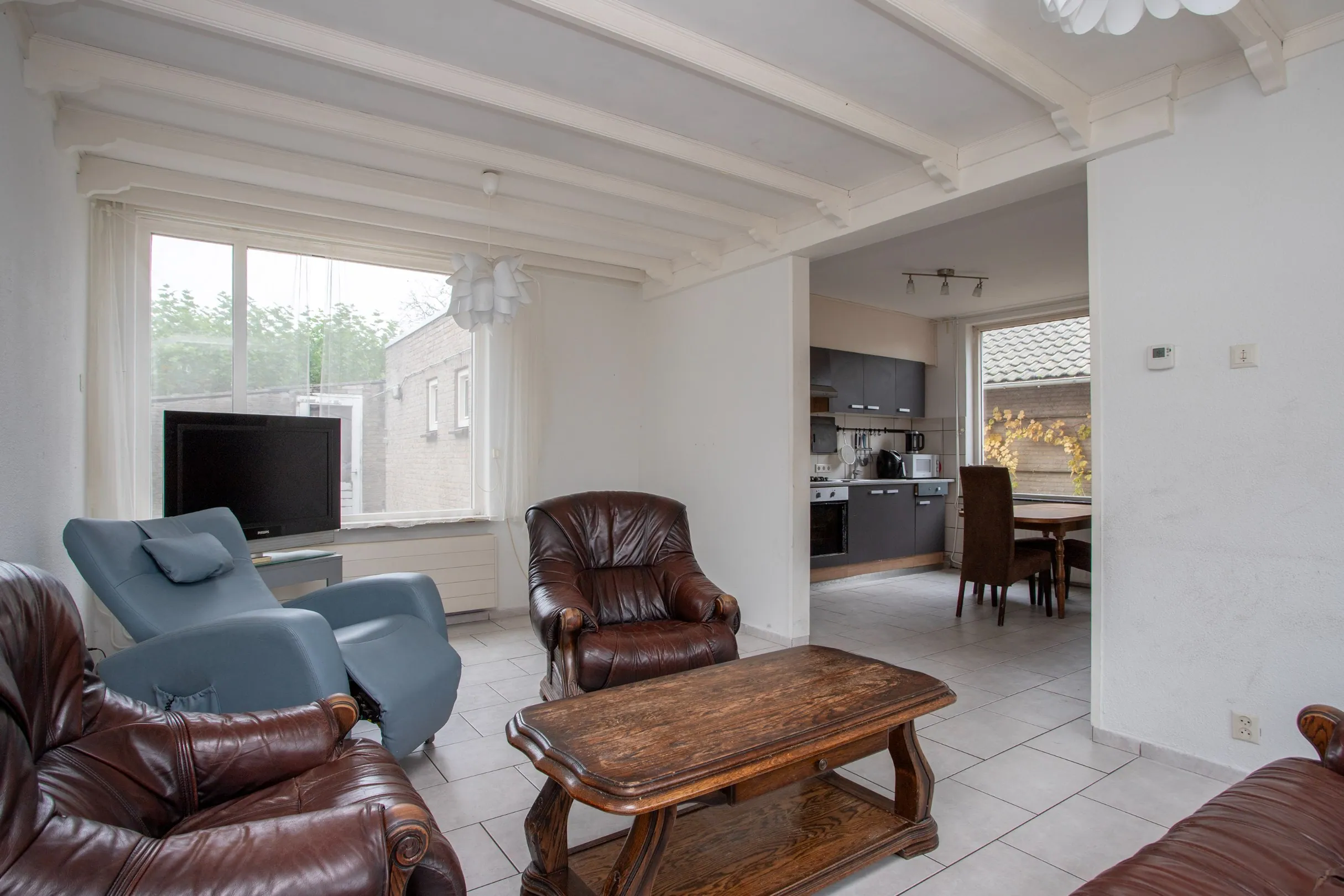 In de leefruimte bevindt zich de woonkeuken met rechte keukenopstelling, die in open verbinding staat met de woonkamer. De keuken is voorzien van een 4-pits gasstel, afzuigkap, en oven, en biedt toegang tot een ruime kelder. De woonkamer is een doorzonkamer met grote raampartijen aan zowel de voor- als achterzijde, waardoor er veel natuurlijk licht binnenkomt.