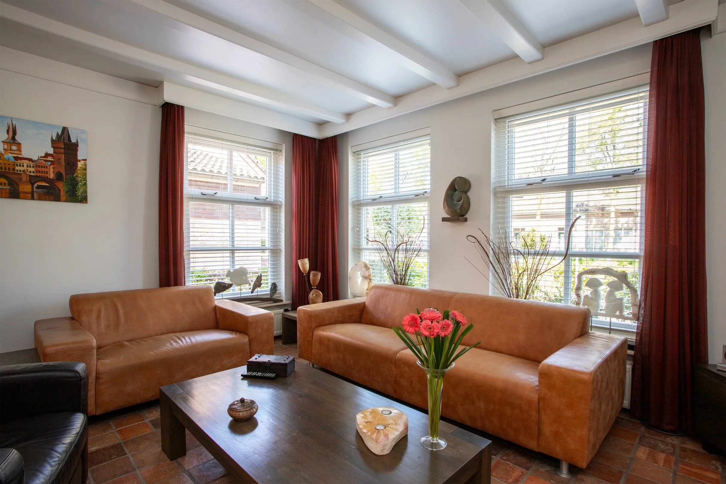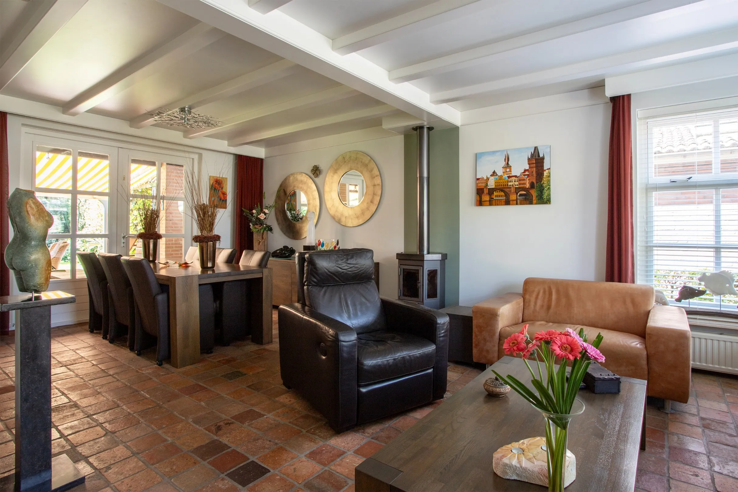 The bright living room features multiple windows and French doors leading to the covered terrace and garden. A wood-burning stove adds cozy, additional warmth when desired. The walls are smoothly plastered.