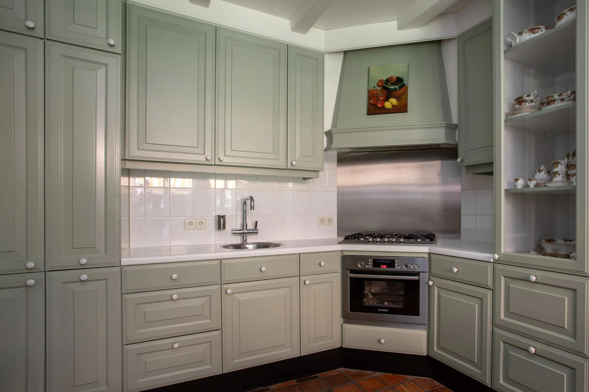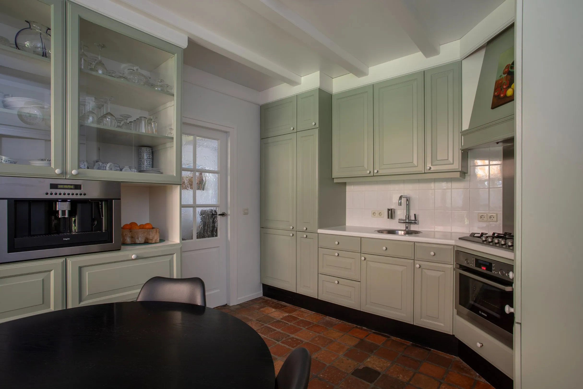 The closed kitchen is fitted with a corner layout and includes ample appliances, including a built-in coffee machine. It also has French doors opening to the covered terrace and garden.