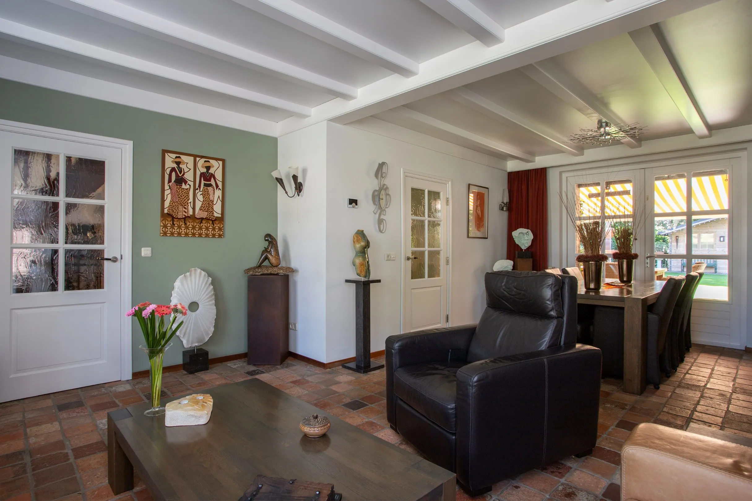 Behind the house, a stylish covered terrace has been installed, complete with patio heating and a retractable sunshade to shield from the strongest sun.