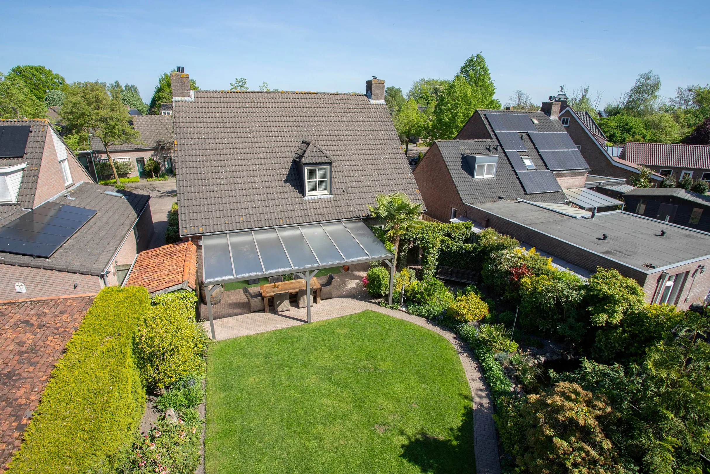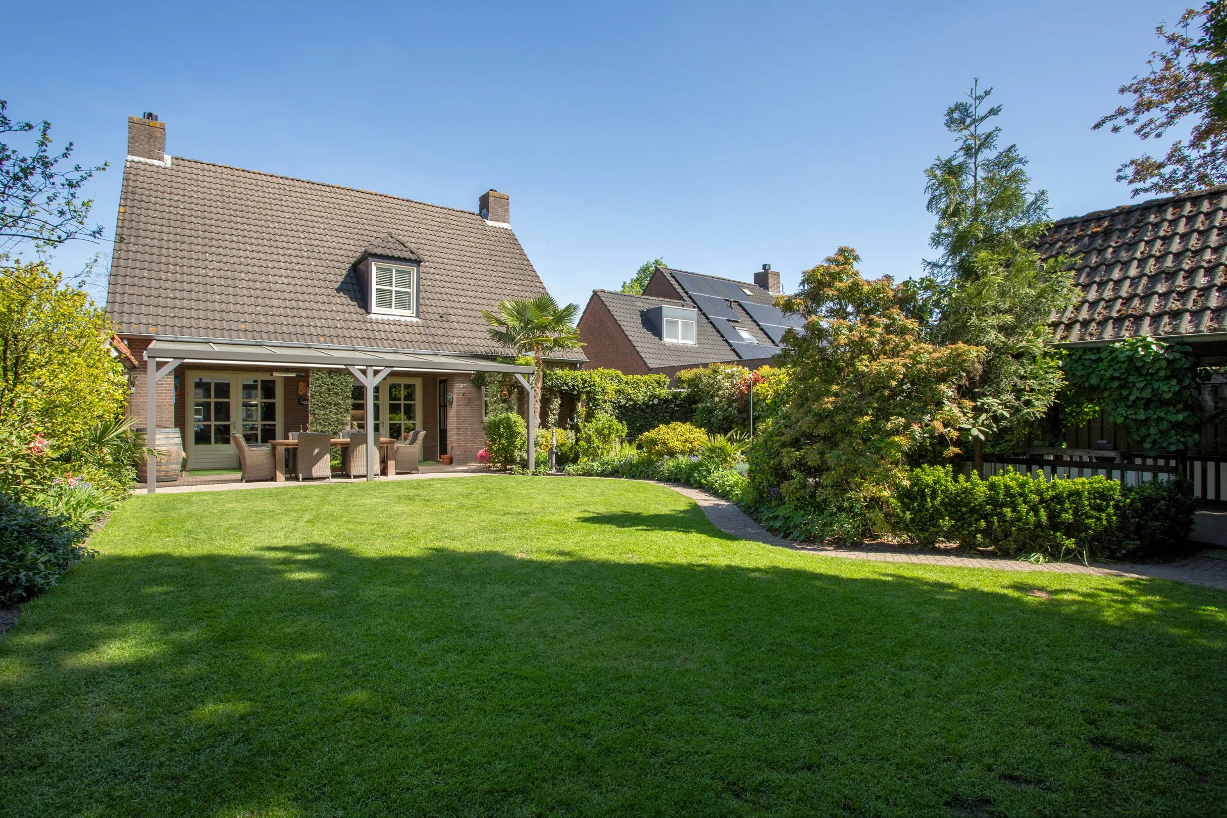 Als je vanuit de woning de tuin in loopt ervaar je ruimte, rust en (bij mijn bezoek) een heerlijke zon. Hier ontkom je niet aan het vakantiegevoel. Achter de woning is een mooie overkapping met terrasverwarming geplaatst met een mogelijkheid de ergste zonneschijn weg te houden door een zonneluifel onder de overkapping.