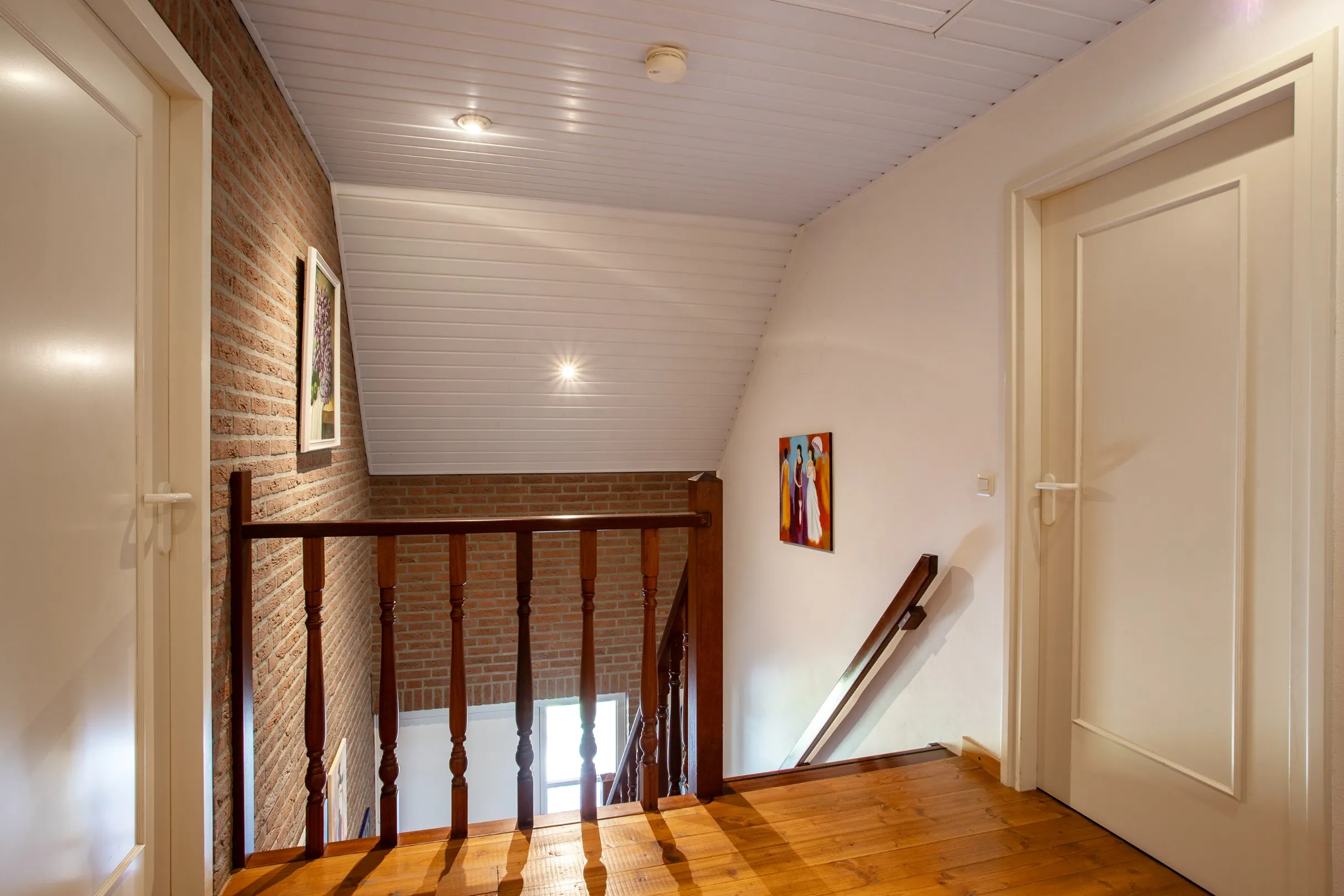 Via een mooie open houten trap kom je op de overloop van de 1e verdieping. Hier heb je toegang tot 4 slaapkamers, badkamer en toilet. Op de vloer liggen massieve houten planken en de wanden zijn gestukt. Op deze verdieping is eveneens dubbele beglazing aanwezig. De 4 slaapkamers verschillen van afmetingen, maar zijn allemaal van een royaal tot zelfs groot formaat. De slaapkamers hebben bergruimte onder de dakschuinte en op één kamer is een grote inbouwkast gemaakt.