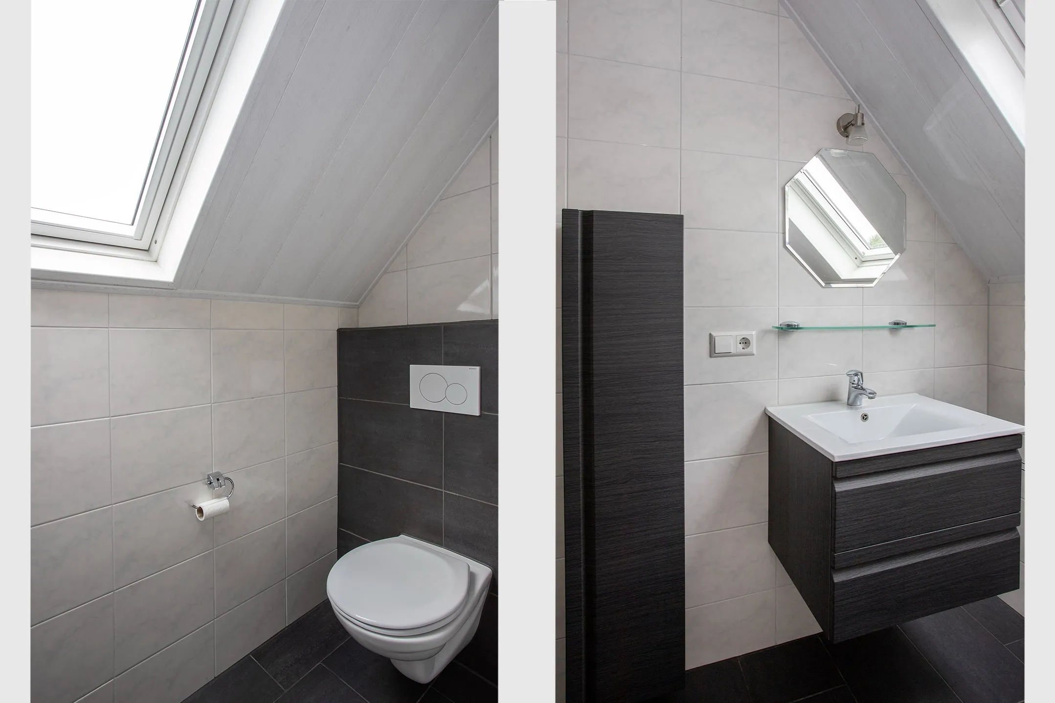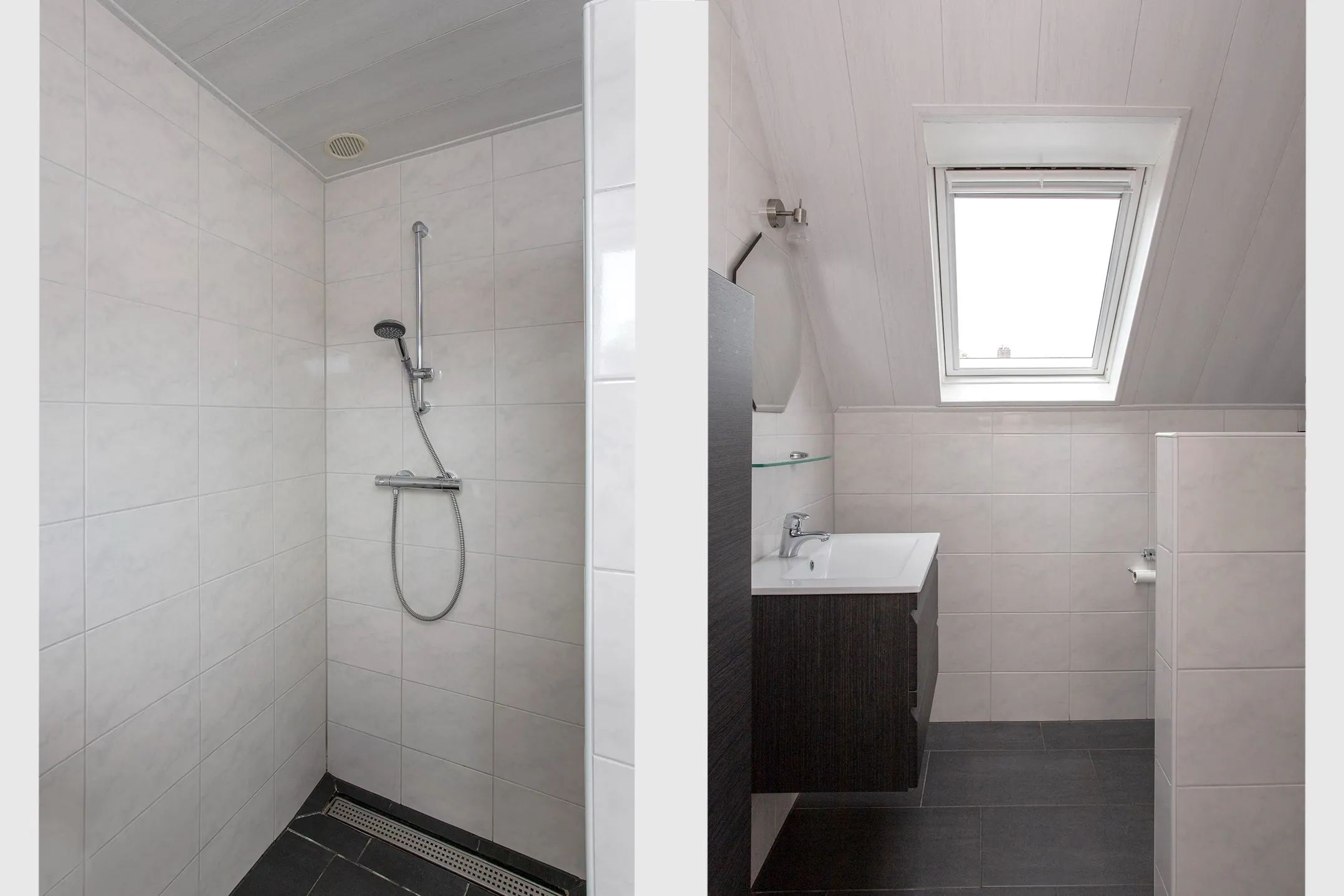De badkamer is volledig betegeld en voorzien van een kunststof Velux-dakraam en mechanische ventilatie. De inrichting bestaat uit een wastafel met mengkraan op een meubel met twee soft-close lades, een spiegel met verlichting, een badkamerkast, een wandcloset, een designradiator en een inloopdouche met thermostaatkraan.