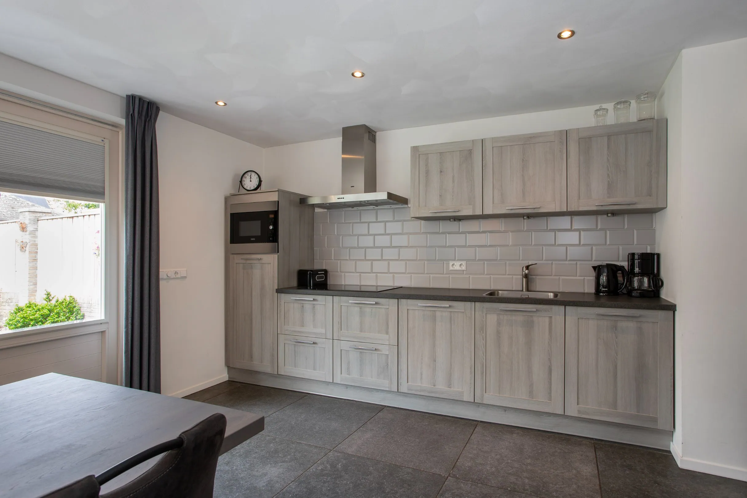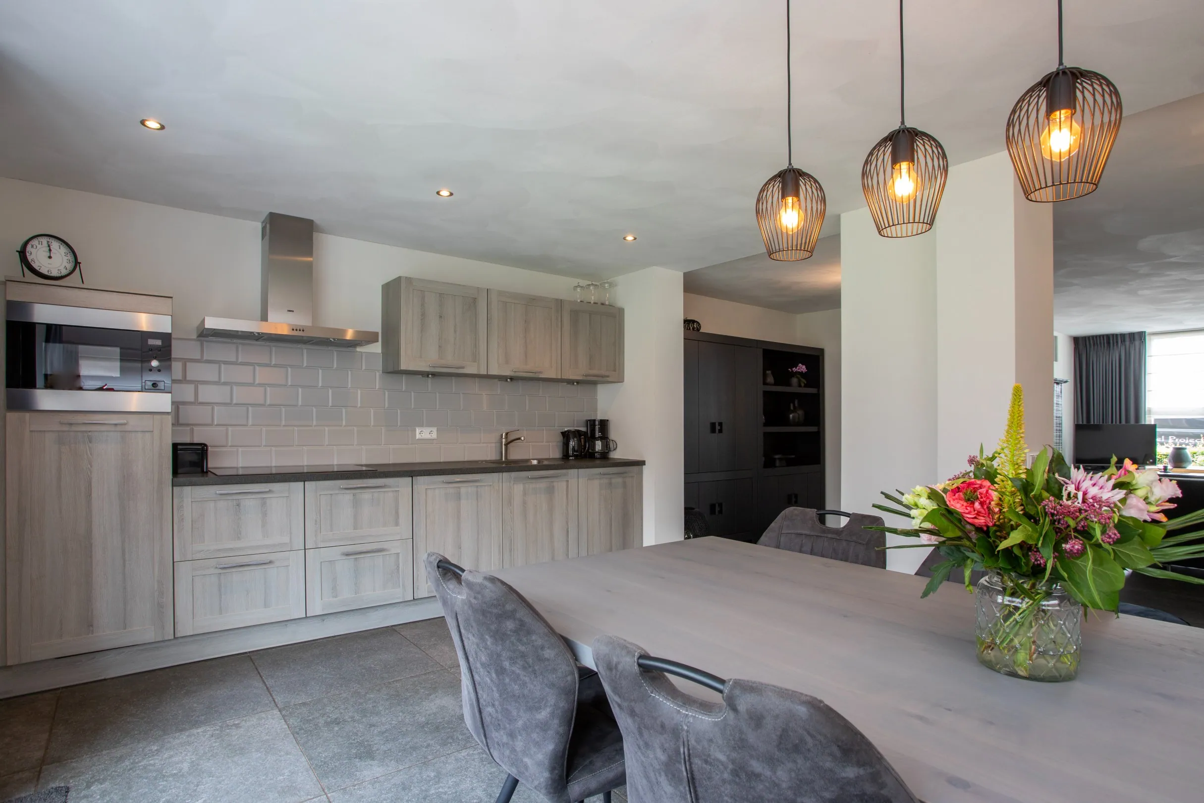 De woonkamer loopt vloeiend over in de uitgebouwde open keuken, vernieuwd in 2019 en uitgerust met drie inbouwspots. De keuken is uitgevoerd in neutrale tinten en voorzien van diverse apparatuur, zoals een 5-pits inductiekookplaat, combi-oven, koelkast, vaatwasser, afzuigkap, RVS-spoelbak en ruime opbergmogelijkheden.
