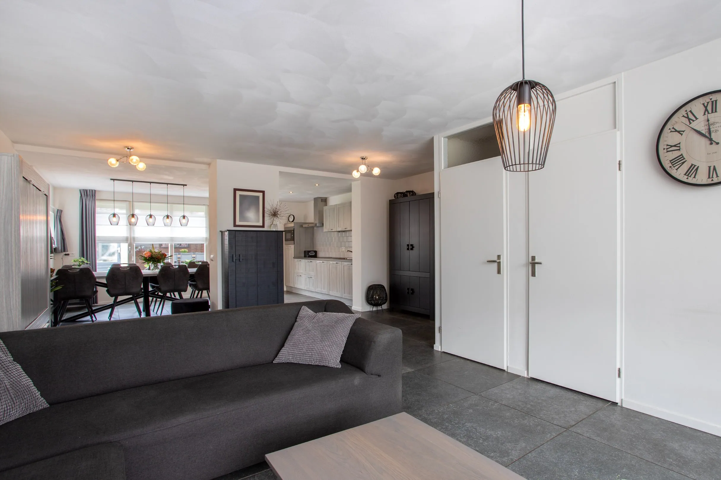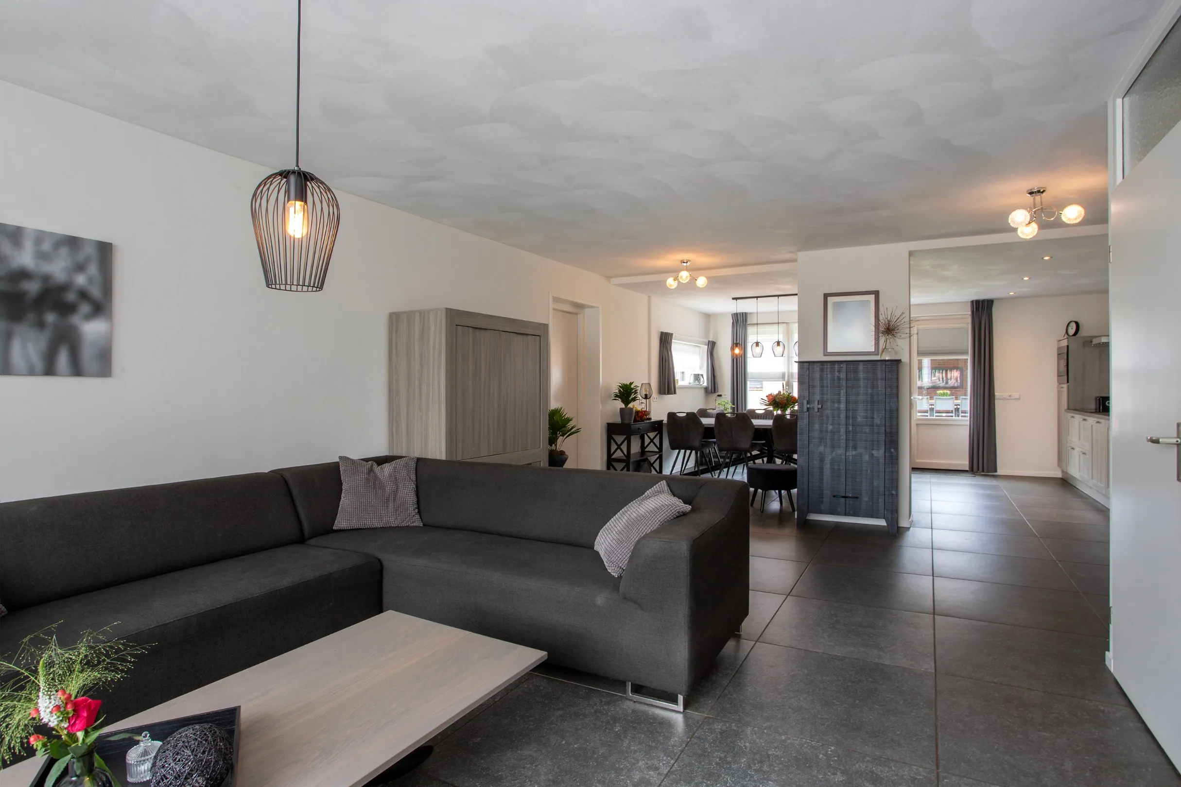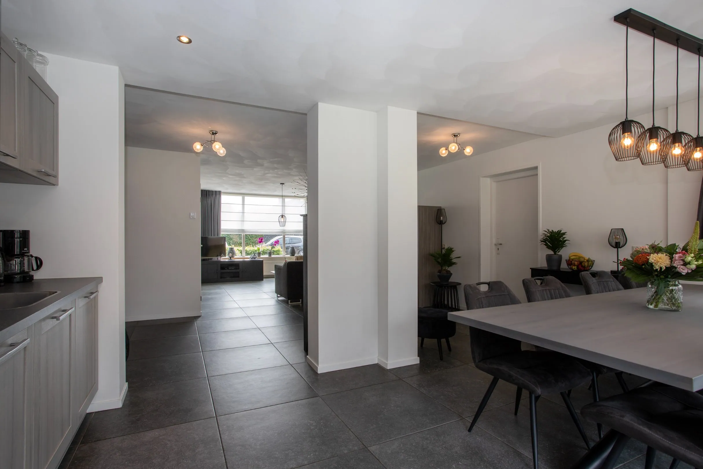 Zodra je binnenstapt, voel je het meteen: ruimte en licht bepalen hier de sfeer. De royale woonkamer en open keuken hebben veel lichtinval dankzij de grote raampartijen aan beide zijden. Alle ramen van de woonkamer en keuken zijn voorzien van kunststof kozijnen met HR++ en HR+++ glas en elektrische rolluiken, met uitzondering van één keukenraam, dat is voorzien van een screen. De moderne tegelvloer met vloerverwarming zorgt voor een luxe en behaaglijke uitstraling. De vloerverwarming ligt over de gehele begane grond, met uitzondering van de bijkeuken.