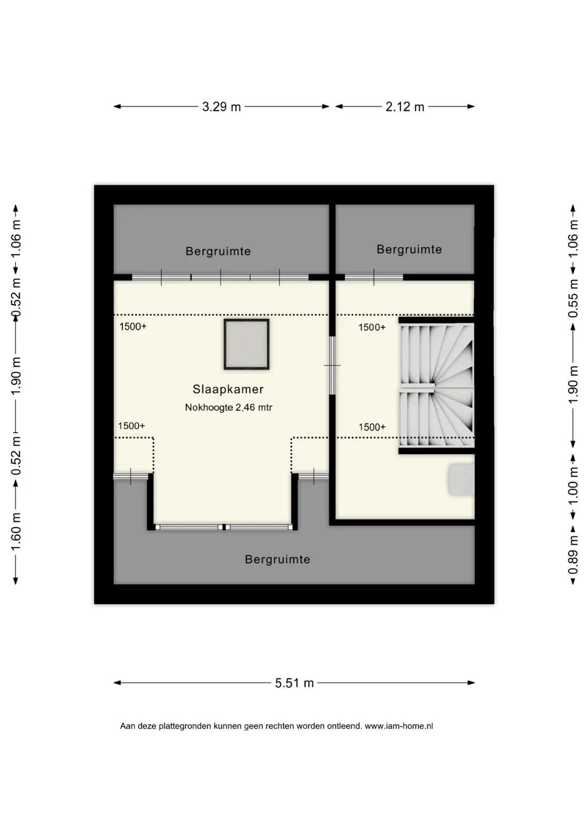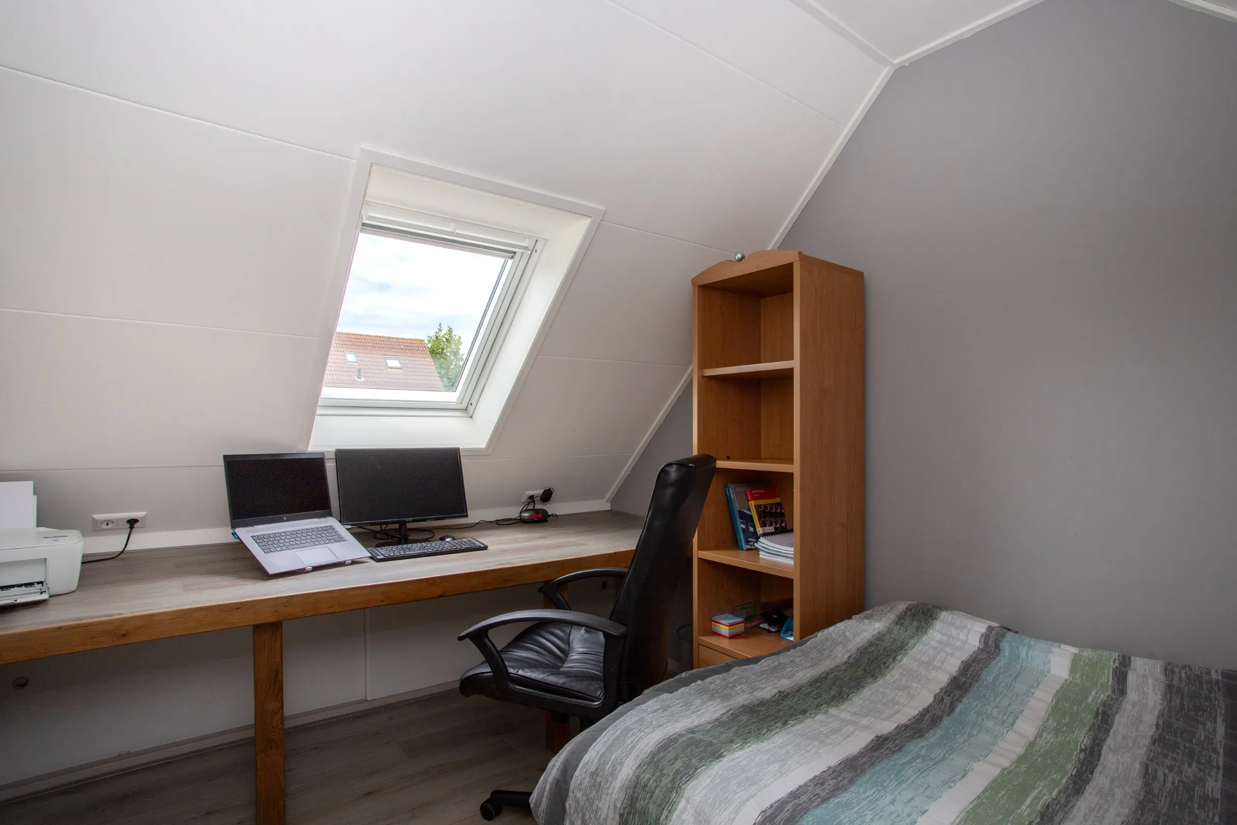 Vanuit de bijkeuken is via een vaste trap een extra (slaap)kamer bereikbaar. Deze kamer is voorzien van een kunststof Velux-dakraam en een laminaatvloer. Een ideale ruimte voor kantoor of logeerkamer.