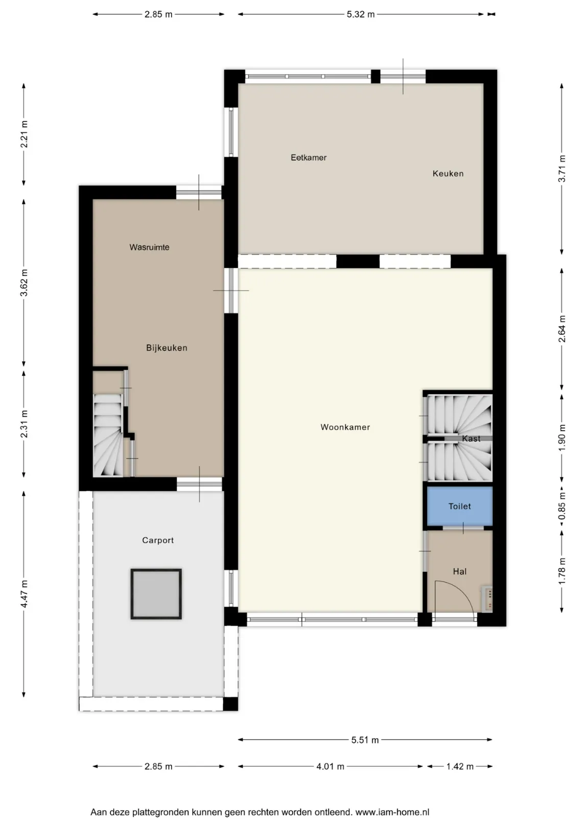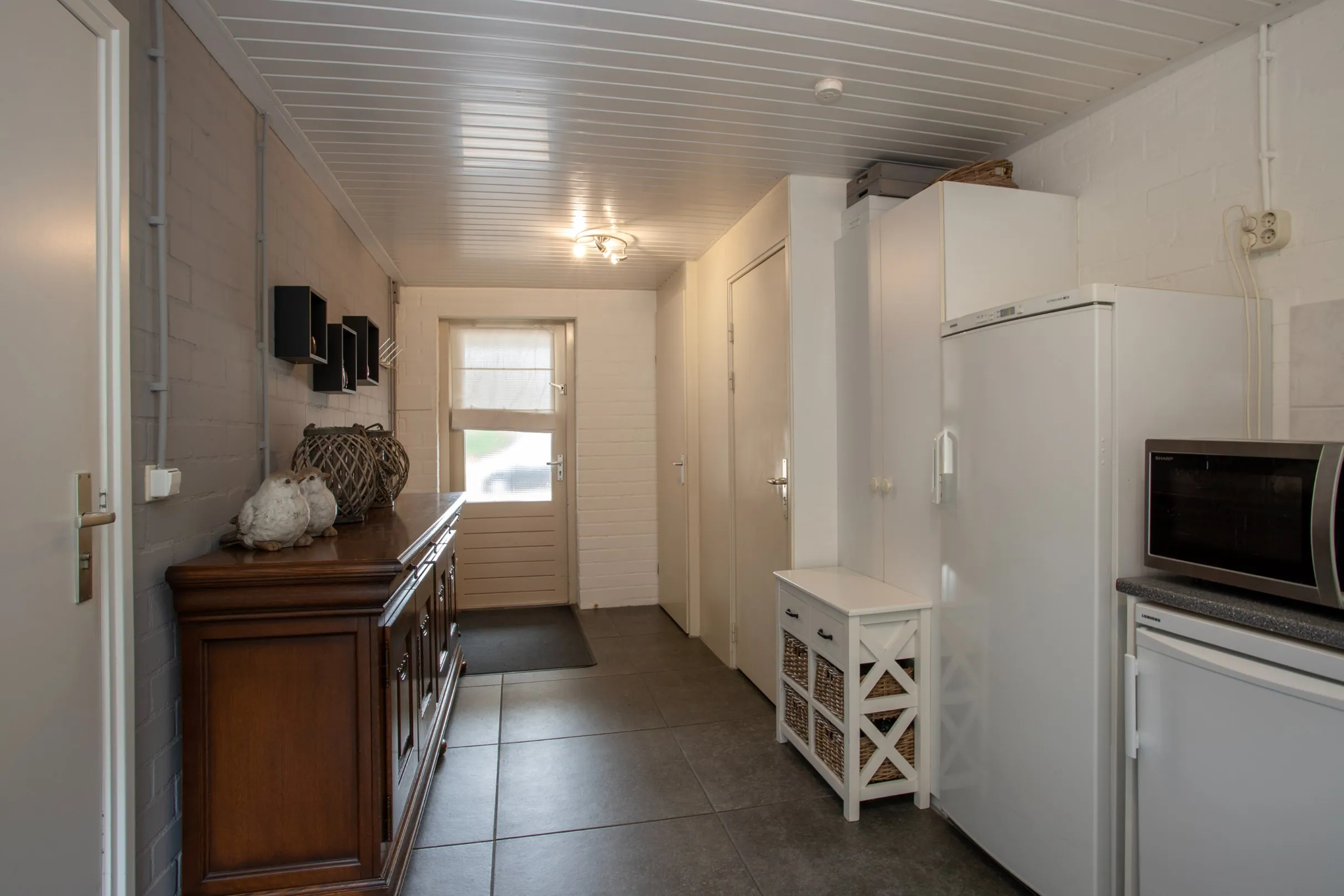 Via de woonkamer is er toegang tot de bijkeuken met inbouwkast, aansluitingen voor wasmachine en droger, een werkblad met spoelbak en mengkraan, en toegang tot de tuin en carport.