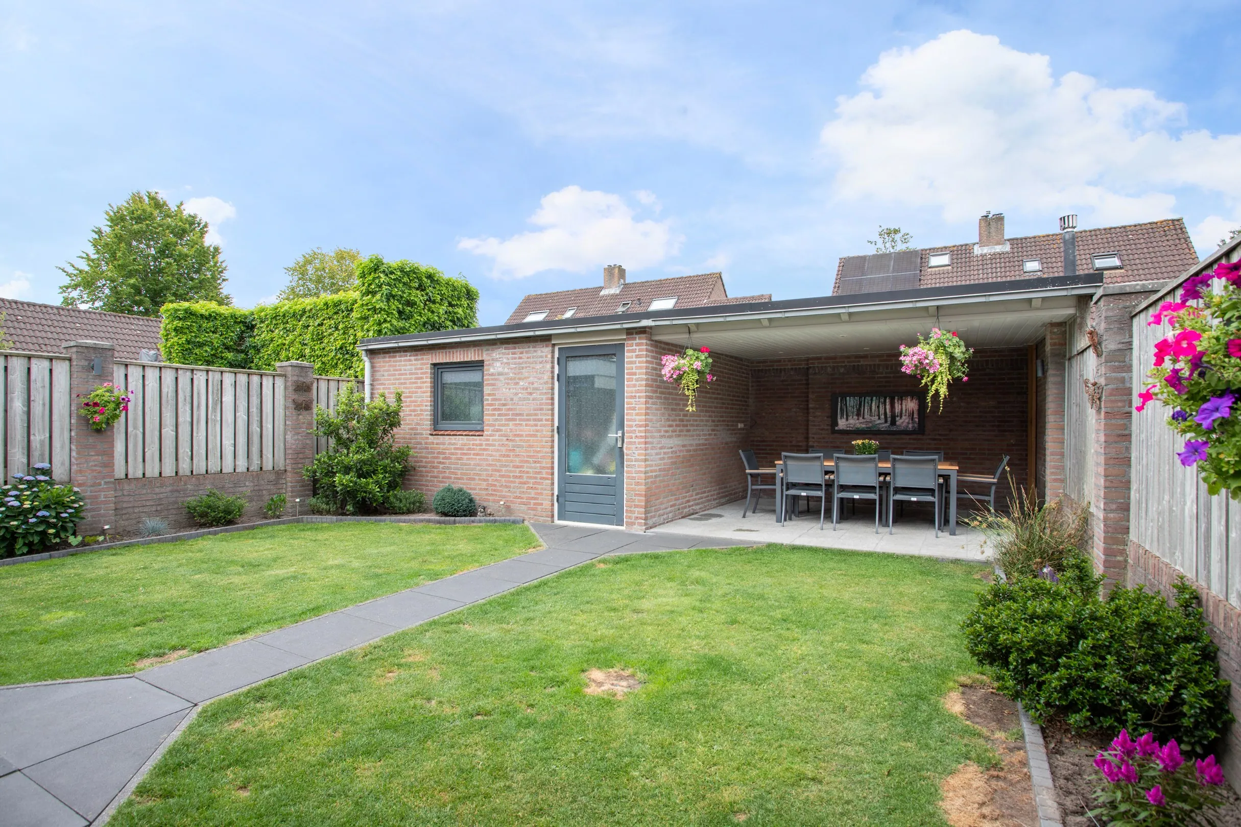 De voortuin is ingericht met vaste beplanting en een verhoogde border in het midden. Aan de voorzijde bevindt zich een eigen oprit met carport.