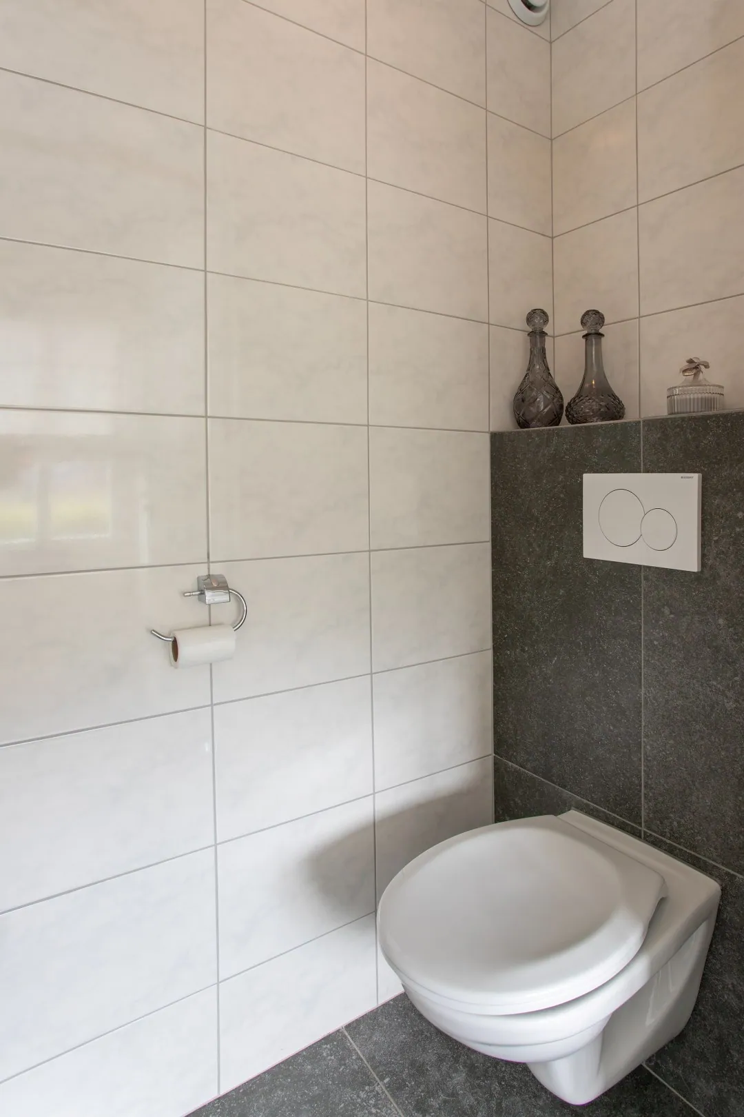 Modern betegeld toilet met wandcloset. De hal biedt toegang tot de woonkamer.