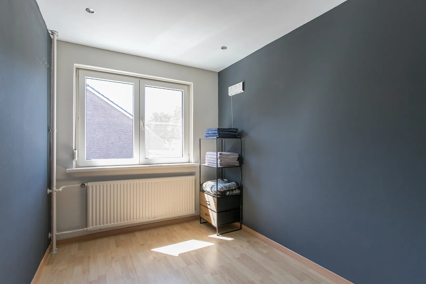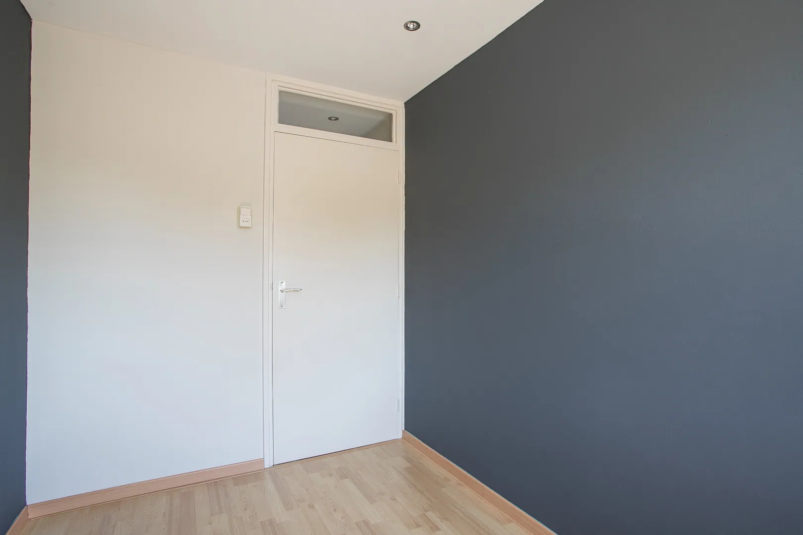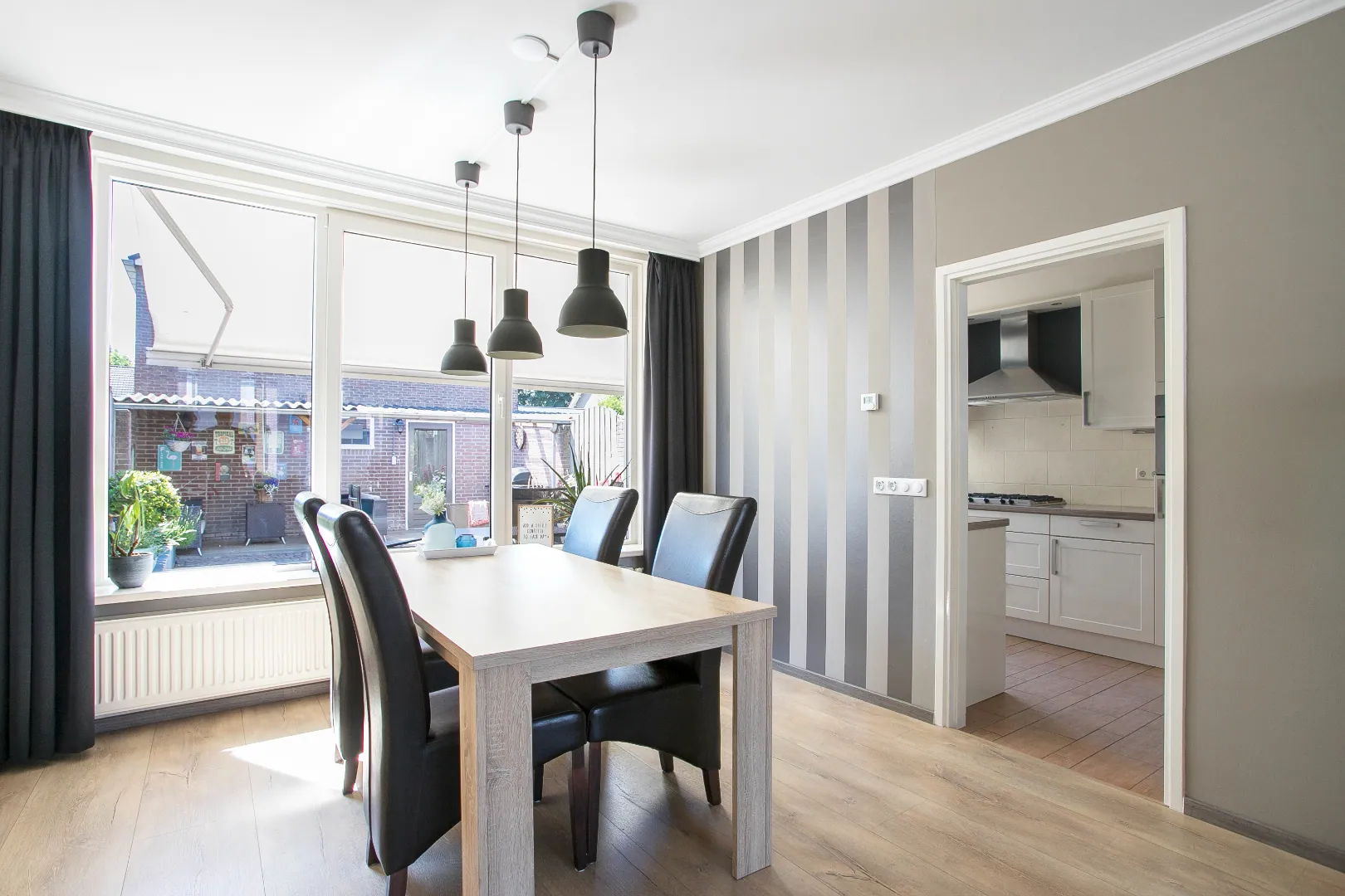 De woonkamer is een type doorzonkamer met grote raampartijen aan voor- en achterzijde. Verder een fris en moderne afwerking met laminaatvloer, stucwerkwanden en plafonds. Een gedeelte van een wand is voorzien van behang.