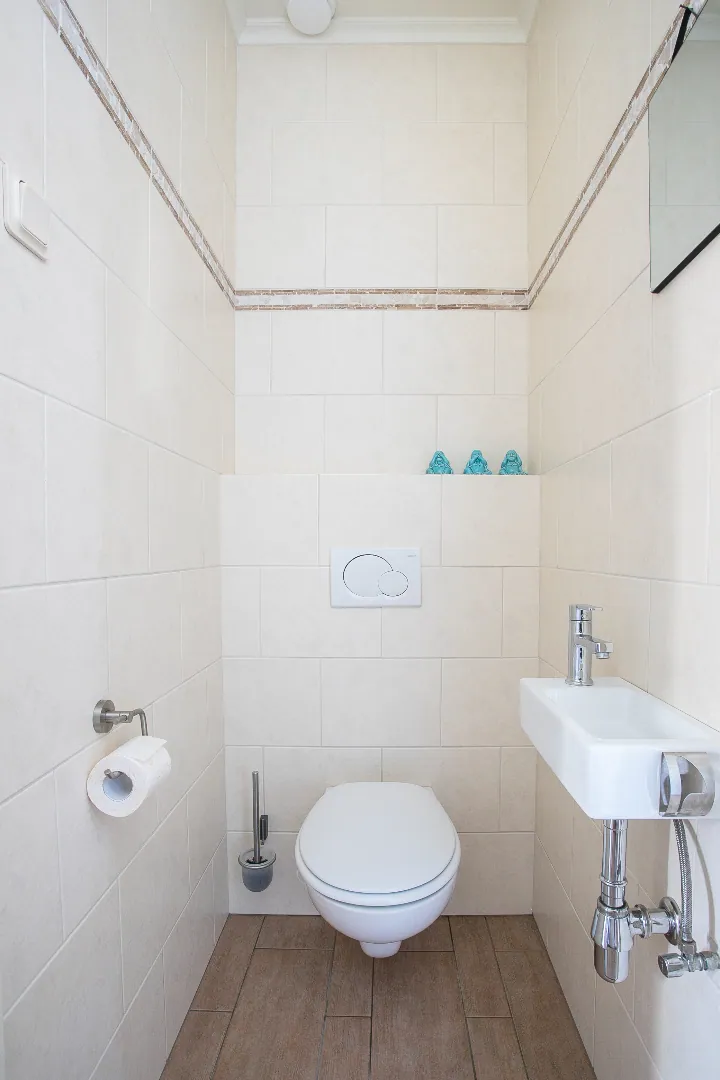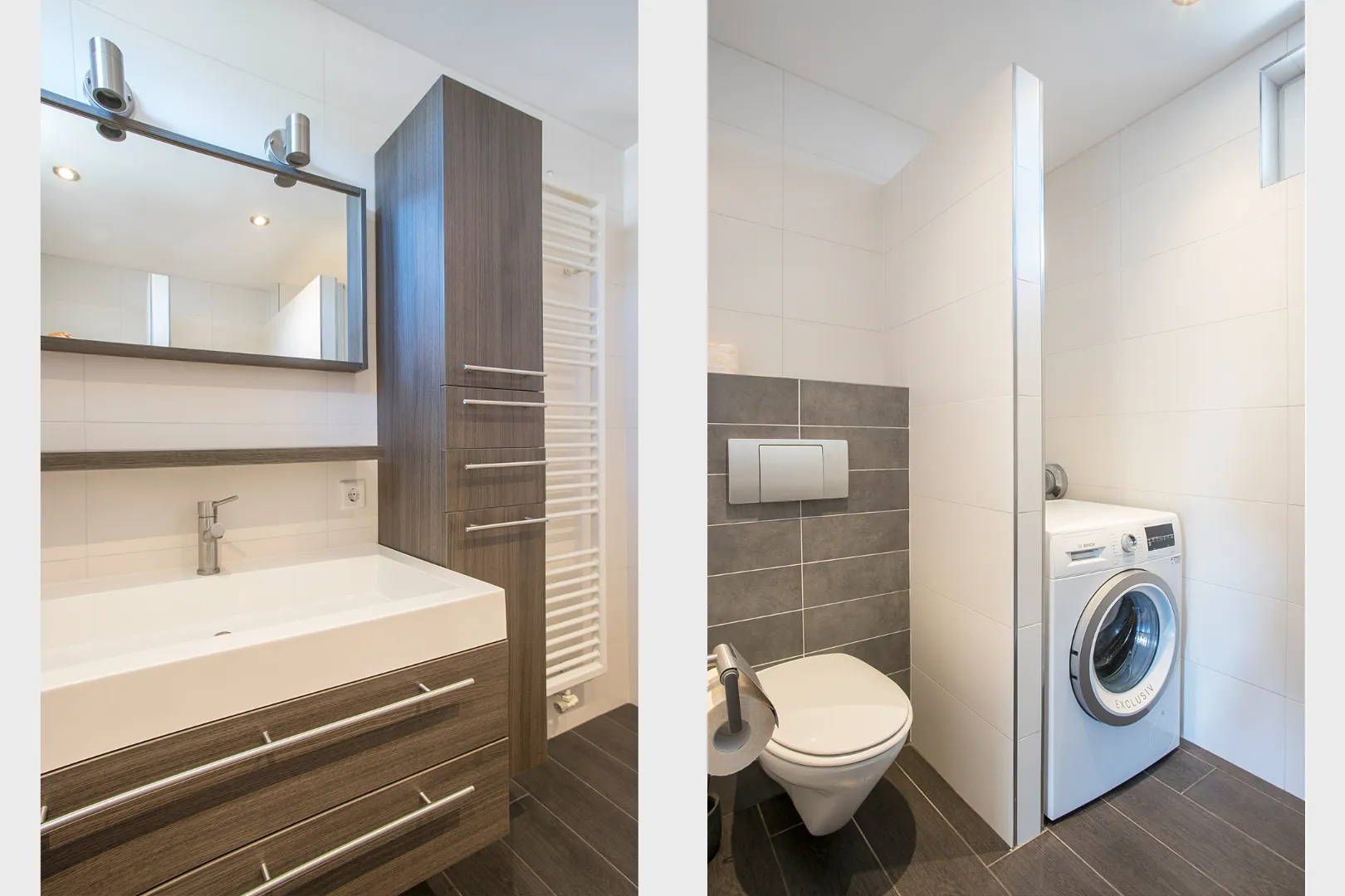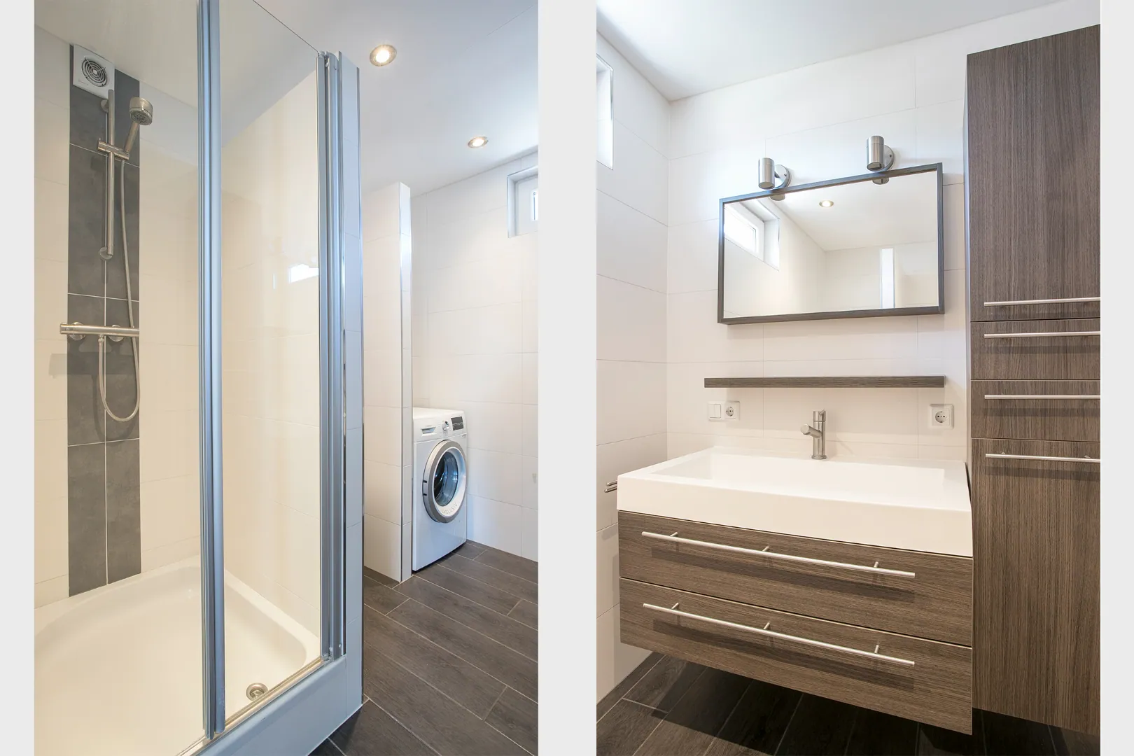 De badkamer is voorzien van fraai en modern tegelwerk welke tot het plafond doorloopt, een douchecabine, hangend toilet, wastafel en hangende kast. Verder zijn de aansluitingen voor de wasmachine en droger hier gesitueerd.