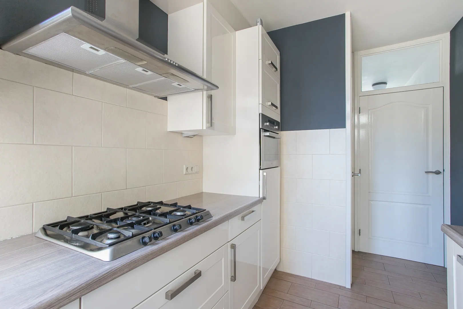 In de keuken vinden we eerst een trapkast voor de nodige bergruimte. De dichte keuken is voorzien van 5-pits gasstel met afzuigkap, combioven, vaatwasser, RVS spoelbak en voldoende werk- en bergruimte. De keuken biedt toegang tot de achtertuin en de woonkamer.