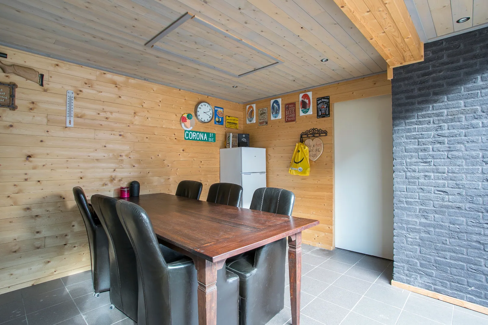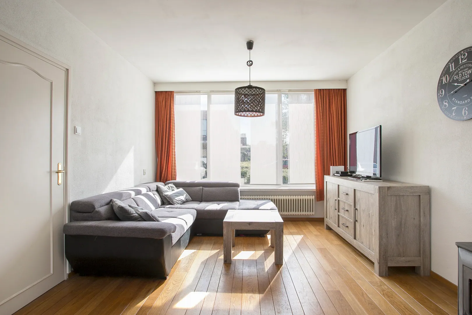 De woonkamer is een doorzonkamer met grote raampartijen aan voor- en achterzijde. Een massief eikenhoutenvloer en een houtkachel (ter overname) zorgen voor een authentieke uitstraling. Anderzijds de stucwerkwanden in combinatie met kunststof kozijnen en isolerende beglazing maken het tot een modern geheel.