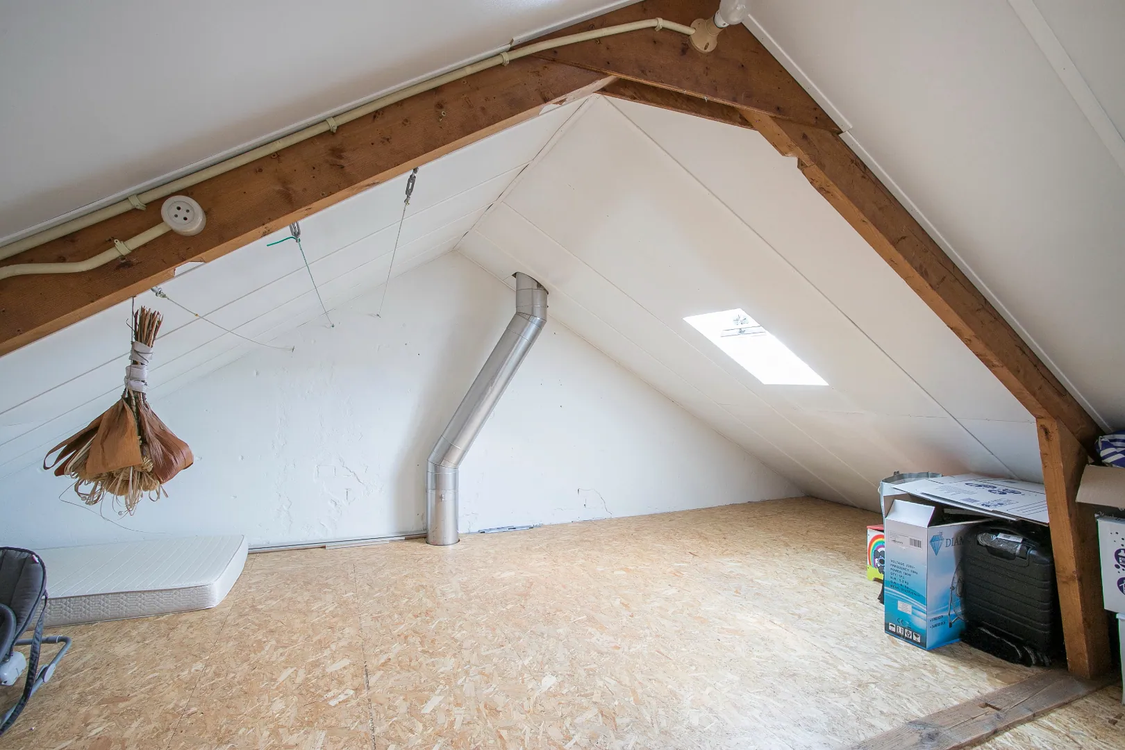Grote, geïsoleerde zolderverdieping met 2 dakramen, aansluitingen voor de wasmachine en droger en de Cv-installatie (Intergas Kompakt HRE 2015). De huidige eigenaar heeft de bovenverdieping flink aangepakt; nieuwe pannen, nieuwe dakgoot, 2 Velux dakramen geplaatst en het geheel geïsoleerd.