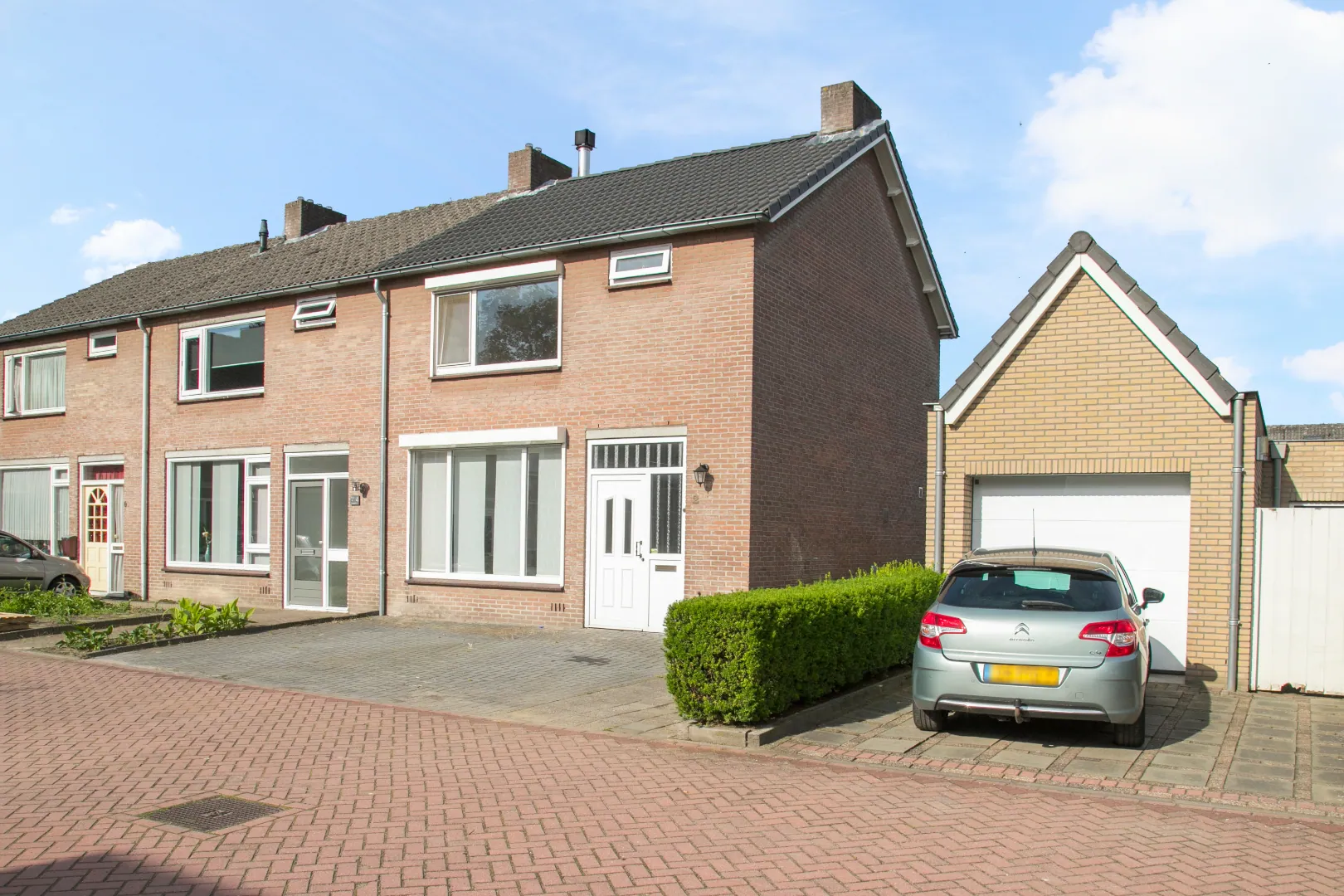 Volledig verharde voor- en achtertuin dus de tuinen zijn zo goed als onderhoudsvrij. Met het verharden van de voortuin is de mogelijkheid van parkeren op eigen terrein ontstaan. In de achtertuin is verder een buitenkraantje met schrobputje, zonneluifel en een zeer nette berging met overkapping. Deze heeft aan de voorzijde een glazen schuifpui, er staat wederom een houtkachel (blijft achter) en het geheel is modern afgewerkt. De naastgelegen berging geeft ruimte voor het plaatsen van fietsen e.d. de achtertuin is op het zuidwesten georiënteerd en kent veel zonuren.